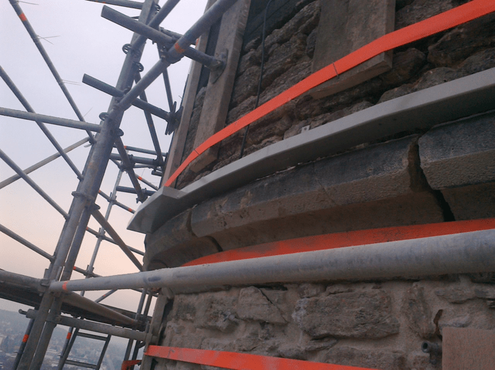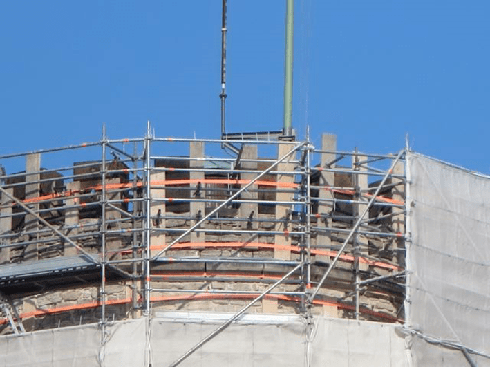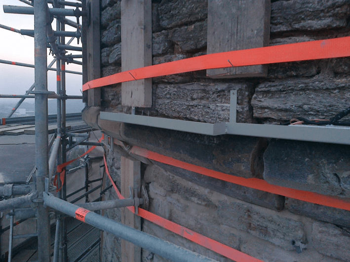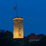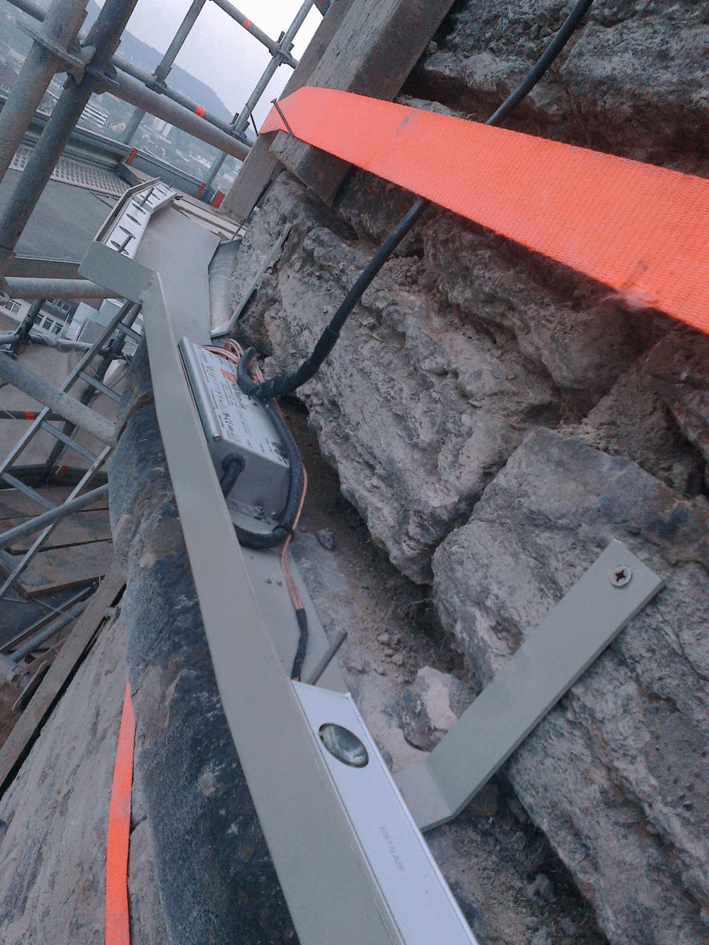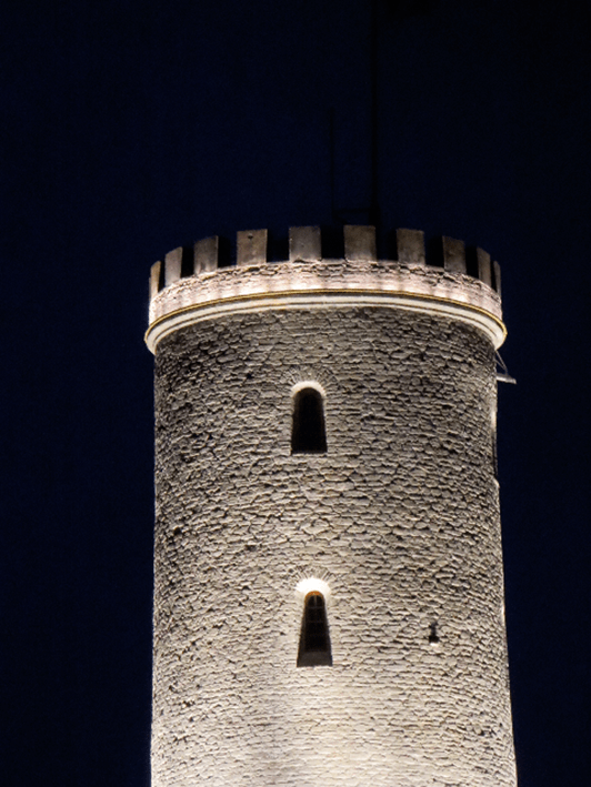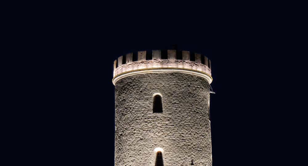 Wir strahlen die Turmzinnen an und rücken sie ins rechte Licht. Eine LED Kontur, dicht unter den Zinnen placiert, ergänzt das vorhandene Turmlicht.