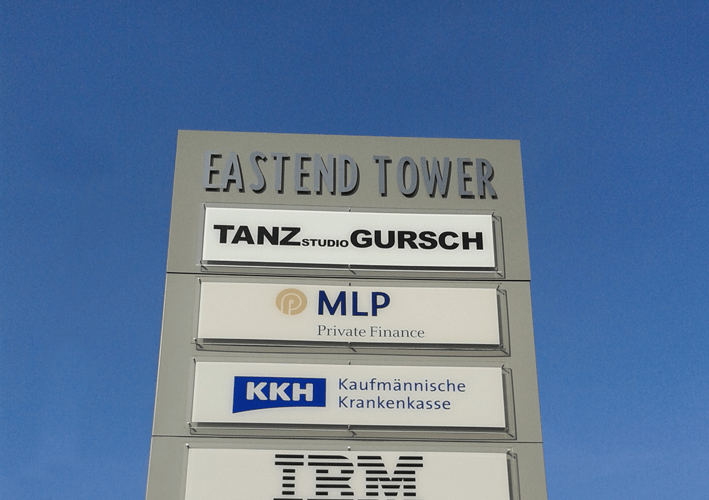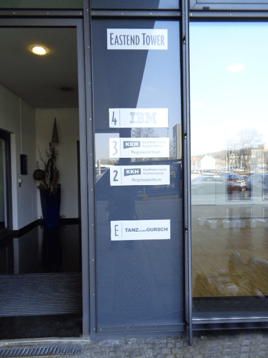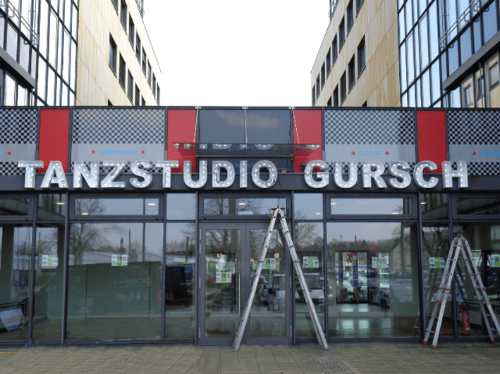 Das Tanzstudio Gursch bezog im April neue Räumlichkeiten. Am Eastendtower in Bielefeld hat man ein neues, sehr ansprechendes Domizil gefunden, dem auch die Außenwerbung und die Beschriftungen entsprechend angepasst werden musste. Von den beleuchteten Einzelbuchstaben mit sehr dezenter Konstruktion über sämtliche Beschriftungen der Wegweisung im Haus bis hin zu der Beschriftung der bauseitig vohandenen Pylone haben wir ein rundes Konzept für das Tanzstudio Gursch realisiert. Insgesamt war unser Kunde hochzufrieden, da wir ihm auch alle organisatorischen Aufgaben wie z.B. Bauantrag, Elektrozuleitung etc. abgenommen haben.