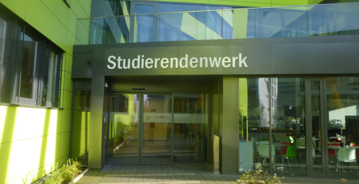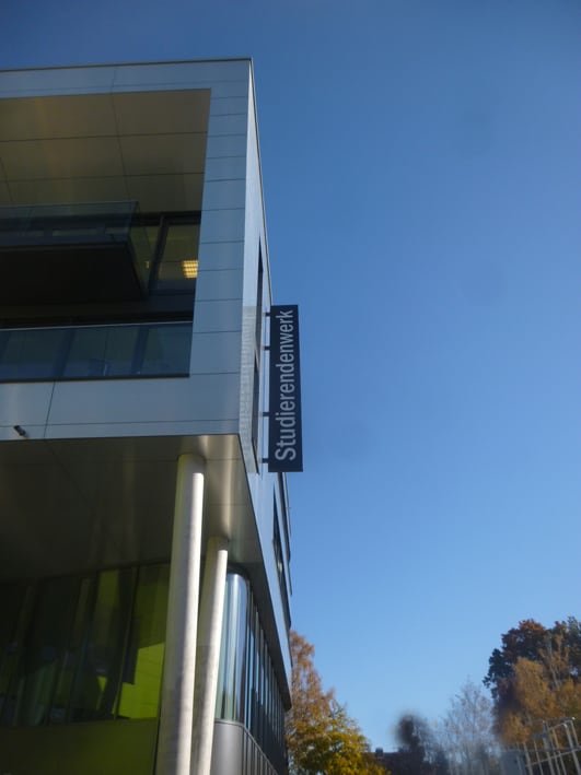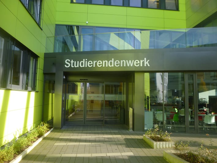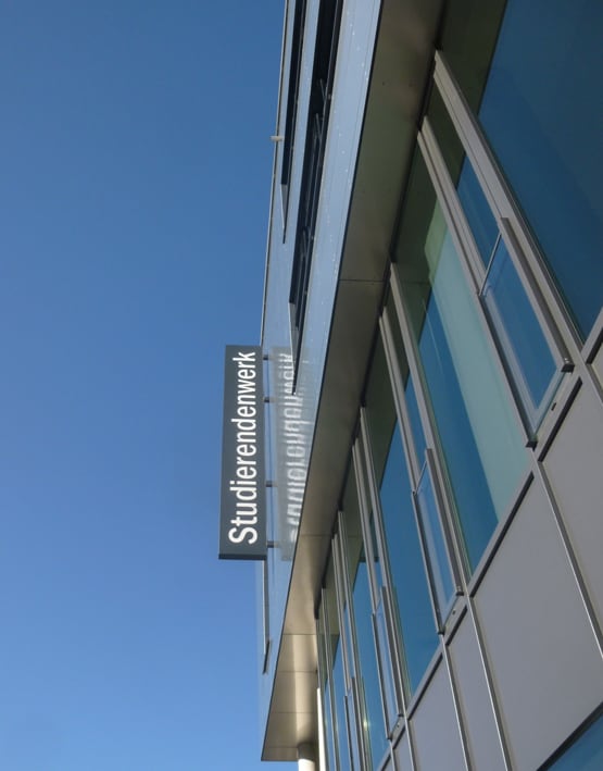 Produktion und Montage von Einzelbuchstaben für den Eingang, sowie Ausstecker für die Fassade des Studierendenwerks Bielefeld.