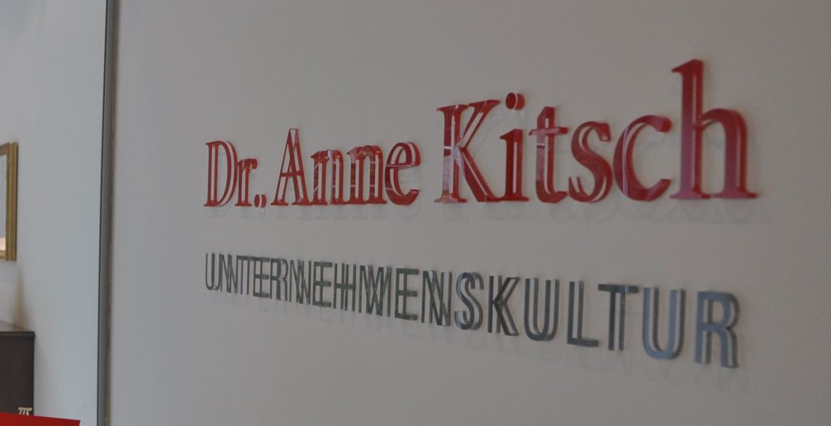 Schriftzug in Einzelbuchstaben aus 10mm starkem, klarem Acrylglas mit polierten Kanten. Rückseitig kaschiert mit roter und grauer Hochleistungsfolie. Befestigung mit doppelseitigem Klebeband.