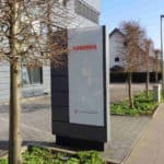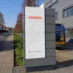 Beschriftungsänderung eines von Infographik gebauten Pylons: Aufgesetzte Acrylglasscheibe mit rückseitiger weißer Folie und frontseitigen Folienplots.