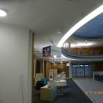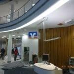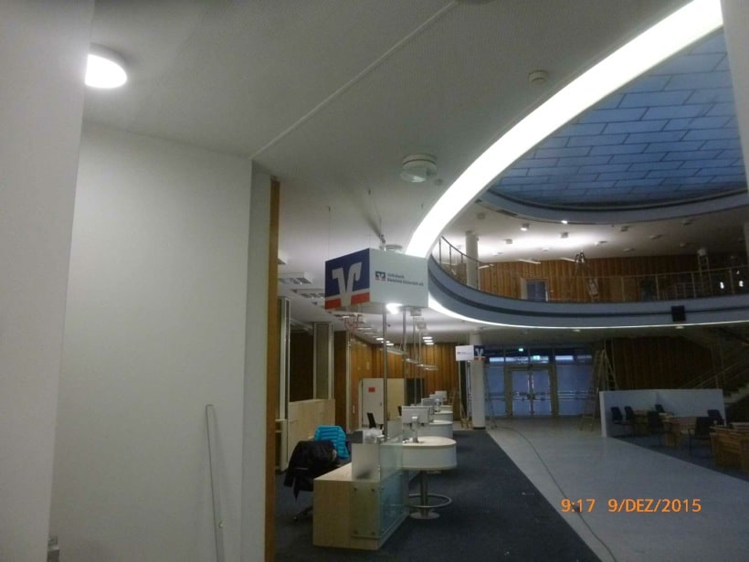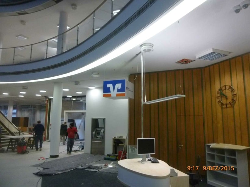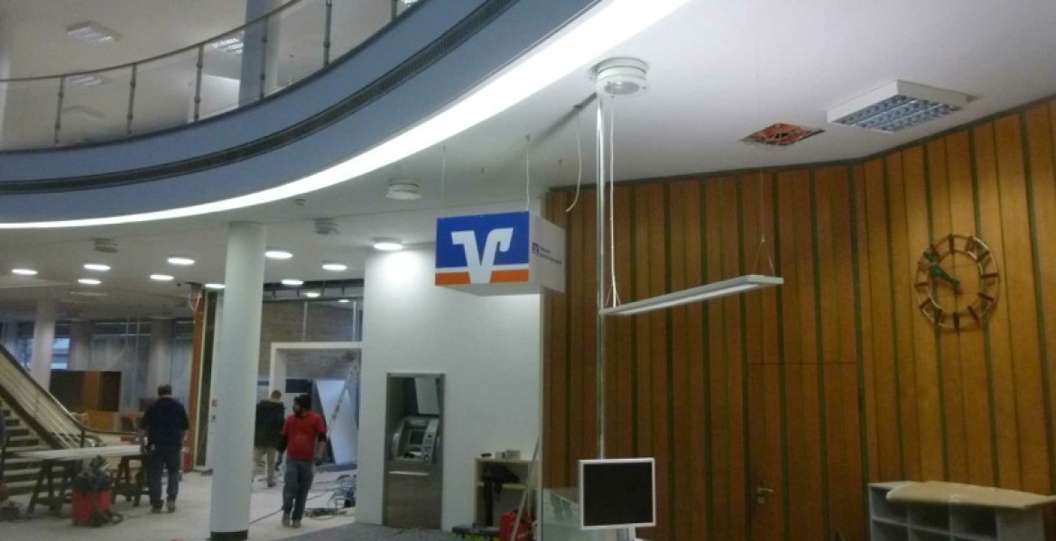 Aufgrund des Gemeinschaftsraumes haben wir die Volksbank Beratungsplätze jeweils an den Enden mit gehängten, selbstleuchtenden Deckenquadern versehen. Damit kann der Kunde sich gut orientieren. Des Weiteren im SB-Bereich die Relation eines Leuchtlogos, in Form von Einzelbuchstaben, in Flachprofil-Ausführung. Lichttechnik zur Kantenbeleuchtung.