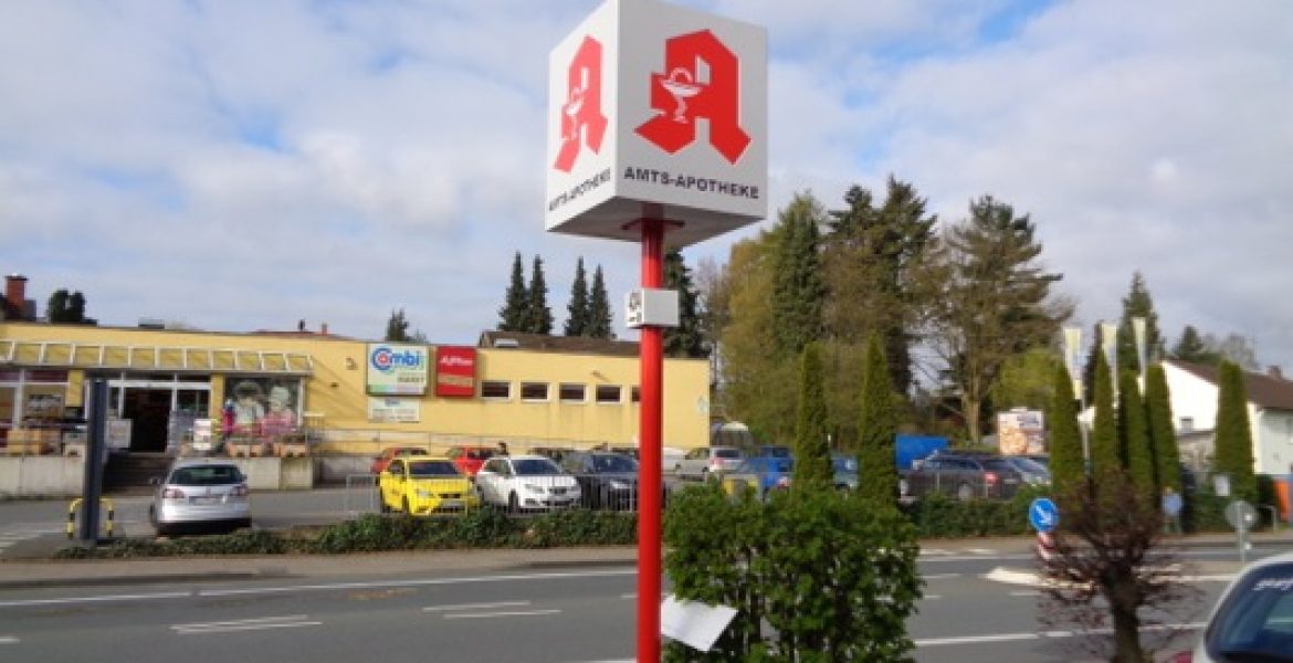 Hochwertige vierseitig leuchtende Werbeanlage in Quaderform, mit LED Ausleuchtung. Apotheken Embleme und Schriftzug “ AMTS-APOTHEKE “ gelasert und mittels Acrylglas plan hinterlegt. Ausleuchtung durch hochwertige,… Weiterlesen