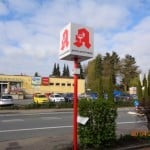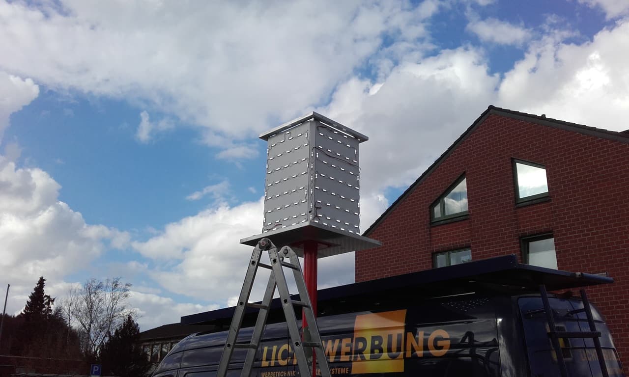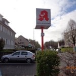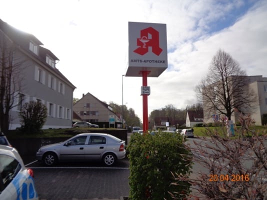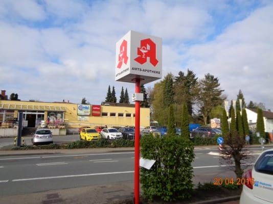 Hochwertige vierseitig leuchtende Werbeanlage in Quaderform, mit LED Ausleuchtung. Apotheken Embleme und Schriftzug “ AMTS-APOTHEKE “ gelasert und mittels Acrylglas plan hinterlegt. Ausleuchtung durch hochwertige, sparsame und langlebige LED.