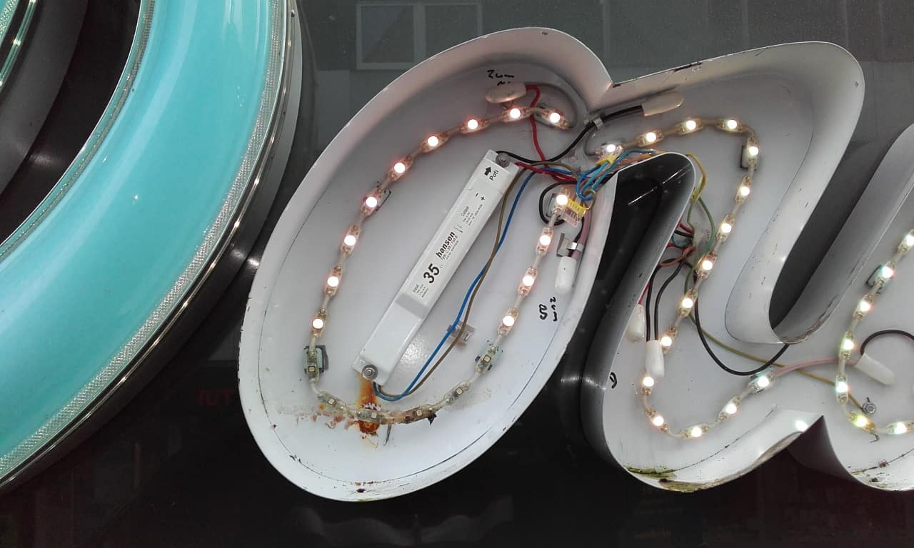 Einzelleuchtschriftzug repariert, hier waren Hansen LED im Einsatz, die wir kurzfristig besorgten und somit unserem Kunden nach längerem Ausfall die Werbeanlage schnell instand bringen konnten.