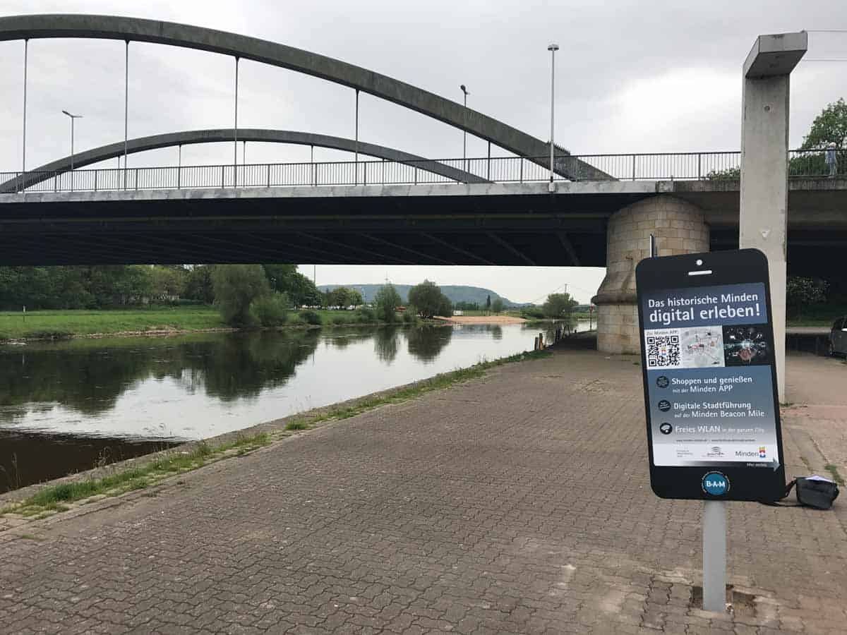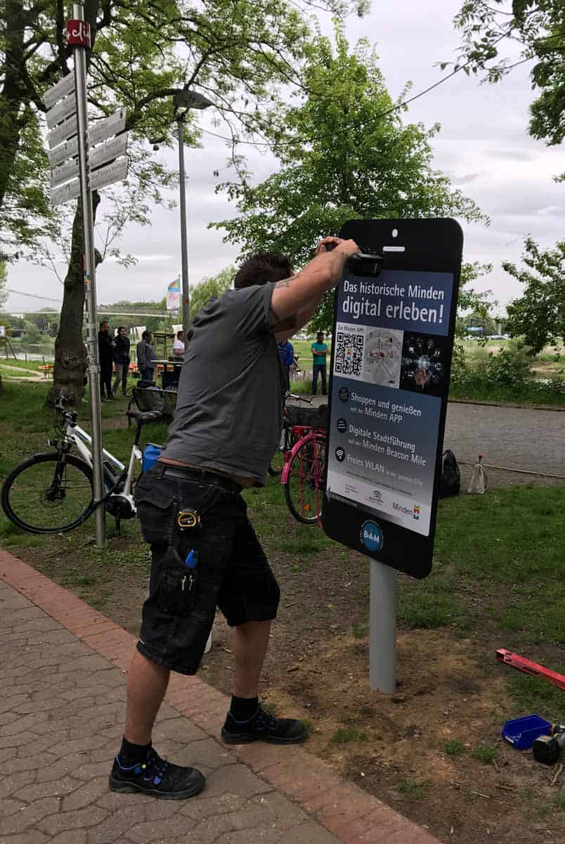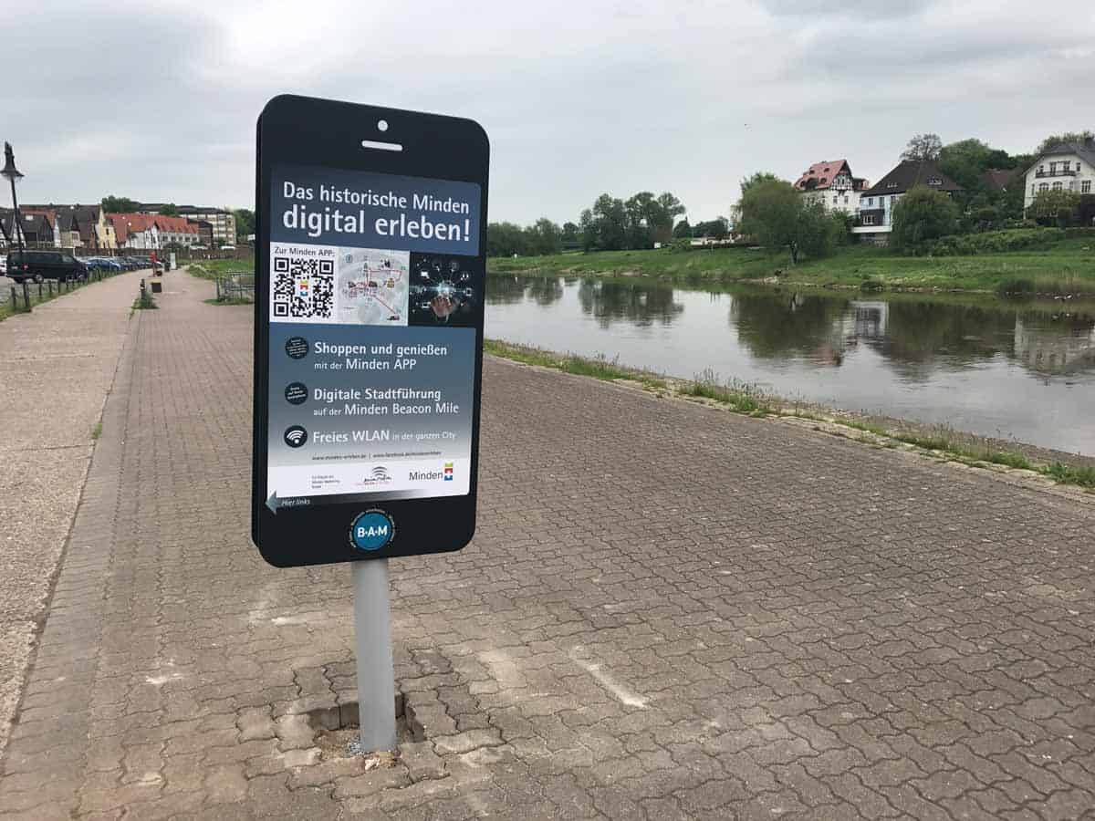 An sechs Standorten haben wir in Zusammenarbeit mit der Stadtmarketing Minden Hinweisschilder in Smartphone-Optik aufgestellt. Deren Aufgabe ist es, Radfahrer auf das digitale Angebot der Stadt aufmerksam zu machen.
