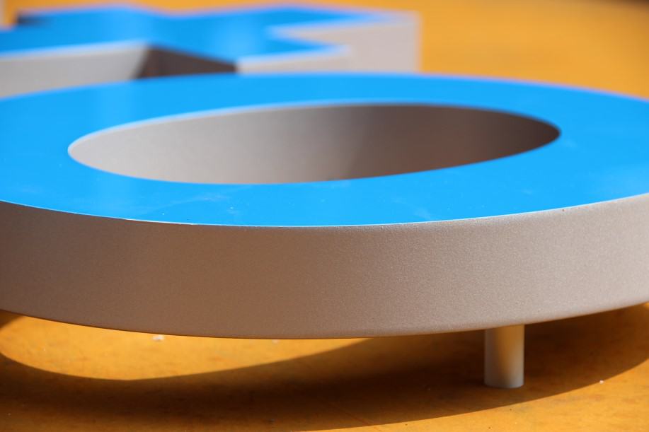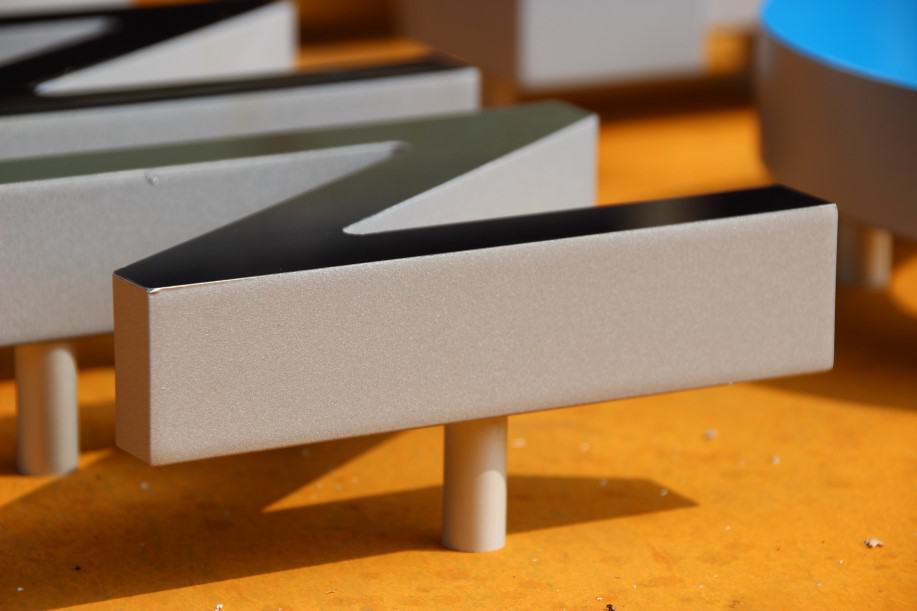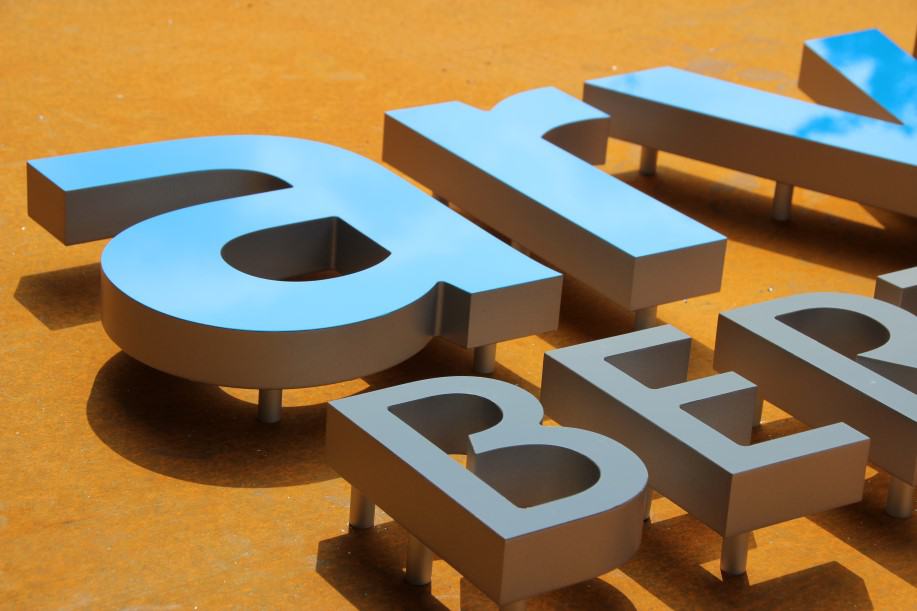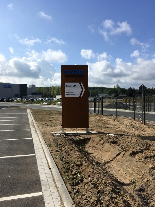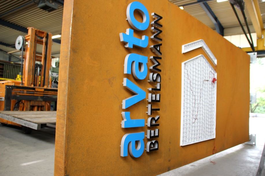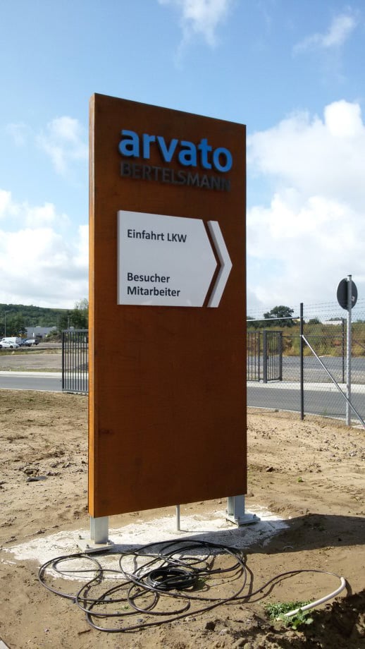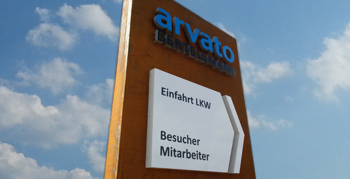Gefertigt wurden die Pylone aus 5 mm starken Stahlblechen, die zur schnellen Verwitterung sandgestrahlt wurden. Die Pylone sind einseitig leuchtend und mit aufgesetzten, frontleuchtenden Flachbuchstaben versehen. Der Buchstabenspiegel ‚arvato‘ wurde aus blauem Acrylglas gefertigt, der Schriftzug ‚Bertelsmann‘ aus black&white-Material. Die Transparente in Pfeilform wurden sehr flach (60 mm) im Profil 8 aus weißem Acrylglas hergestellt. Die Ausleuchtung erfolgt durch sparsame, hocheffiziente, weiße LED.
