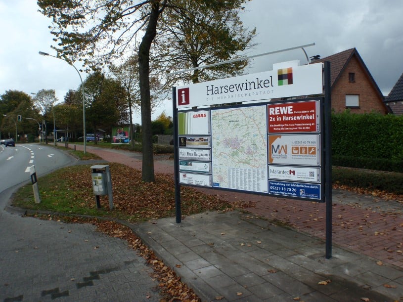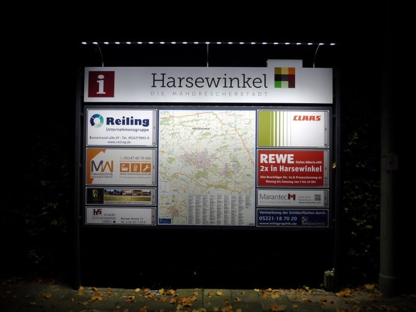 Gefertigt im neuen Produktdesign, ausgestattet mit dem aktuellen Stadtplan der Großgemeinde Harsewinkel und Firmenhinweisen. Durch eine LED-Schiene effizient und hell angestrahlt, wirken die Anlagen auch zur Abend- und Nachtzeit optimal.