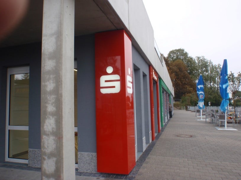Das Logo ‚S‘ und der Schriftzug ‚Sparkasse‘ wurden aus der Metallfläche gelasert und mit 10 mm weiß opalen Acrylglaskernen, verklebt auf einer Trägerplatte, nach vorn durchgesteckt.