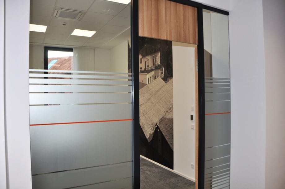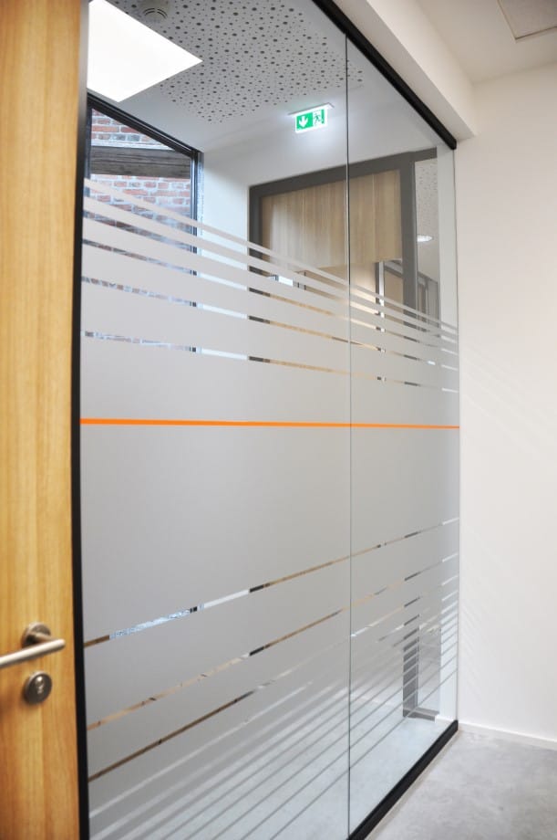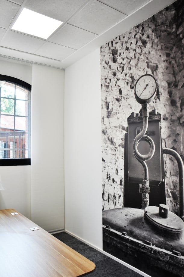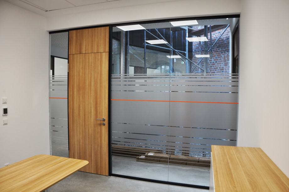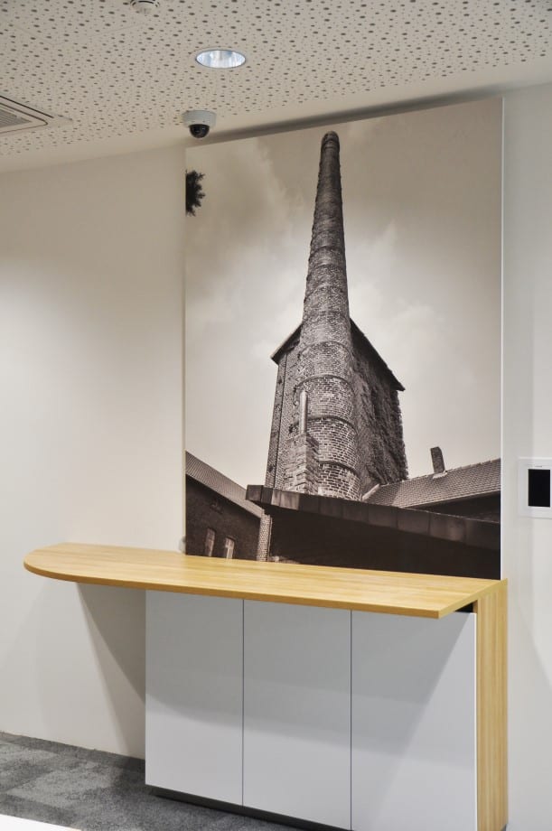 Für den neuen Standort der Volksbank Bielefeld-Gütersloh in Isselhorst, im ehemaligen Brennereihof Elmendorf, haben wir in verschiedenen Büroräumen, Beraterzimmern und im Aufenthaltsraum Fototapeten mit historischen Motiven aus der alten Brennerei bedruckt und montiert. Außerdem wurden die Beraterräume und etliche weitere Räume mit Glasdekorfolie versehen, um auf der einen Seite Sichtschutz zu schaffen und andererseits eine gewisse Transparenz nicht zu verlieren. Um dem Ganzen eine persönliche Note zu geben, wurde zusätzlich ein orangefarbiger Streifen montiert.