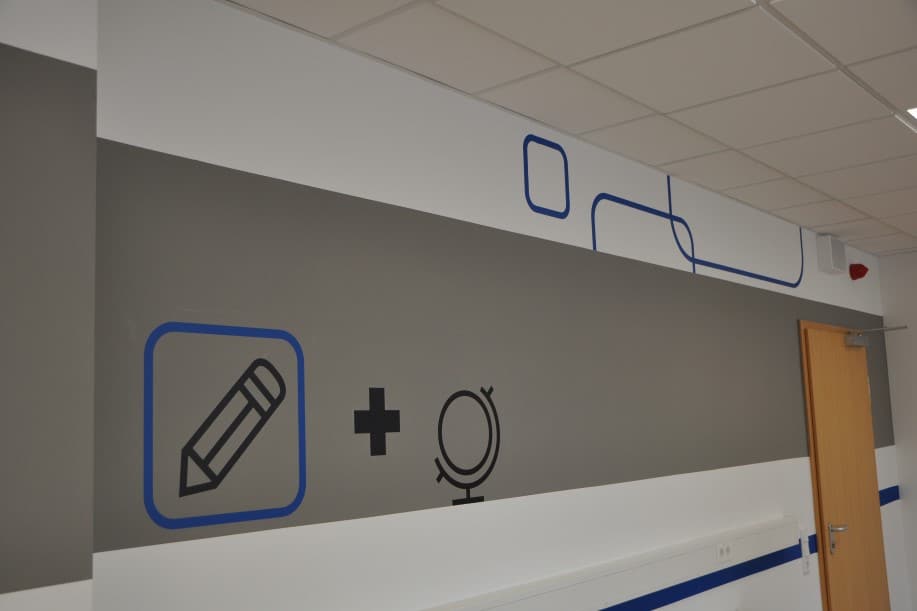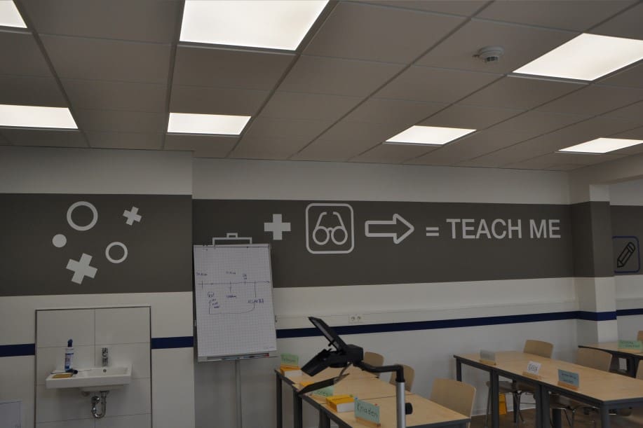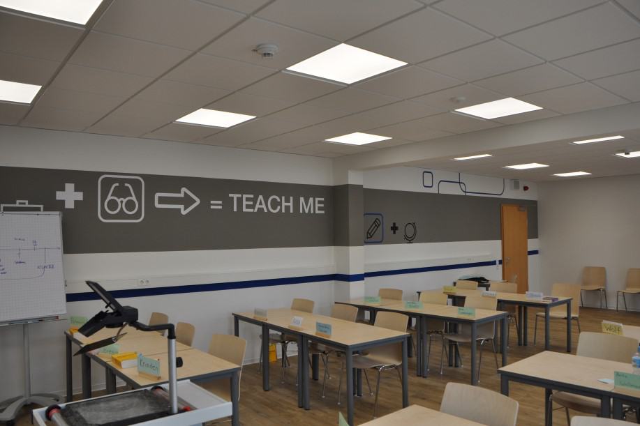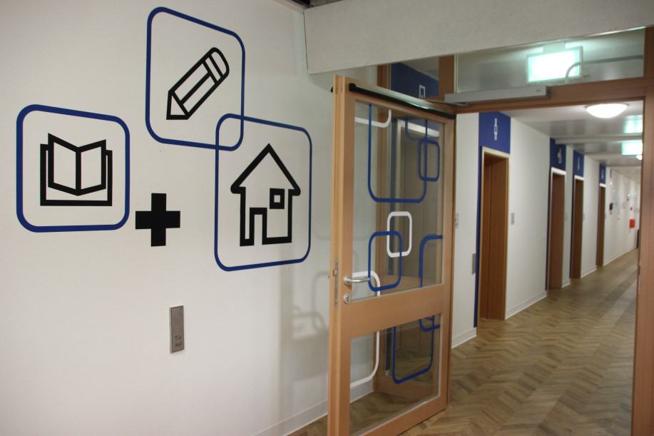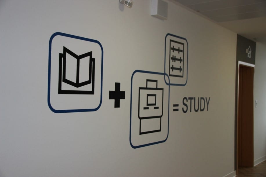 Das Gelände der einstigen britischen Wentworth-Kaserne wurde in einen BildungsCampus umgewandelt. Anfang September war es soweit. Im Gebäudetrakt A (auf dem Foto oben, vorderes Gebäude) ist eine Fachhochschule untergebracht. Dort haben wir in Zusammenarbeit mit einer ortsansässigen Kreativ-Agentur die Innenraumbeschilderung ausgeführt. Dazu zählen die Beschilderung und Grafik der Lehrsäle, Büroräume, Apartments, Bibliothek, Poststelle, WC-Räume, Flure, Treppenhaus etc.