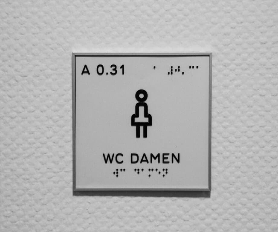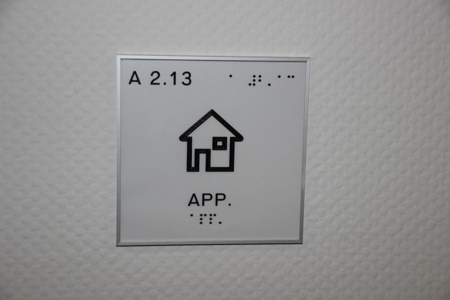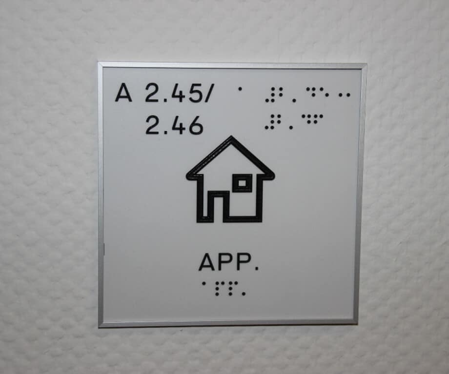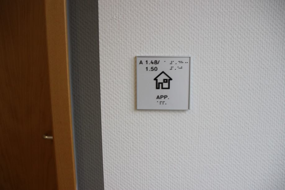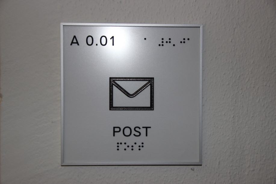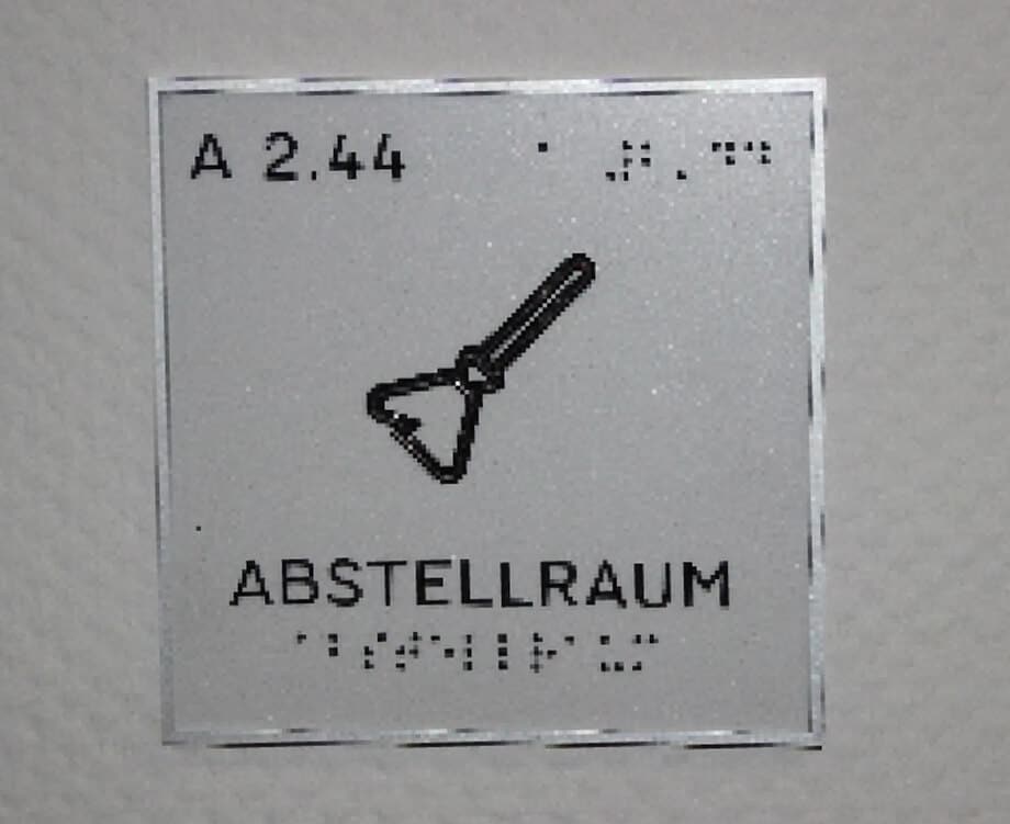 Die Schilder im Format 150 x 150 mm haben abgerundete Ecken mit einem Radius von 3 cm, Tiefe 6 mm, nach oben zu öffnen zum einfachen Austausch von Papiereinlegern. Der Rahmen ist silber eloxiert. Rückwand mit Bohrungen, inkl. Abstandshalter ca. 10 mm zur Befestigung. Abdeckung durch eine klare, entspiegelte Acrylfläche inkl. Braille- und Profilschriften nach den DIN Richtlinien. Insgesamt wurden von uns 131 Schilder montiert.