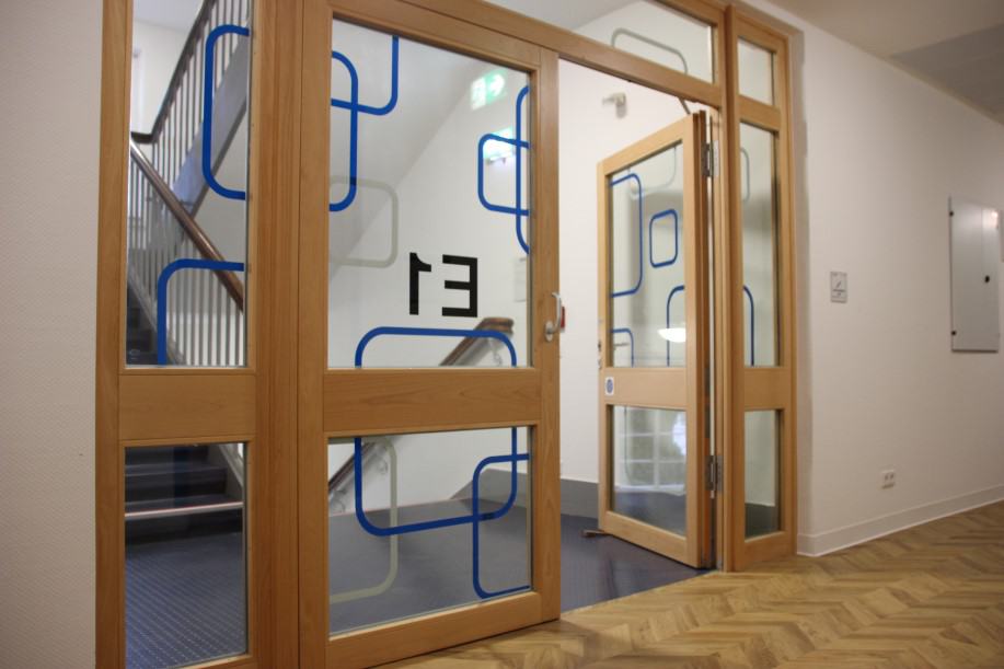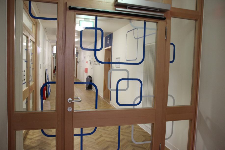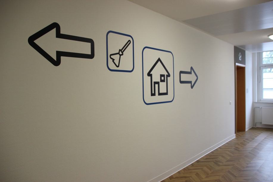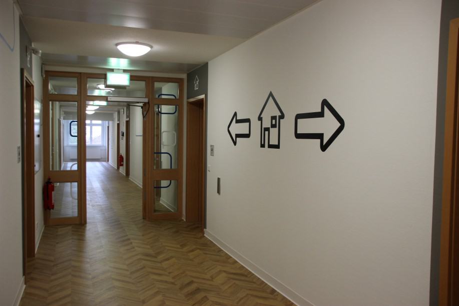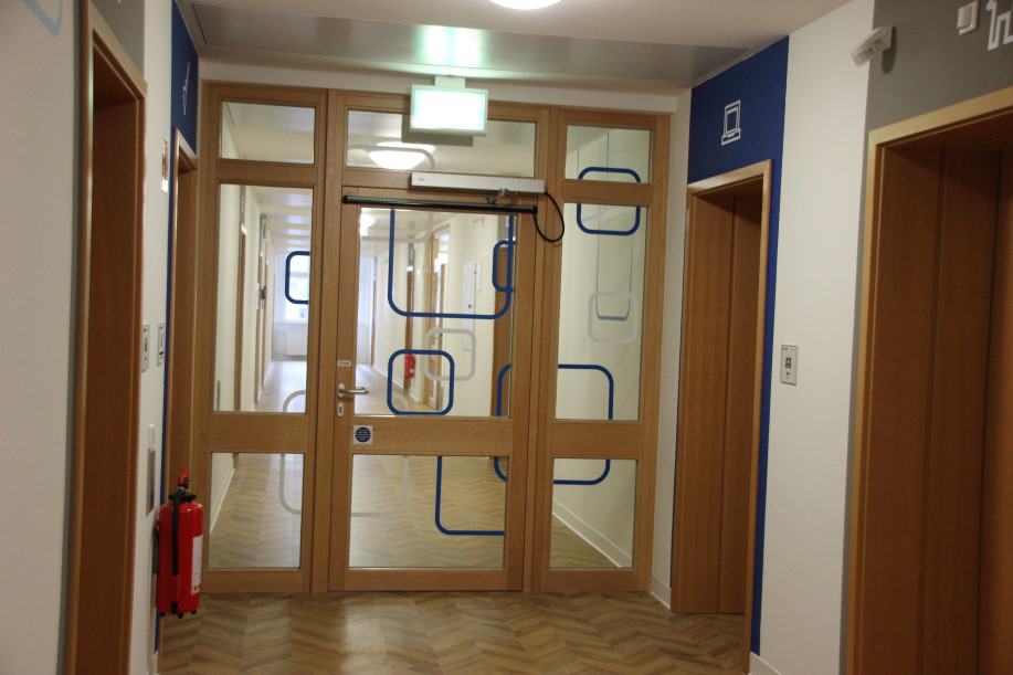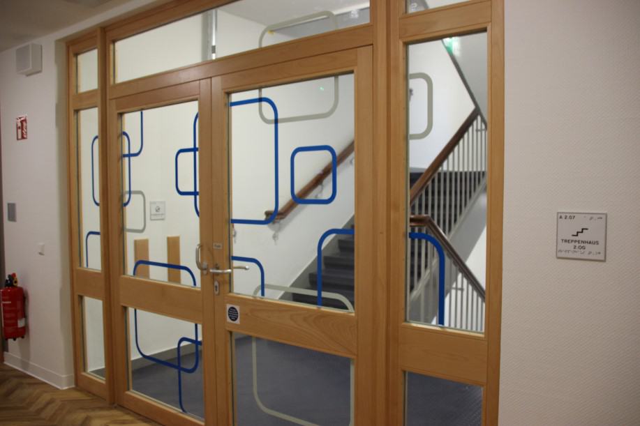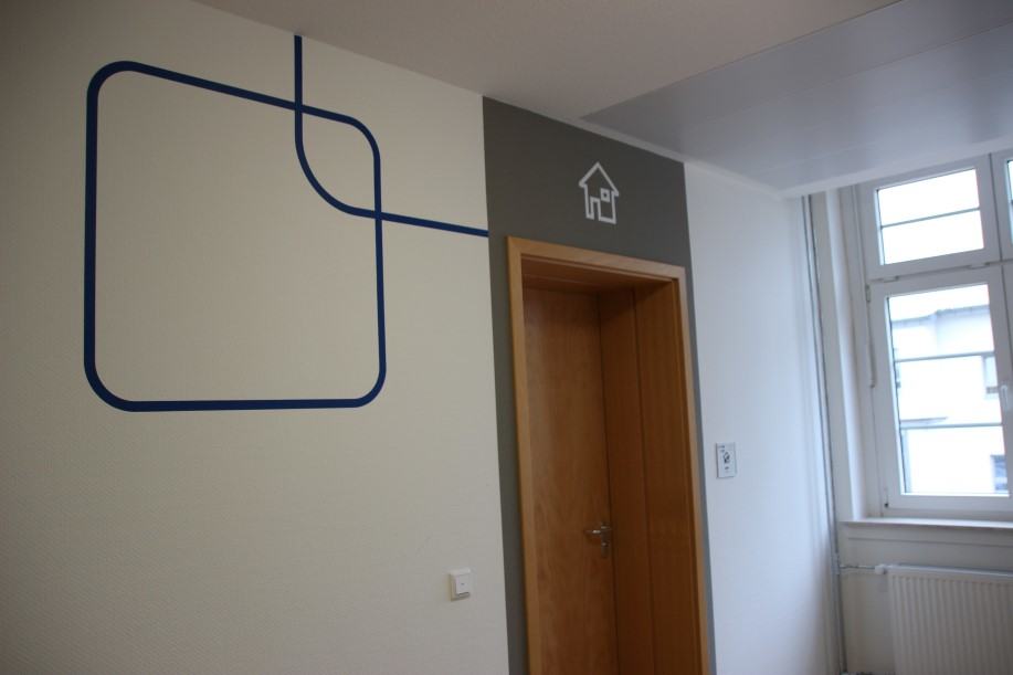 Außerdem wurden Treppenstufenmarkierungen für Menschen mit Sehbehinderungen angebracht sowie taktile Beschriftungen, die von Sehbehinderten besser erkannt und von Blinden ertastet werden können. Die Wandtattoos sowie die immmer wiederkehrende Rechteckform finden sich in allen Geschossebenen in Form und Farbe wieder, wodurch ein einheitliches Gesamtbild entsteht.