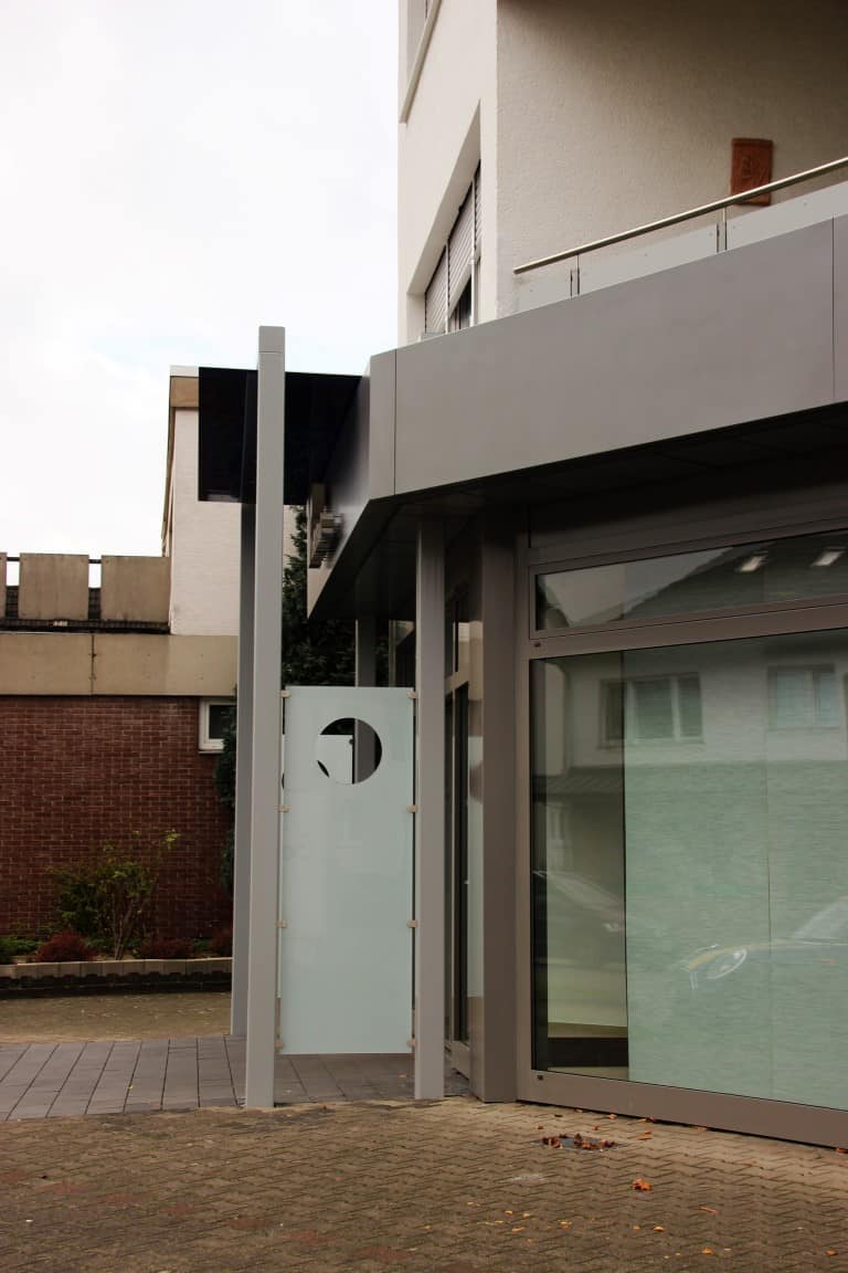 Um den Eingangsbereich wurde zusätzlich ein Glasdach errichtet, das mittels 2 Portalrahmen aus Stahl gehalten wird. Für das Dach wurde VSG-TVG-Sicherheitsglas verwendet, blau getönt. Auch die Seitenscheiben im Bereich der Tür wurden aus VSG-Glas mit einer Zwischentönung und einem kreisrunden Ausschnitt gefertigt und mittels spezieller Edelstahlhalter stabil und nach statischen Erfordernissen befestigt. Als besonderer Clou haben wir zusätzlich LED-Linien zur indirekten Beleuchtung der Glaselemente installiert, die den gesamten Eingangsbereich als harmonische Einheit leuchten lassen.