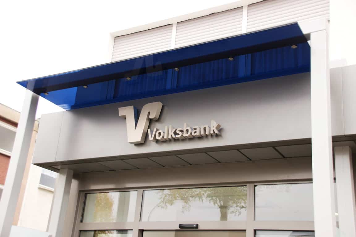 Oberhalb der Fensterreihe wurde die ca. 40 m lange Fassadenattika überarbeitet und neu verkleidet. Im Bereich des Eingangs erscheint das Volksbank-Signet als Vollreliefbuchstaben im Profil 3 – Schattenschrift – V2A gebürstet. Auf der langen Seite wurde der gesamte Schriftzug unter dem Namen „Volksbank Paderborn“ aus der Fläche gelasert und mit 10 mm starken Acrylglaskernen erhaben nach vorn durchgesteckt. Durch die eingesetzten hocheffizienten, sparsamen und langlebigen, weißen LED wurde auch den heutigen ökologischen Standards entsprochen.