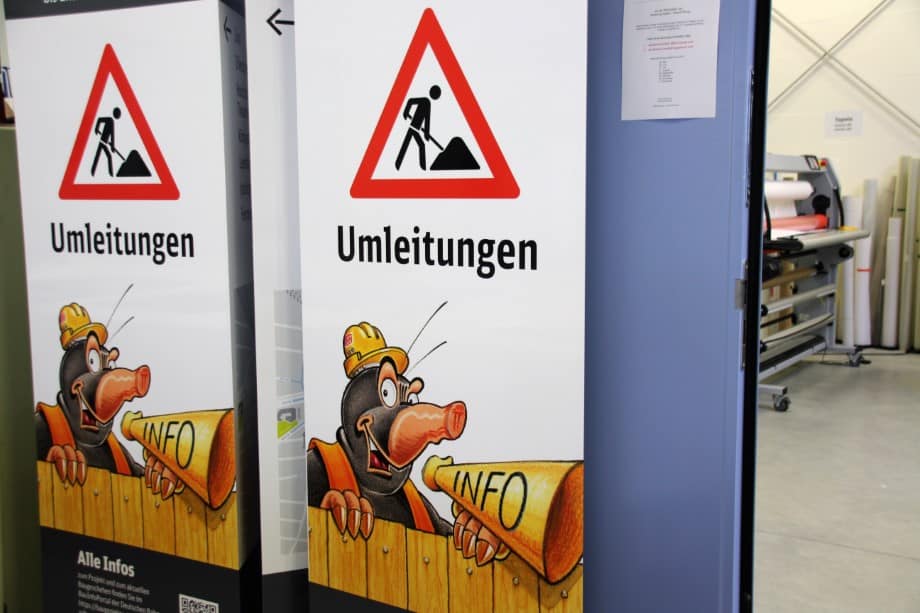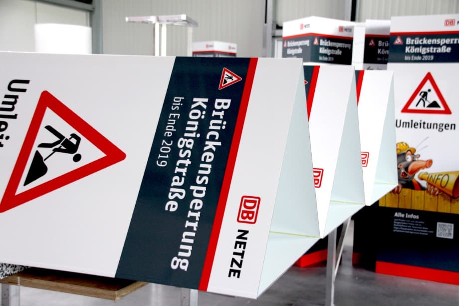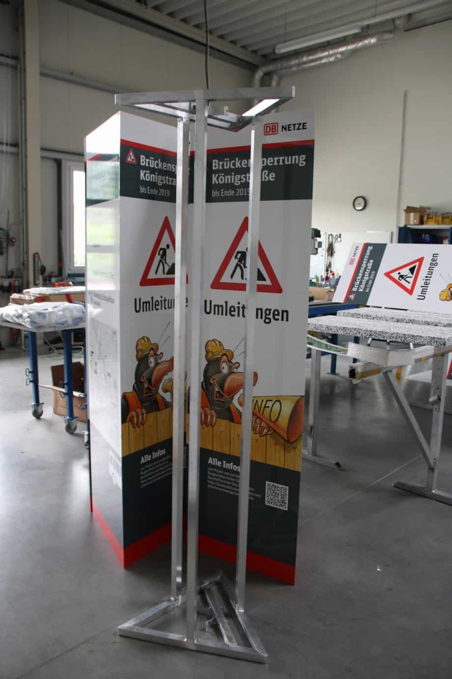 Auf Grund unserer großen Erfahrung in der Erstellung solcher Leitsysteme im öffentlichen Verkehrsraum war der Auftrag für uns wie maßgeschneidert. Die Stelen wurden in 3-Eckform gefertigt und sind somit von 3 Seiten sichtbar. Sie wurden komplett in unseren Werkstätten u.a. mittels Fräse und Kanttechnik gefertigt, in unserer Beschriftungsabteilung wurden die entsprechenden Digitaldrucke erstellt. Nach Erstellung der Fundamente erfolgte dann die Kür: einen Tag vor der Sperrung der Verkehrswege haben wir die Stelen an den geplanten Standorten aufgestellt.