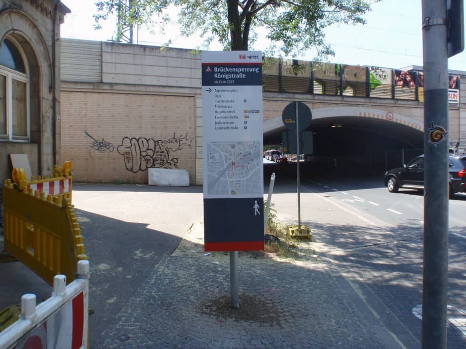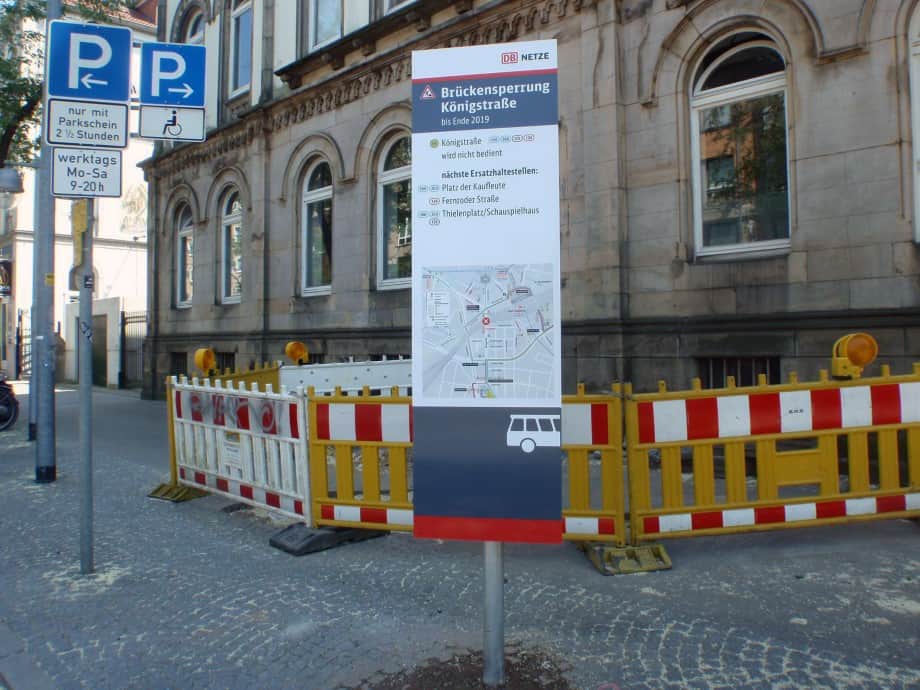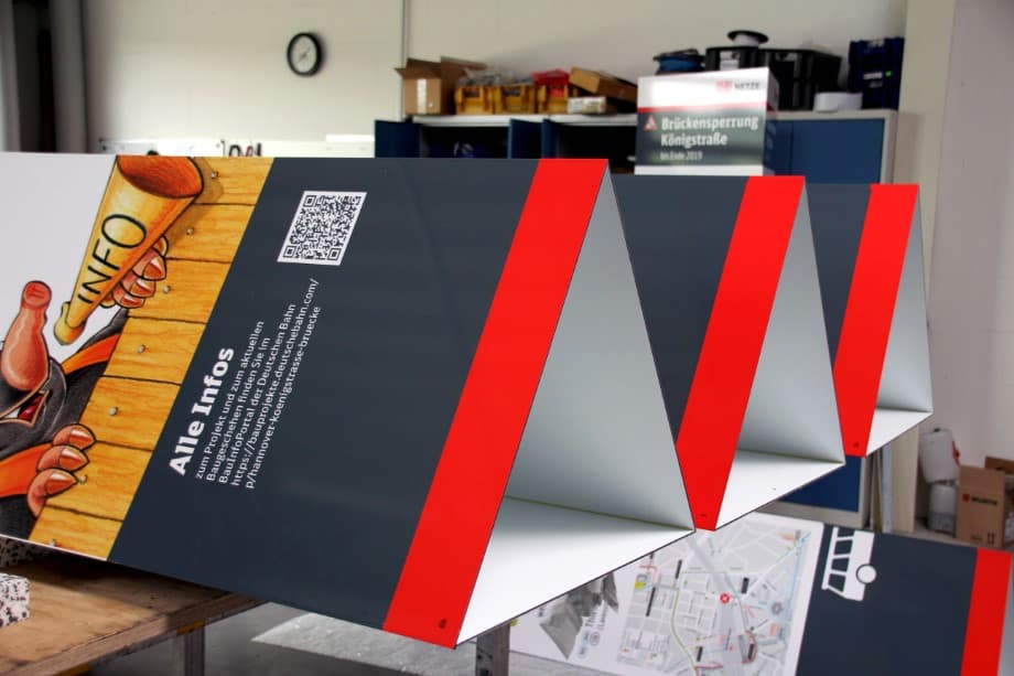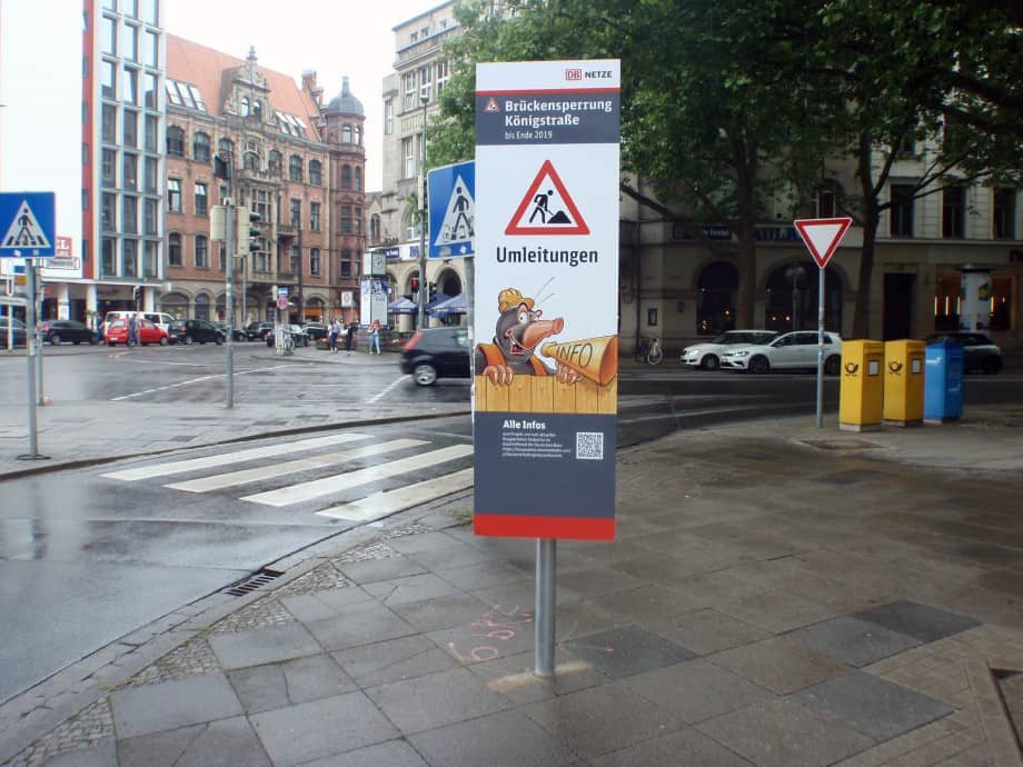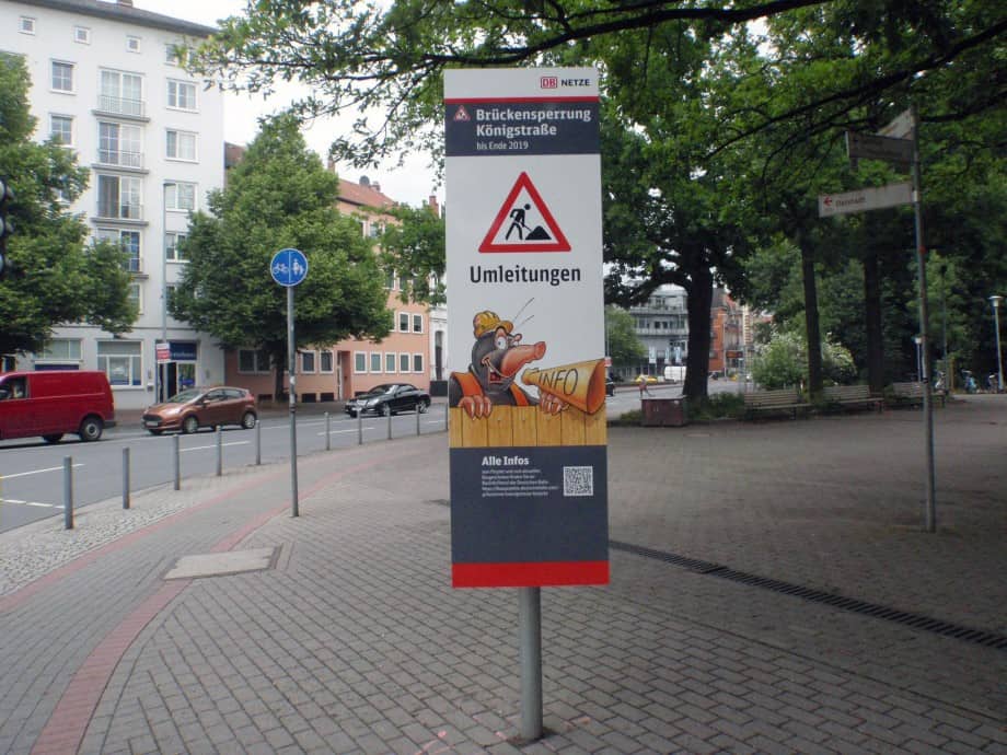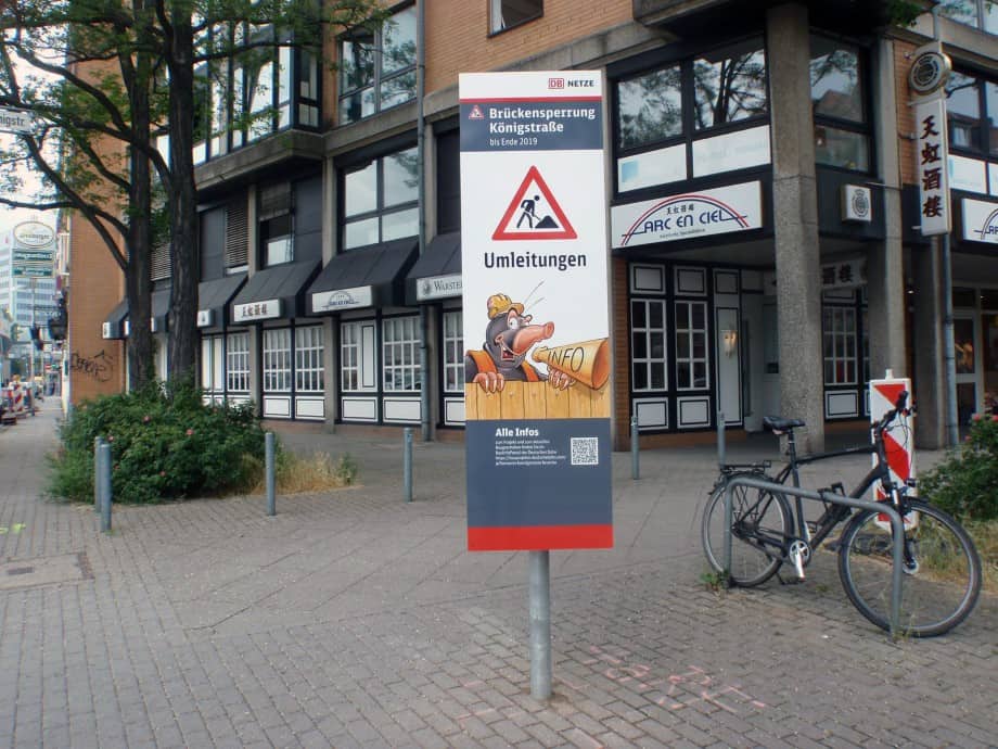 Durch die Baumaßnahmen mussten verschiedene Straßen komplett gesperrt werden. Dies hatte zur Folge, dass der komplette Fußgänger-, Radfahrer- und Busverkehr inkl. Haltestellen in diesem Bereich umgeleitet werden musste. Um die ortskundigen Bürger hierüber zu informieren, erstellten wir 10 Informationsstelen, die an ausgesuchten Standorten ihren Platz finden sollten.