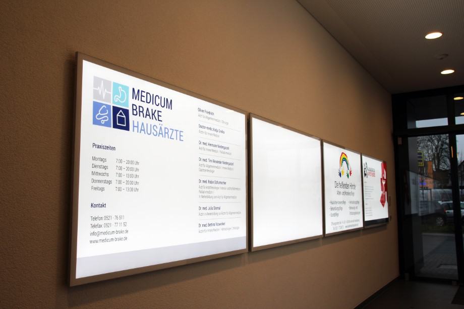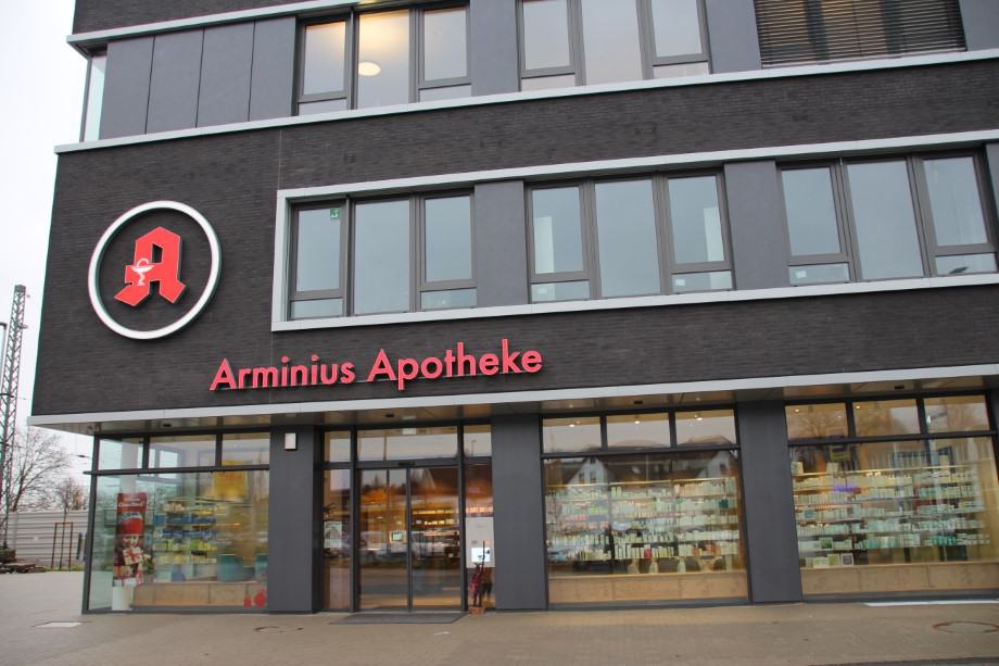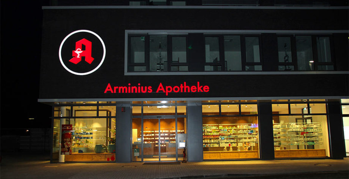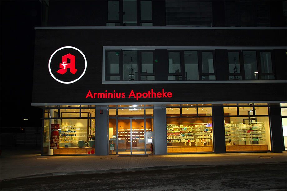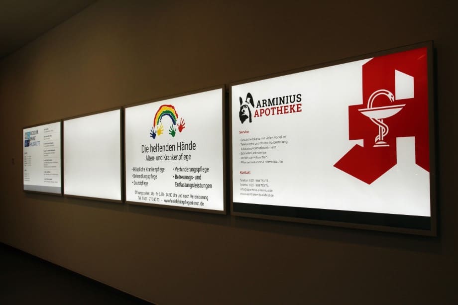 Sämtliche Beschriftungen (ausgenommen der Fa. Rossmann) wurden von uns gestaltet und ausgeführt. Für die Apotheke erstellten wir das Apotheken-„A“ sowie den Leuchtschriftzug „Arminius Apotheke“ im Profil 5. Für ein Leitsystem im Gebäude fertigten wir sehr flache Leuchtrahmen, bei denen das Medium unkompliziert und mit geringem finanziellen Aufwand gewechselt werden kann. Ein großer Vorteil insbesondere bei einer Änderung der Öffnungszeiten oder ähnlichem. Zusätzlich haben wir verschiedene Folienbeschriftungen an Glasscheiben, Möbeln und Wänden ausgeführt.