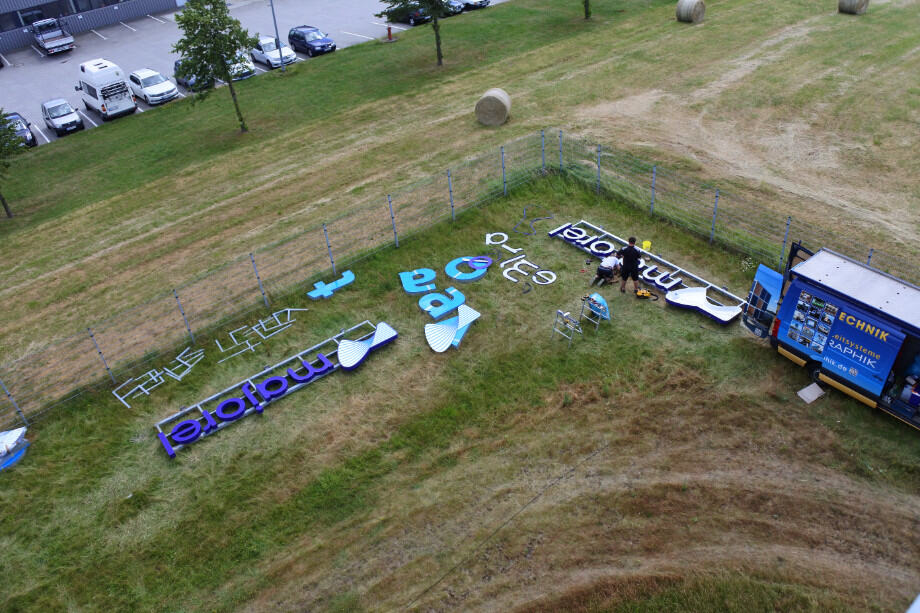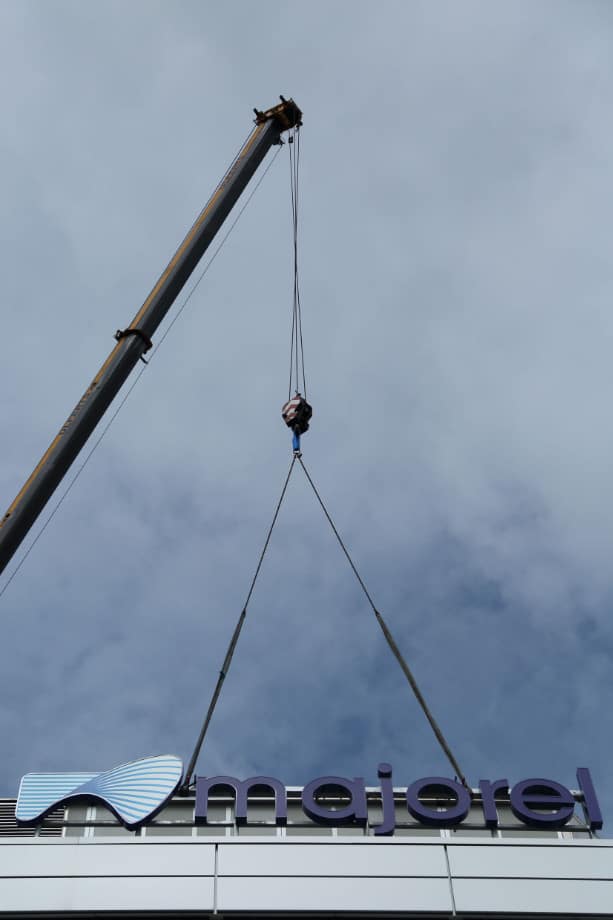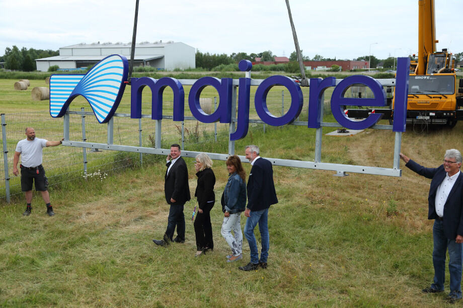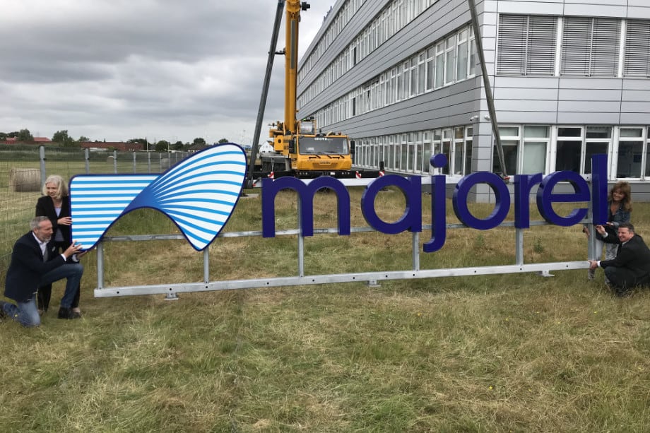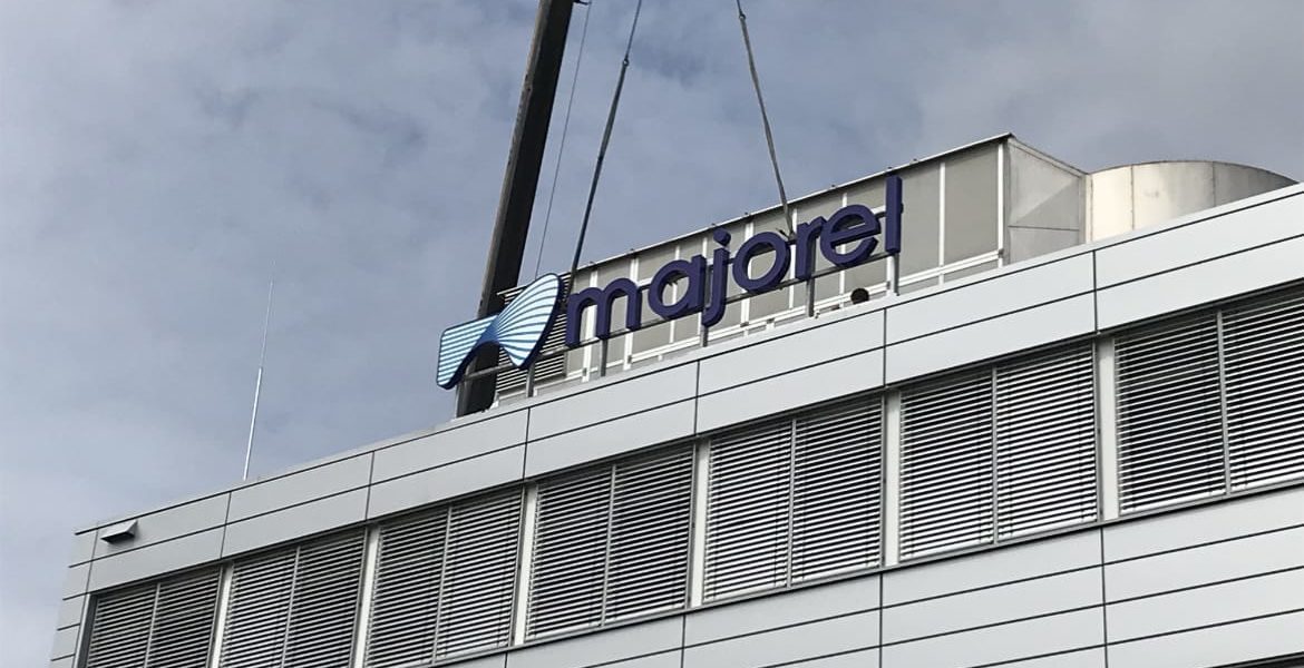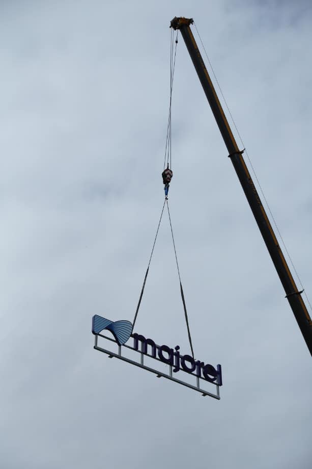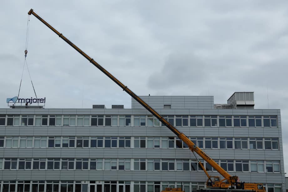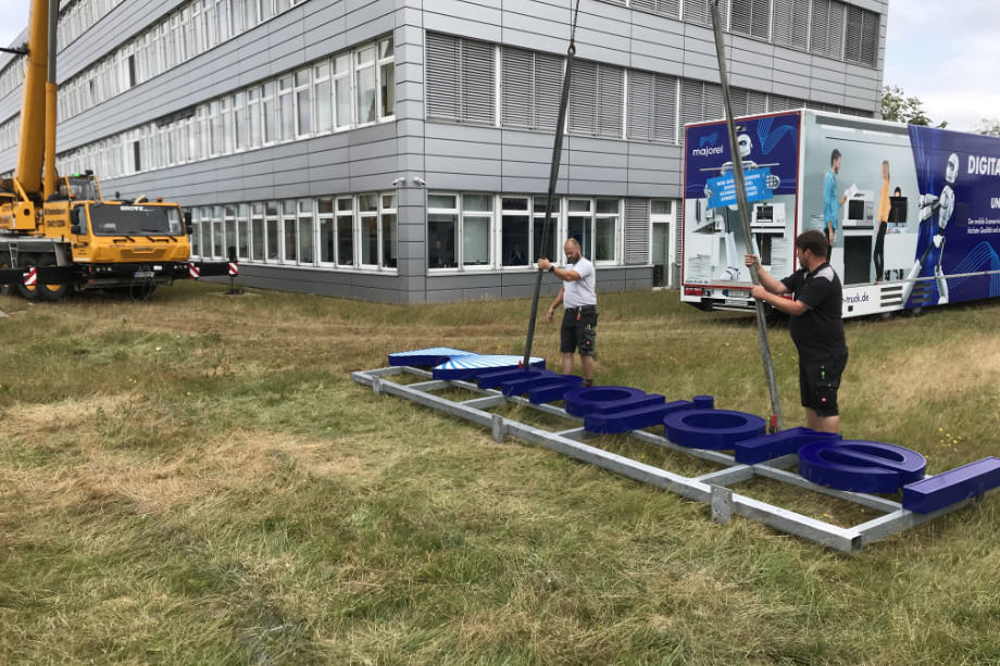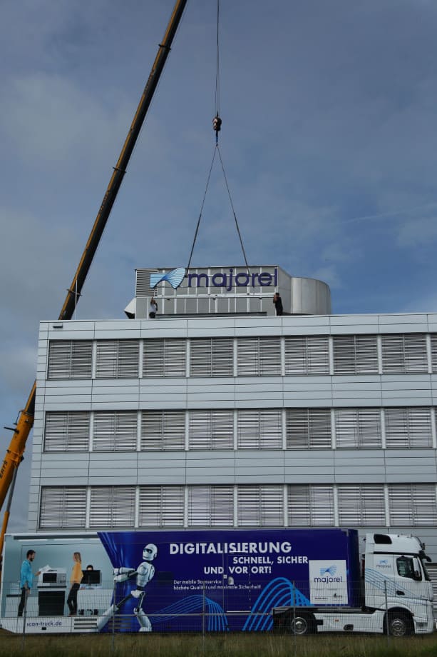 Der neue Firmenname „Majorel“ ist nun an 3 Seiten des Gebäudes sichtbar und misst an 2 Seiten eine Länge von sieben Metern in Richtung B 210 sowie viereinhalb Meter an der Eingangsseite des Gebäudes.