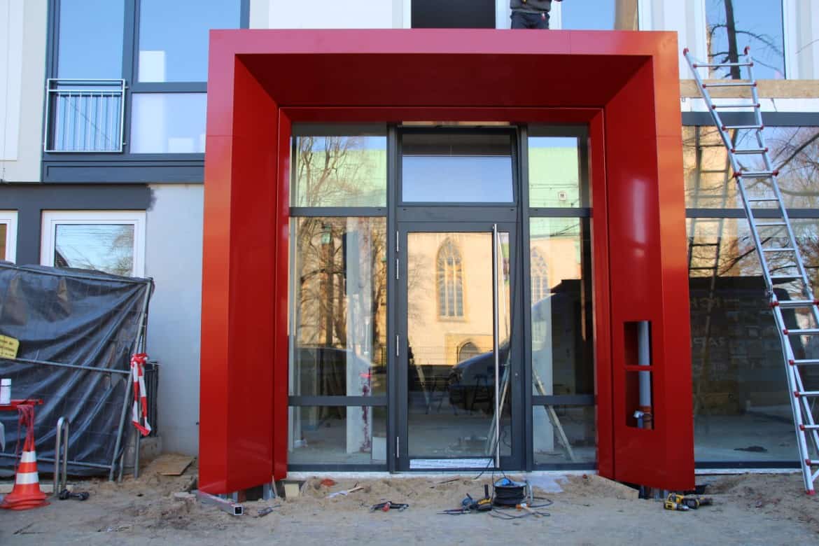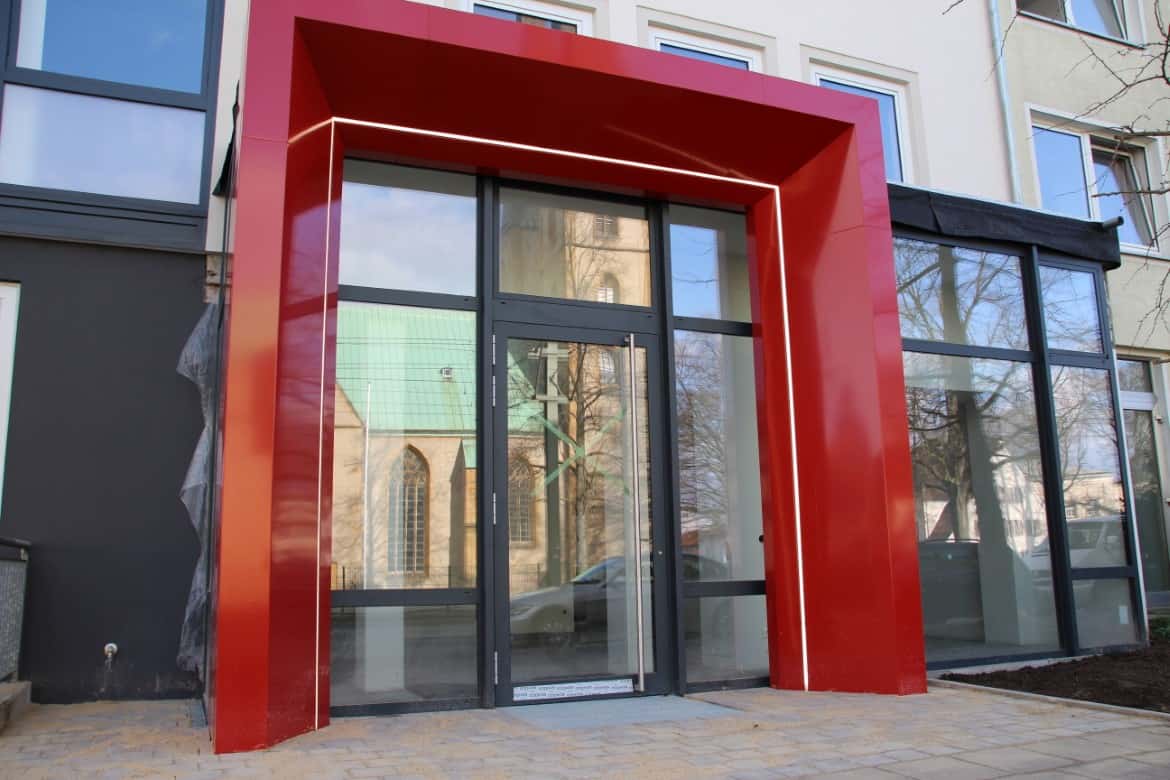 Nicht nur die rote Lackierung des Portalrahmens, auch eine LED-Linie, die mittig in einer Schattenfuge der Innenlaibung verläuft, tragen zu einer positiven Wahrnehmung bei.