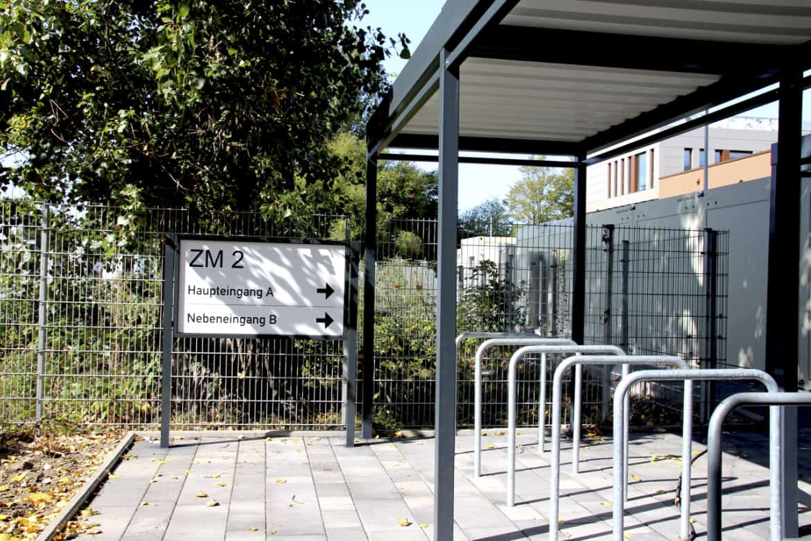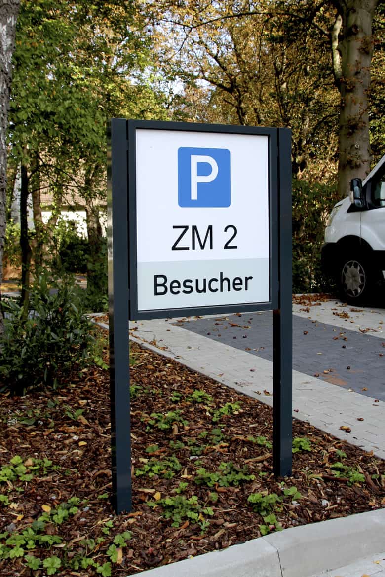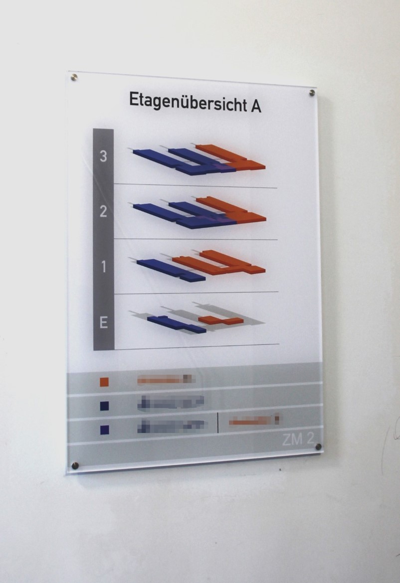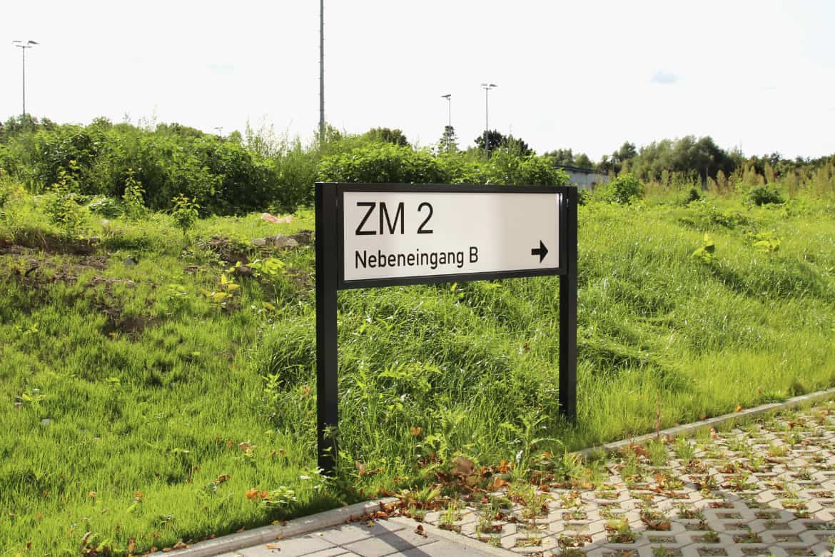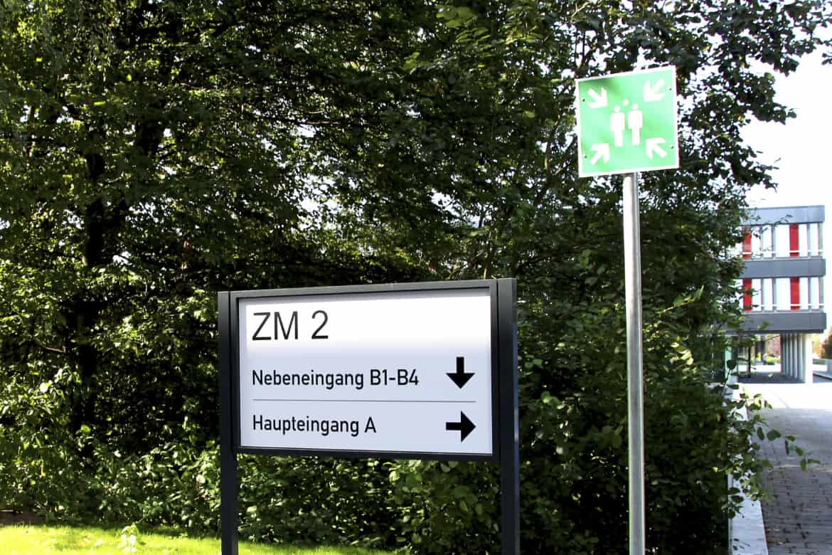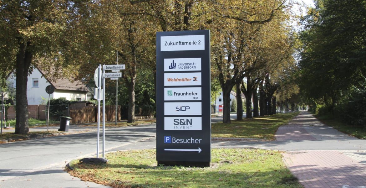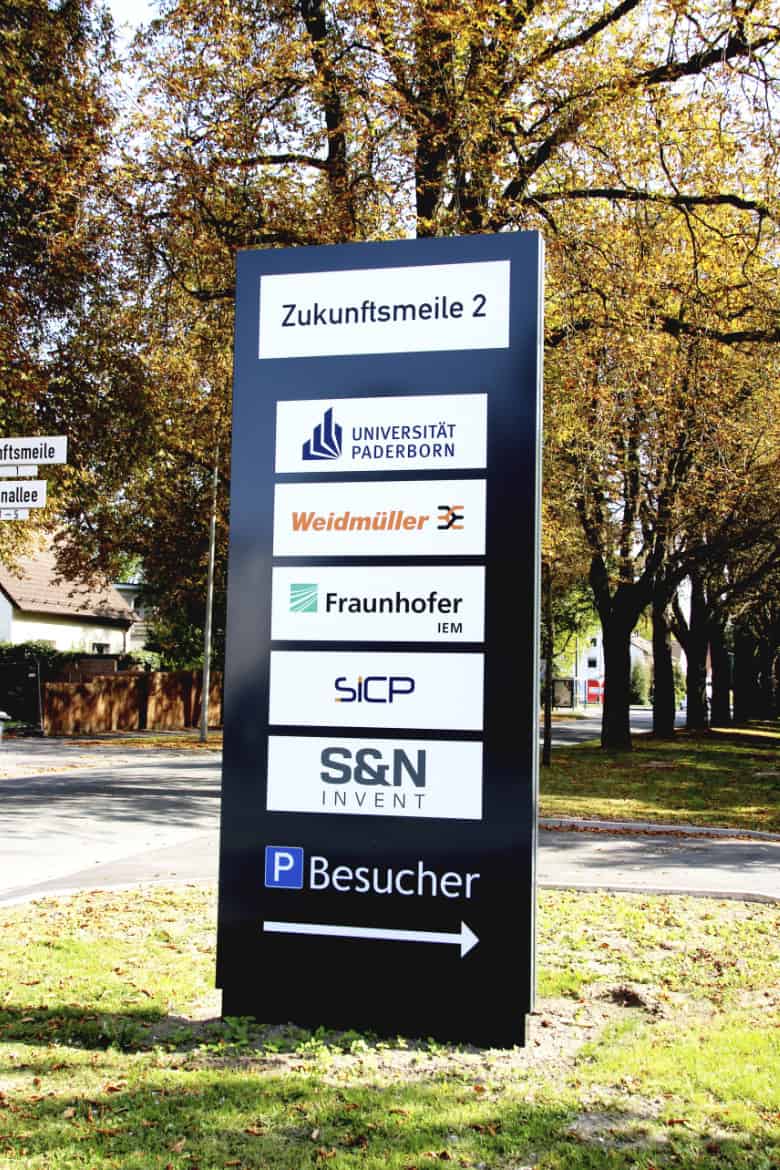 Die Firma Goldbeck ist im vorigen Jahr an uns herangetreten um für das Projekt „Zukunftsmeile 2 Paderborn“ ein Konzept zur Orientierung zu erstellen und umzusetzen. Es ging dabei um die Wegweisung auf dem Gelände, Pylone, Etagenübersichtsschilder, Parkhausbeschilderung, Beklebung der Türen im Außenbereich, sowie die Orientierung im Innenbereich.
