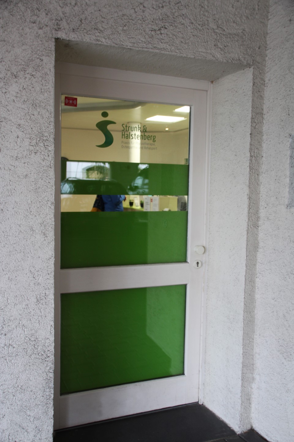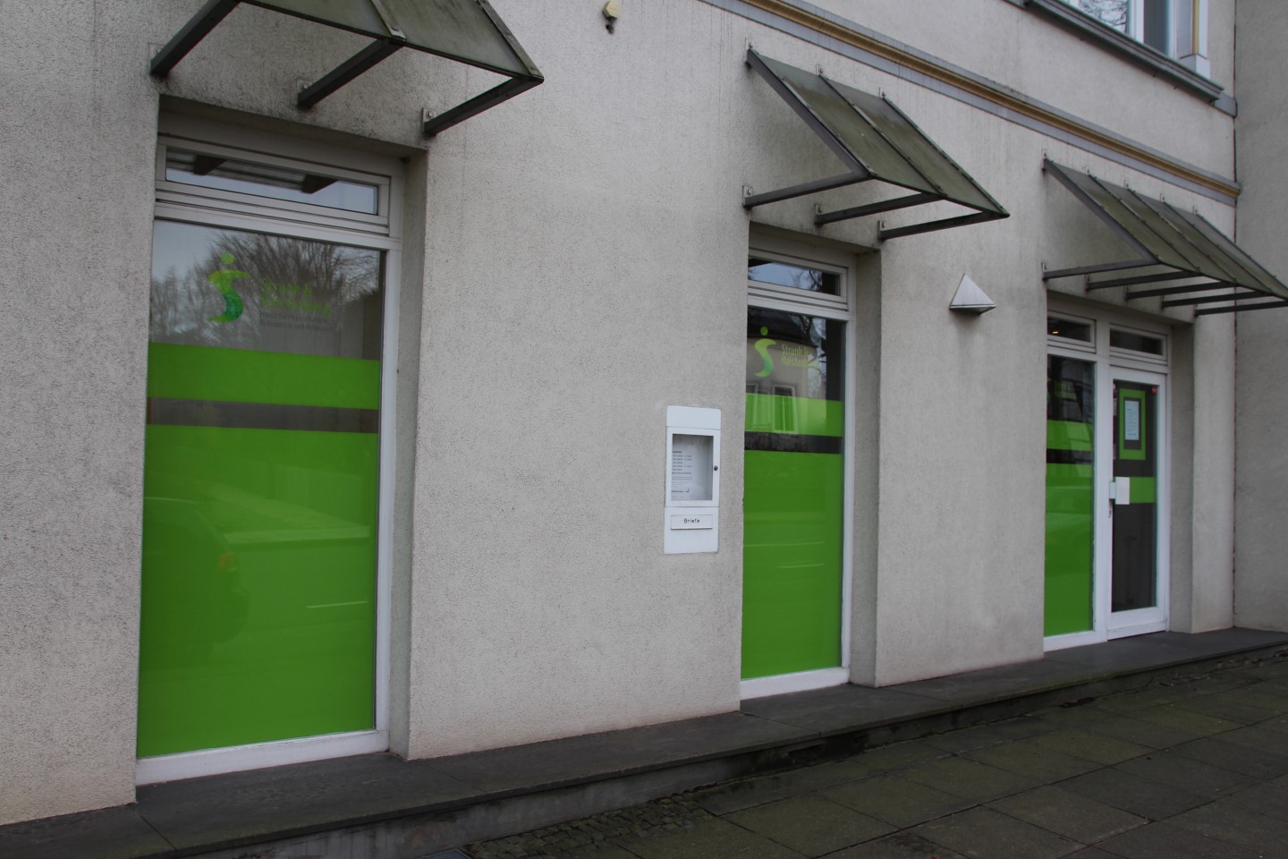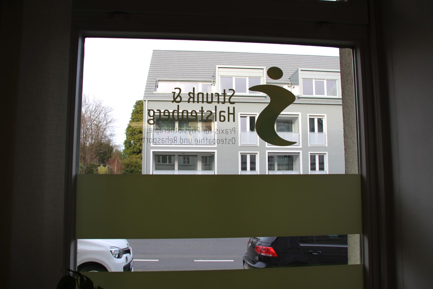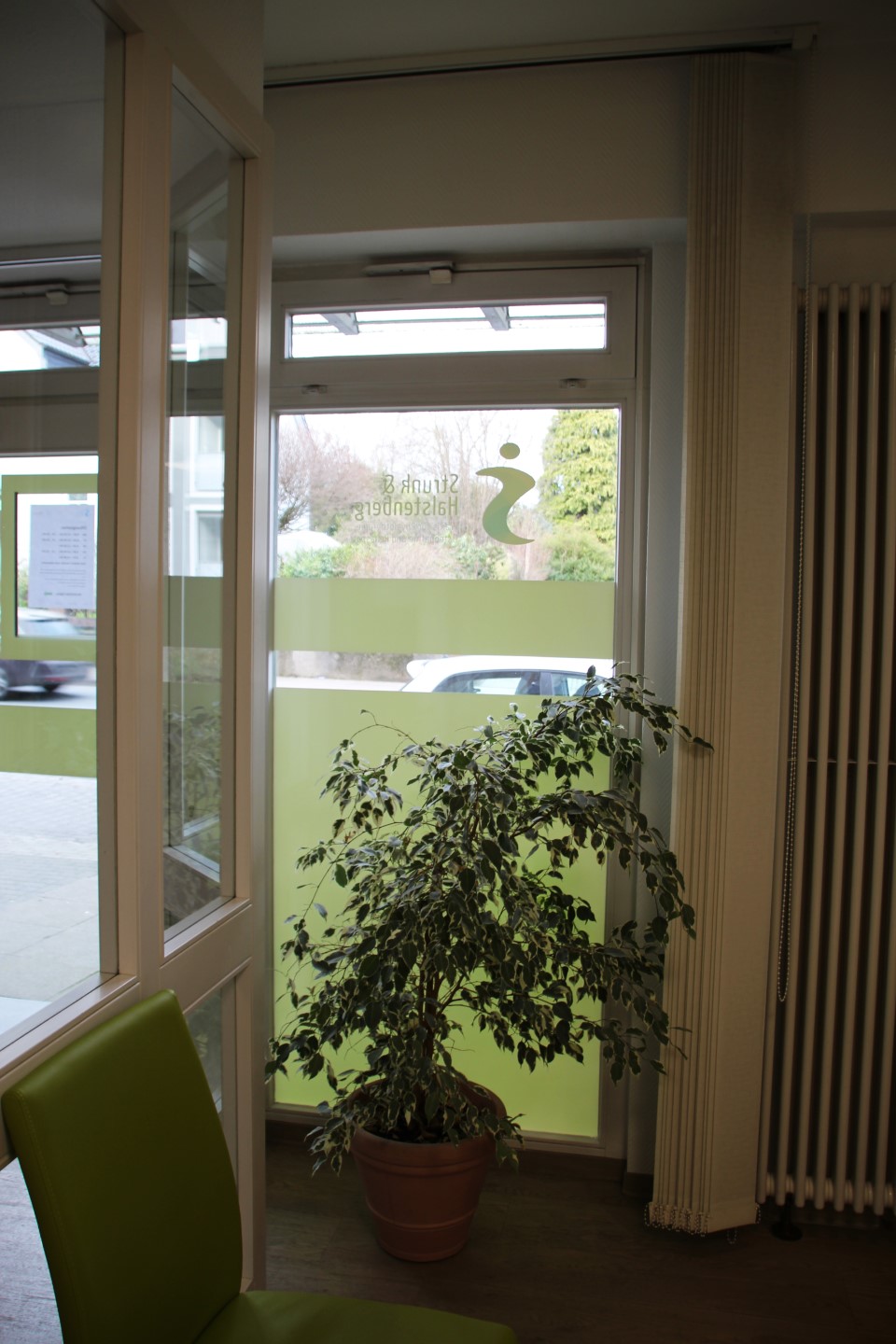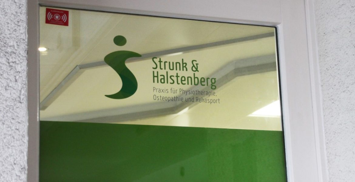Die physiotherapeutische „Praxis Strunk & Halstenberg“ hat Anfang des Jahres ihre frisch renovierten Praxisräume bezogen. Um eine bessere Außenwahrnehmung zu erzeugen, wurden die bodentiefen Fenster als auch die Türen der Praxis mit dem Logo und einer flächigen Folienverklebung versehen. Diese wurden im Digitaldruck nach Farben der CI gedruckt und von innen montiert. Um den Grünton kräftiger erscheinen zu lassen, haben wir die Flächen von hinten weiß kaschiert. Gleichzeitig dient die Beklebung auch als Sichtschutz.