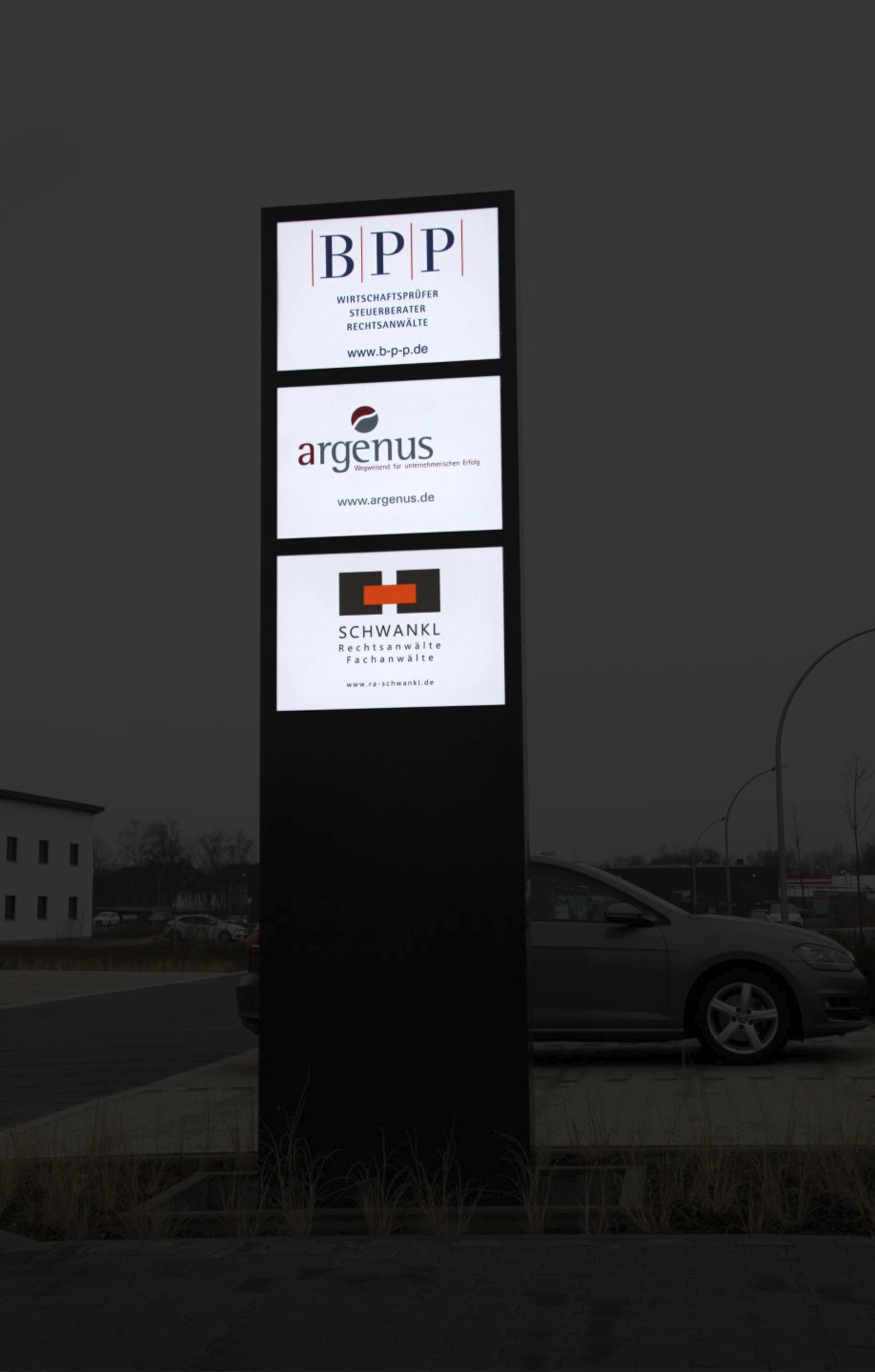 Die Fassade ist ausgestattet mit 2 hochwertigen Leuchtschriftzügen (Frontleuchter) aus 30 mm starkem Acrylgals, weiß Opal. Zargen und Rückseite wurden lichtdicht lackiert in RAL 9006. Die Ausleuchtung erfolgt über hochwertige weiße LED (6500K) von GE. Zusätzlich weist ein beidseitig leuchtender Pylon auf den neuen Firmenstandort hin. Die Werbeflächen sind dekupiert und mit einer 3 mm weiß opalen Acrylglasscheibe hinterlegt, beschriftet mit Folienplots aus transluzenter Hochleistungsfolie.