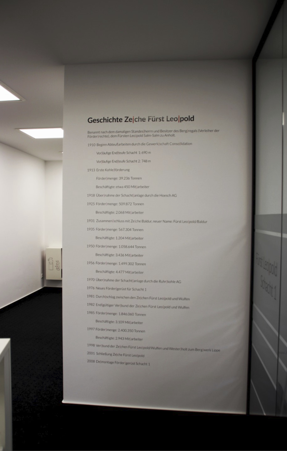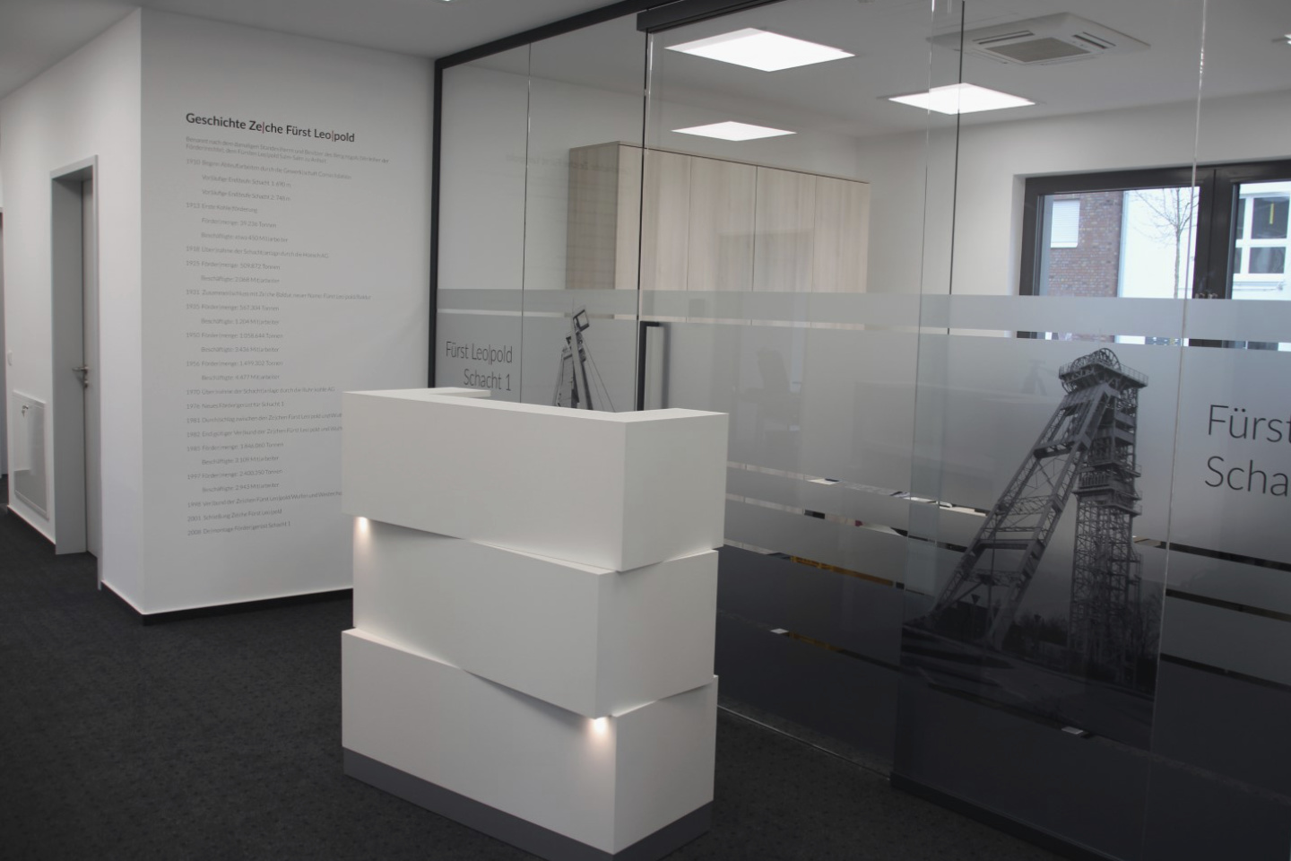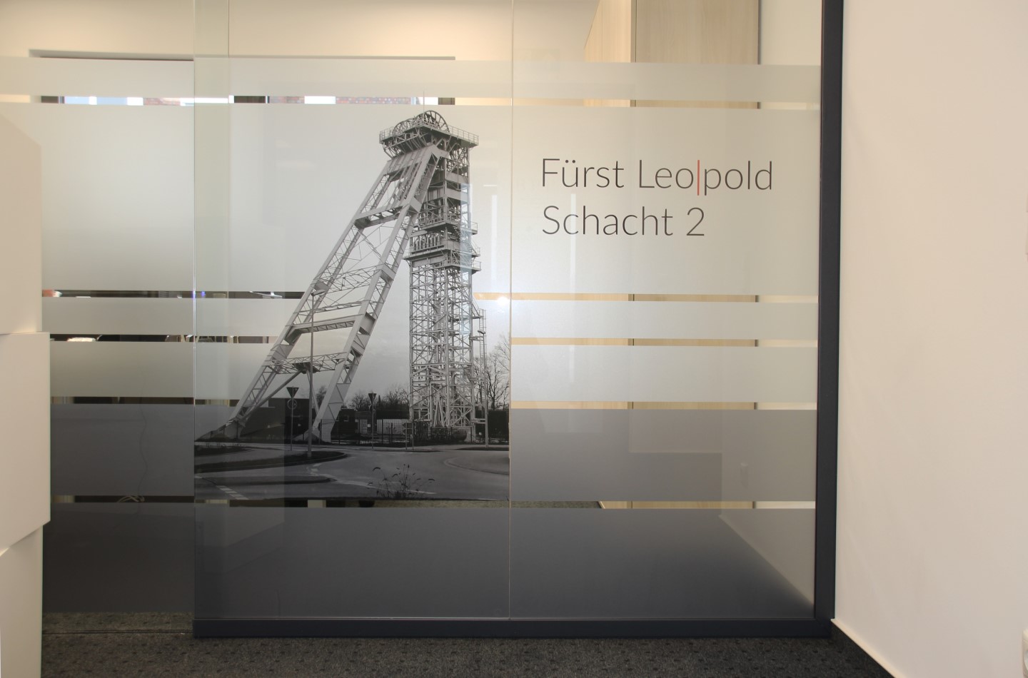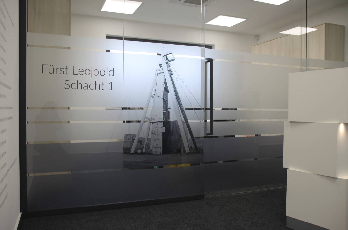 Die Eingangstür der Sozietät wird durch einen breiten Streifen digital bedruckter Folie mit Glasdekorkaschierung gekennzeichnet. Ein besonderes Highlight sind die Glasflächenbeklebungen im Eingangsbereich. Sie wurden mit Abbildungen historischer Motive versehen, die gleichzeitig auch einen dekorativen Sichtschutz bieten. Ein Wandtattoo links der Glasflächen informiert über die geschichtliche Entwicklung des alten Zechengeländes.