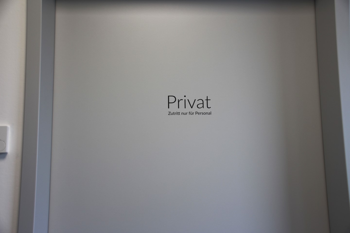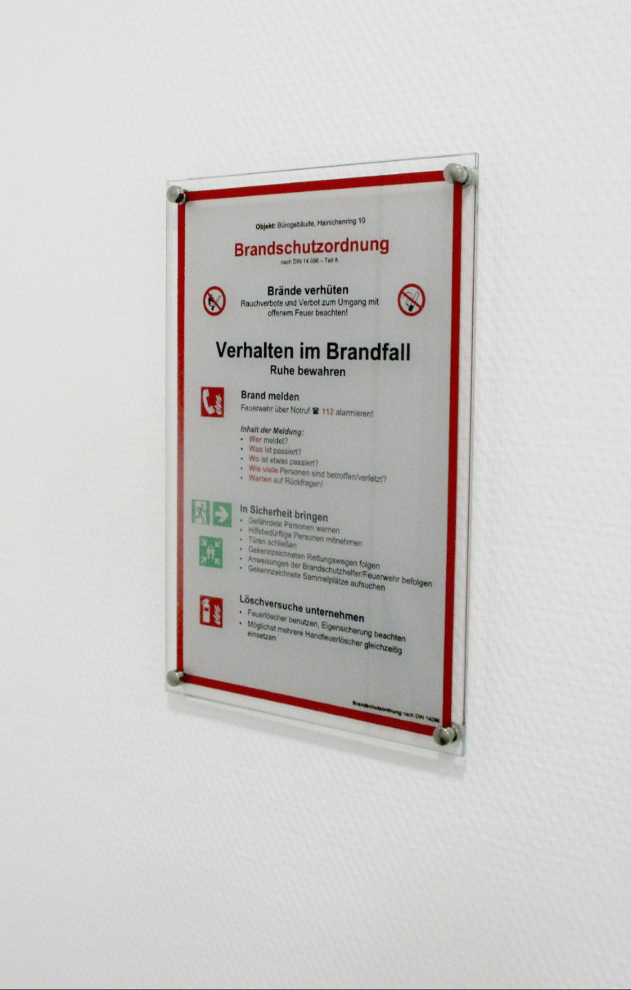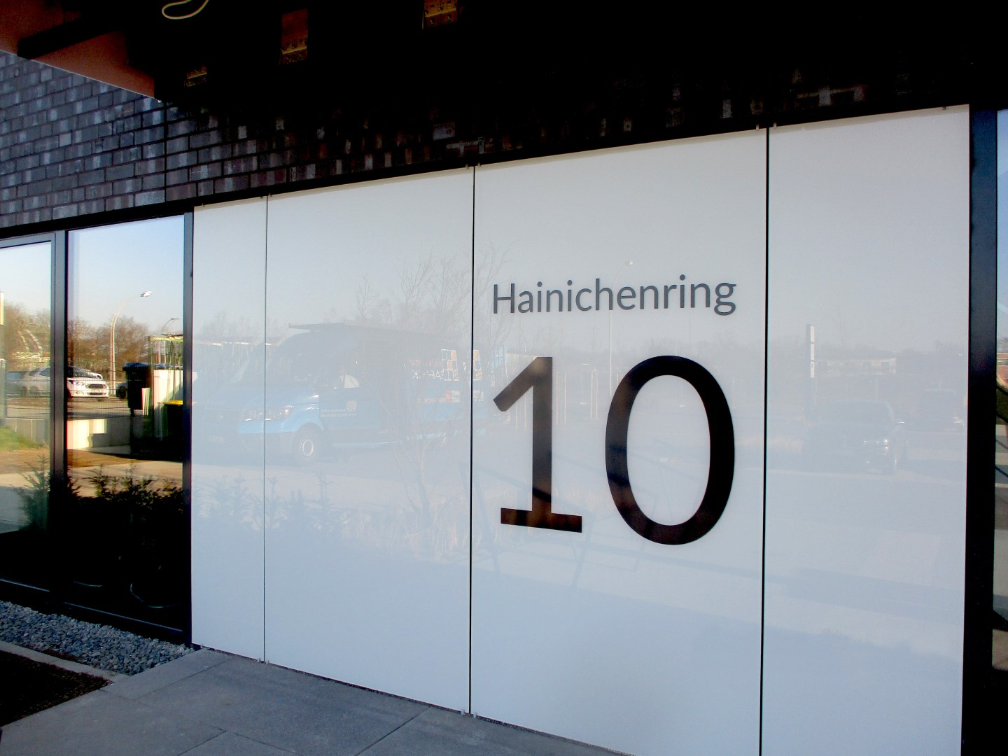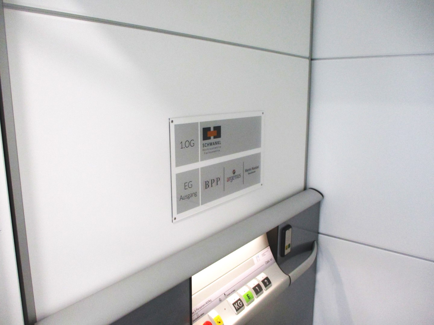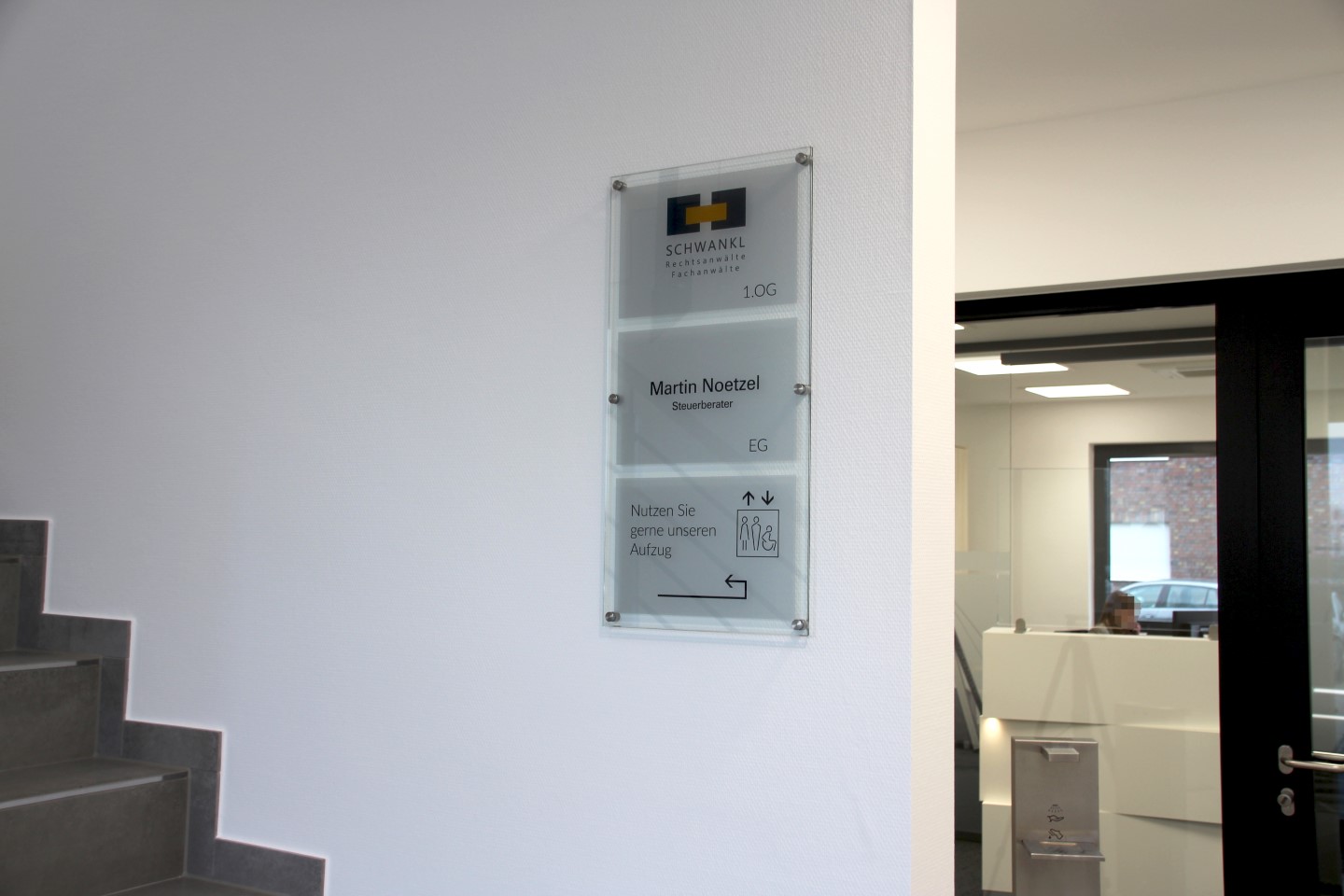 Auch wurde das Gebäude mit einem kleinen Leitsystem ausgestattet, bestehend aus Glasschildern in Sandwichbauweise mit hochwertigen Abstandshaltern, welche die Exklusivität des Schildes unterstreichen. Kennzeichnungen aus gelaserten V2A und diversen Folienplots runden das Ganze ab.