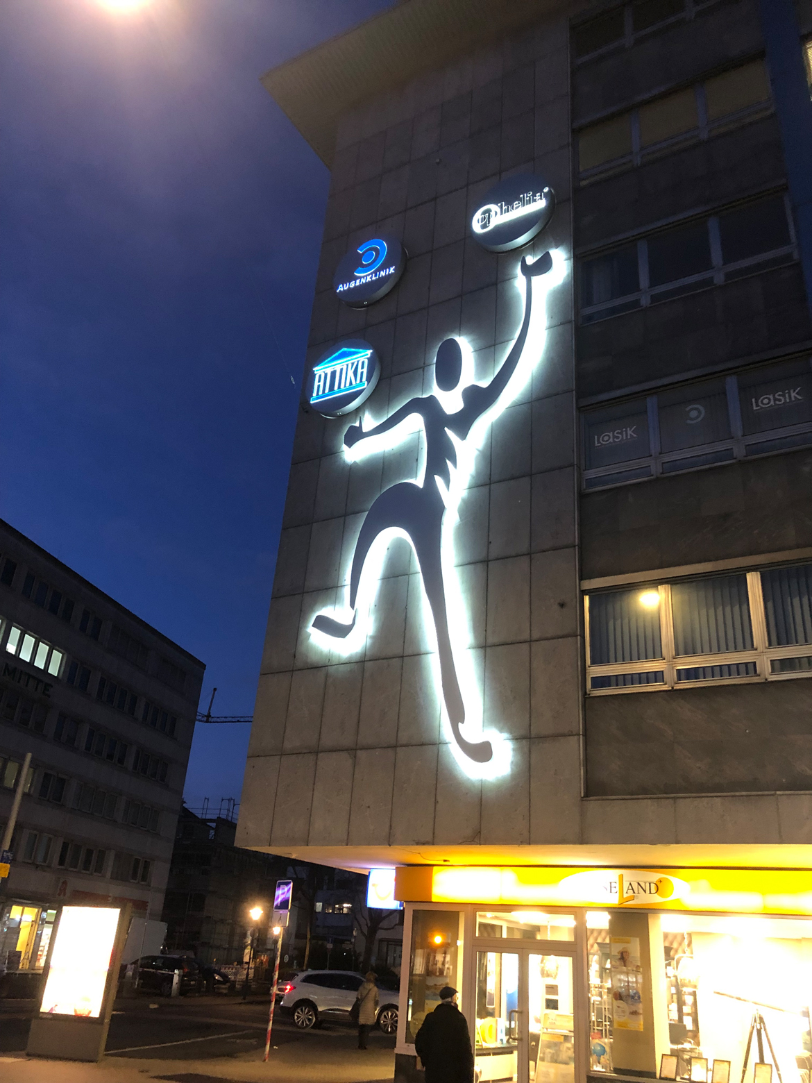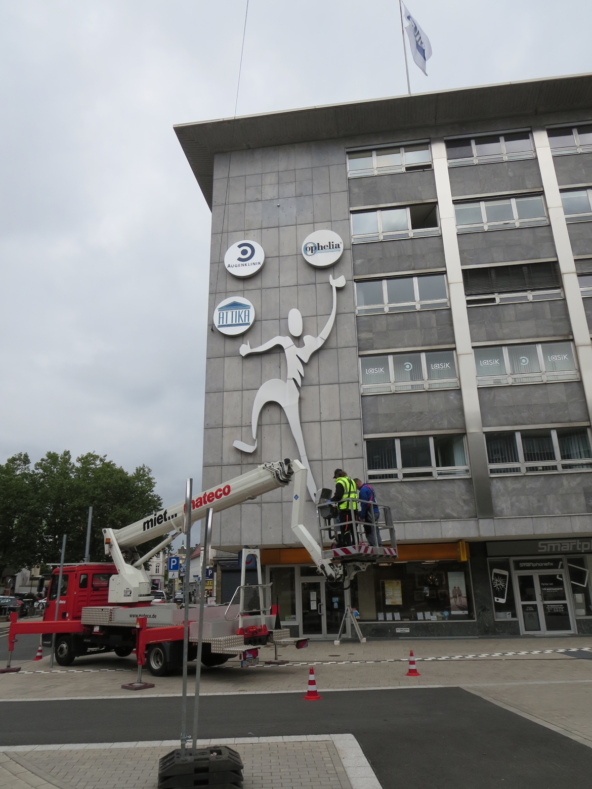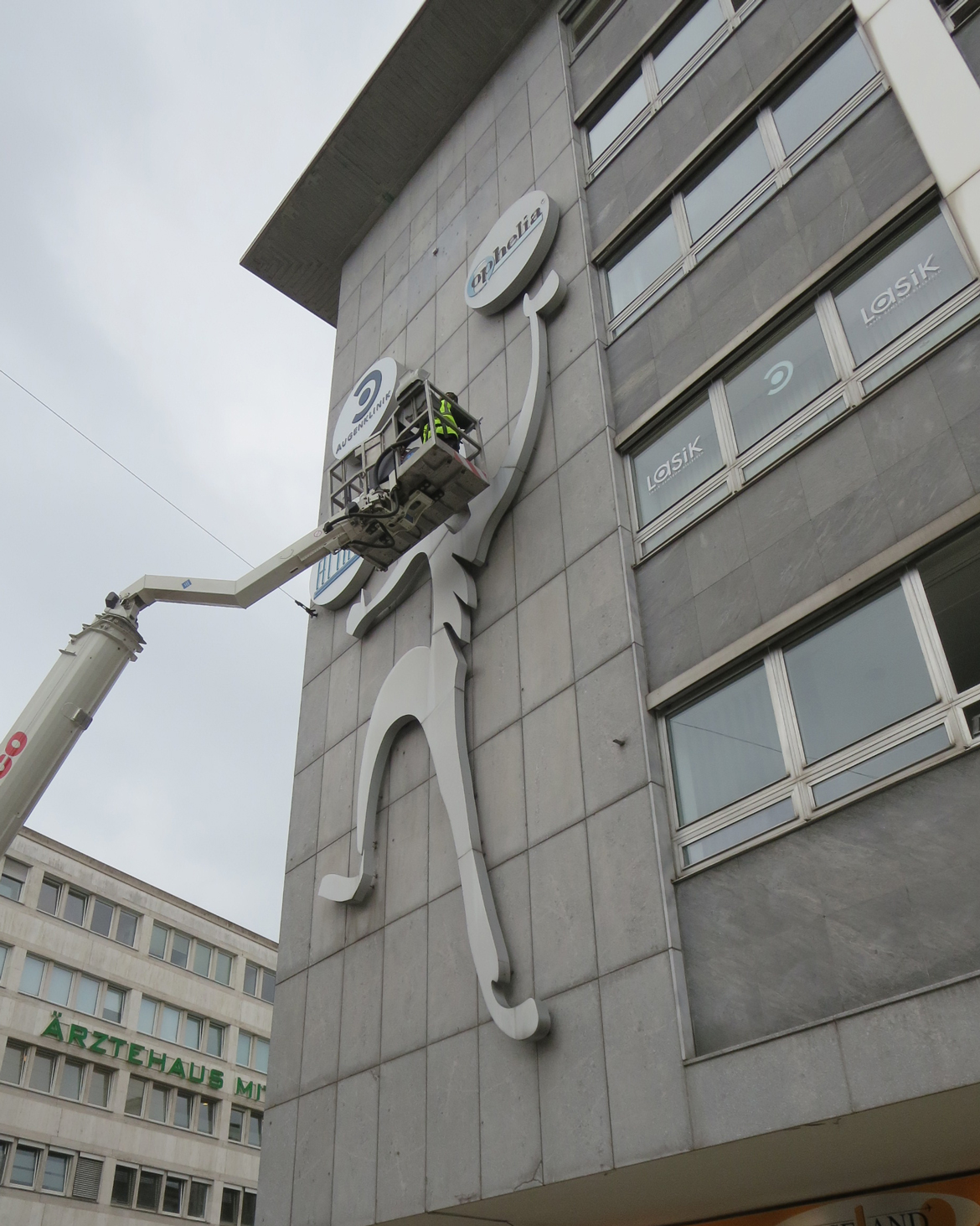 Im Zuge der Fassadensanierung in Bielefeld wurde auch die große Werbeanlage erneuert. Wir, als qualifiziertes Fachunternehmen, wurden damit beauftragt dieses in die Tat umzusetzen. Wir haben die Folien und die Beschriftungen der drei Segmente erneuert und die Figur von Grund auf restauriert (lackiert). Die alten Leuchtstoffröhren haben wir durch LED ersetz. Unsere langlebige, energieeffiziente und hochwertige LED-Technik sorgt für einen angenehmen und effektiven Lichteffekt – JETZT WIE NEU!