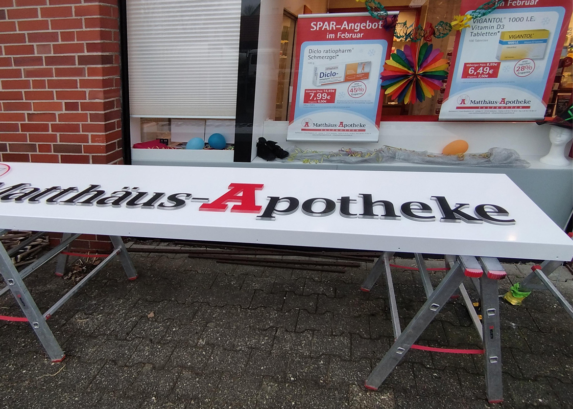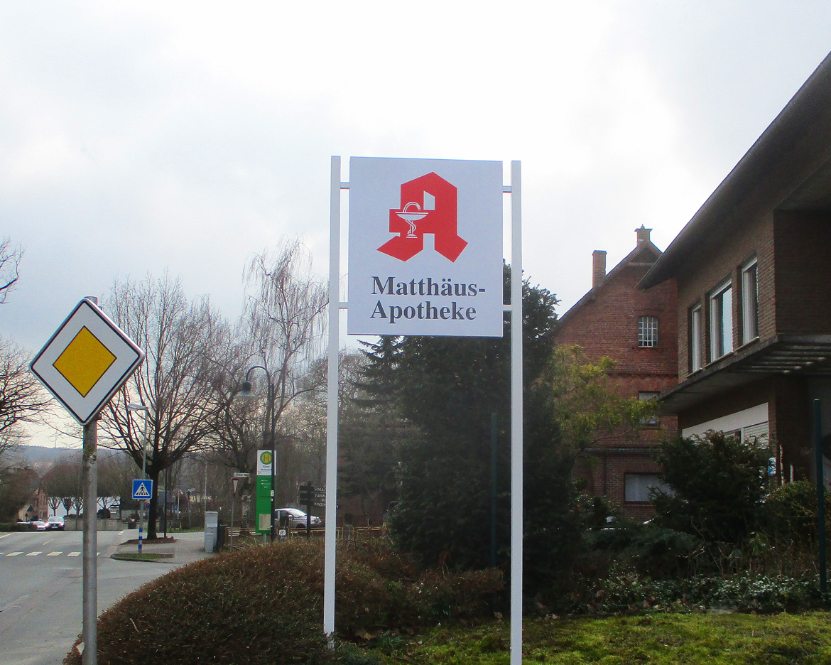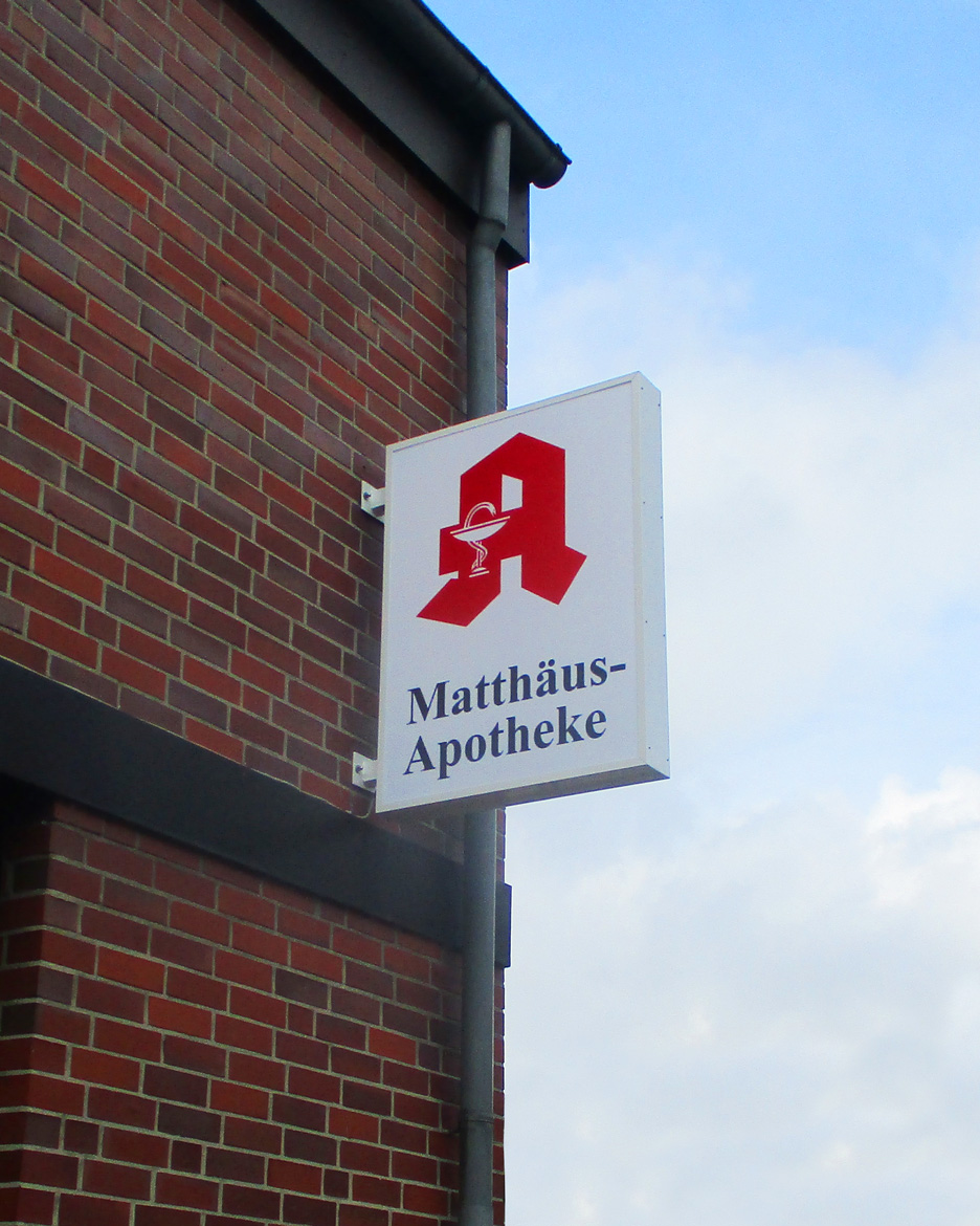 Bereits im Jahr 2021 fertigten wir für die Matthäus-Apotheke einige Werbeelemente im Außenbereich, wie Hinweisschilder aus Dibond und auch ein beidseitiges Ausstecktransparent. Sämtliche Elemente wurden in unseren eigenen Fertigungsstätten (Beschriftung, Fräse, Schlosserei) hergestellt.