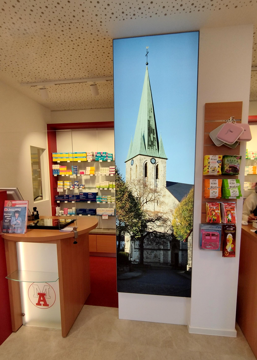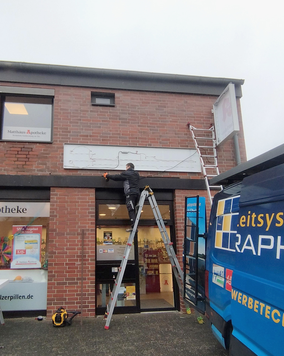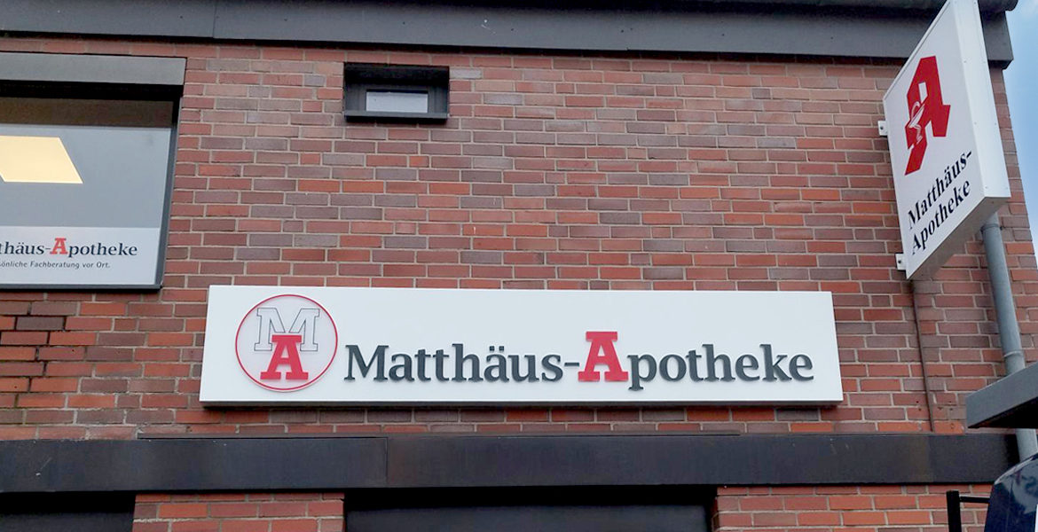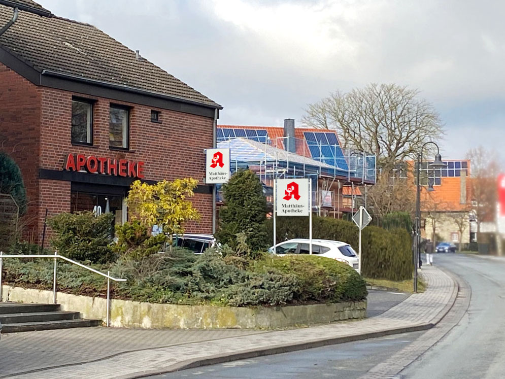 Bereits im Jahr 2021 fertigten wir für die Matthäus-Apotheke einige Werbeelemente im Außenbereich, wie Hinweisschilder aus Dibond und auch ein beidseitiges Ausstecktransparent. Sämtliche Elemente wurden in unseren eigenen Fertigungsstätten (Beschriftung, Fräse, Schlosserei) hergestellt.