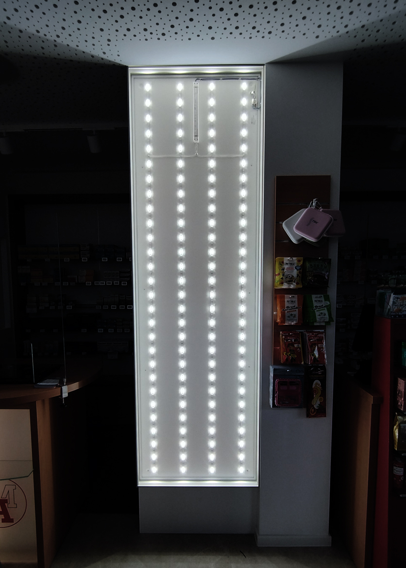 Der beleuchtete Flachkederrahmen (50 mm) mit Textildruck sorgt für einen auffälligen Blickfang. Spanntuchanlagen eignen sich besonders gut für wechselnde Motive.