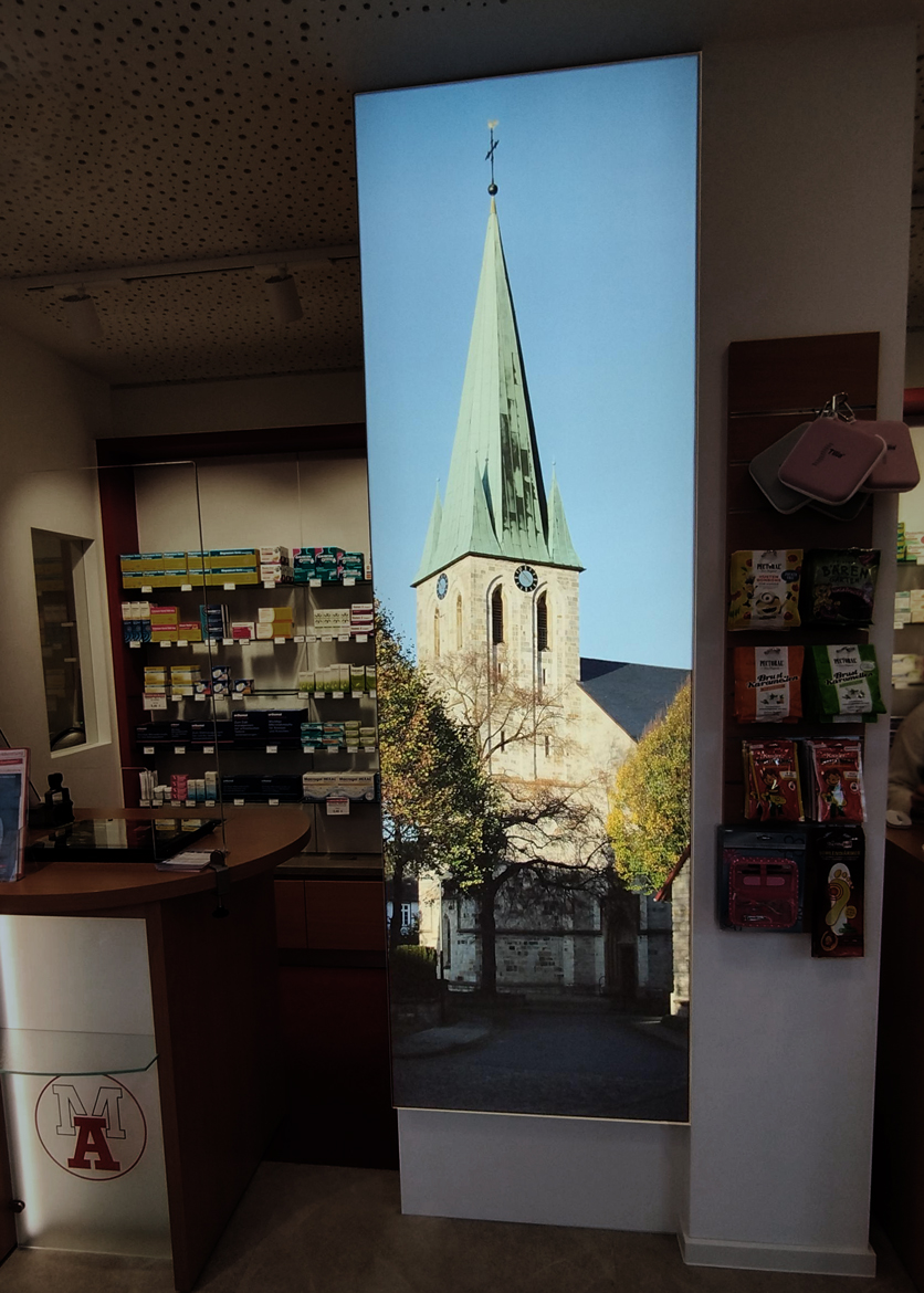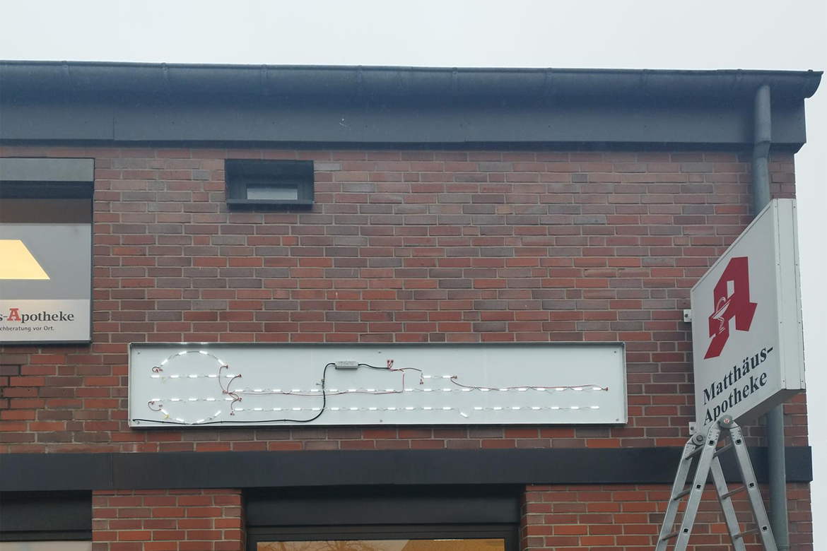 Für die neue Lichtwerbeanlage an der Fassade der Matthäus-Apotheke in Salzkotten, bot sich ein hochwertiges Profil 1 Transparent mit 3D-Buchstaben an. Das Gehäuse wurde aus Aluminium gefertigt, Logo/Buchstaben gefräst und erhaben mit Acrylglas 20mm durchgesteckt. Eine gleichmäßige und nachhaltige Ausleuchtung wird durch unsere LED-Module gewährleistet.