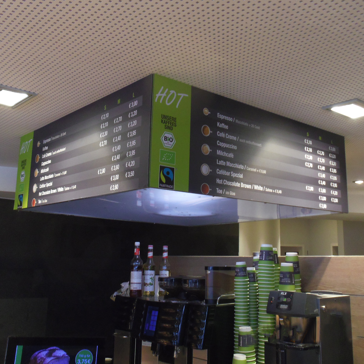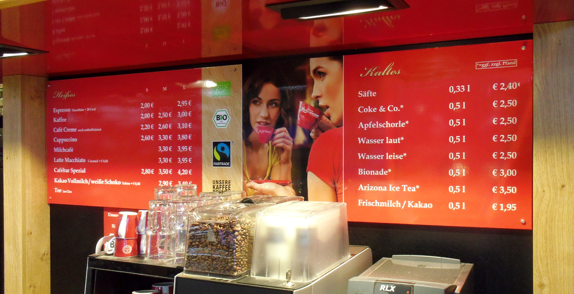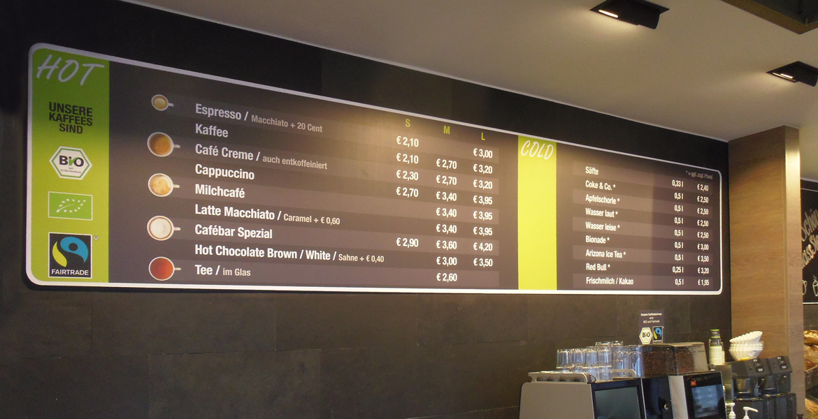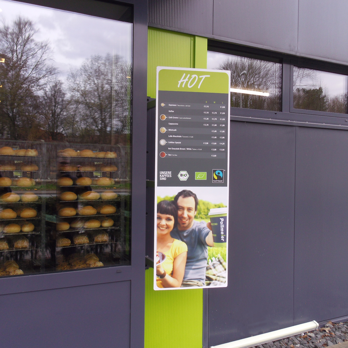Wir haben wieder unseren Full-Service für die Erneuerung der Coffeeboards der Bäckerei Lechtermann-Pollmeier in diversen Filialen eingesetzt. Die Produktion erfolgte durch unseren hauseigenen Digitaldrucker auf einer Hochleistungsfolie. Nach einer kurzfristigen inhaltlichen Abstimmung und Korrektur wurden die Boards in unterschiedlichen Größen und Auflagen schnell und nachhaltig gedruckt. Unser Montageteam erledigte die Verklebearbeiten vor Ort.