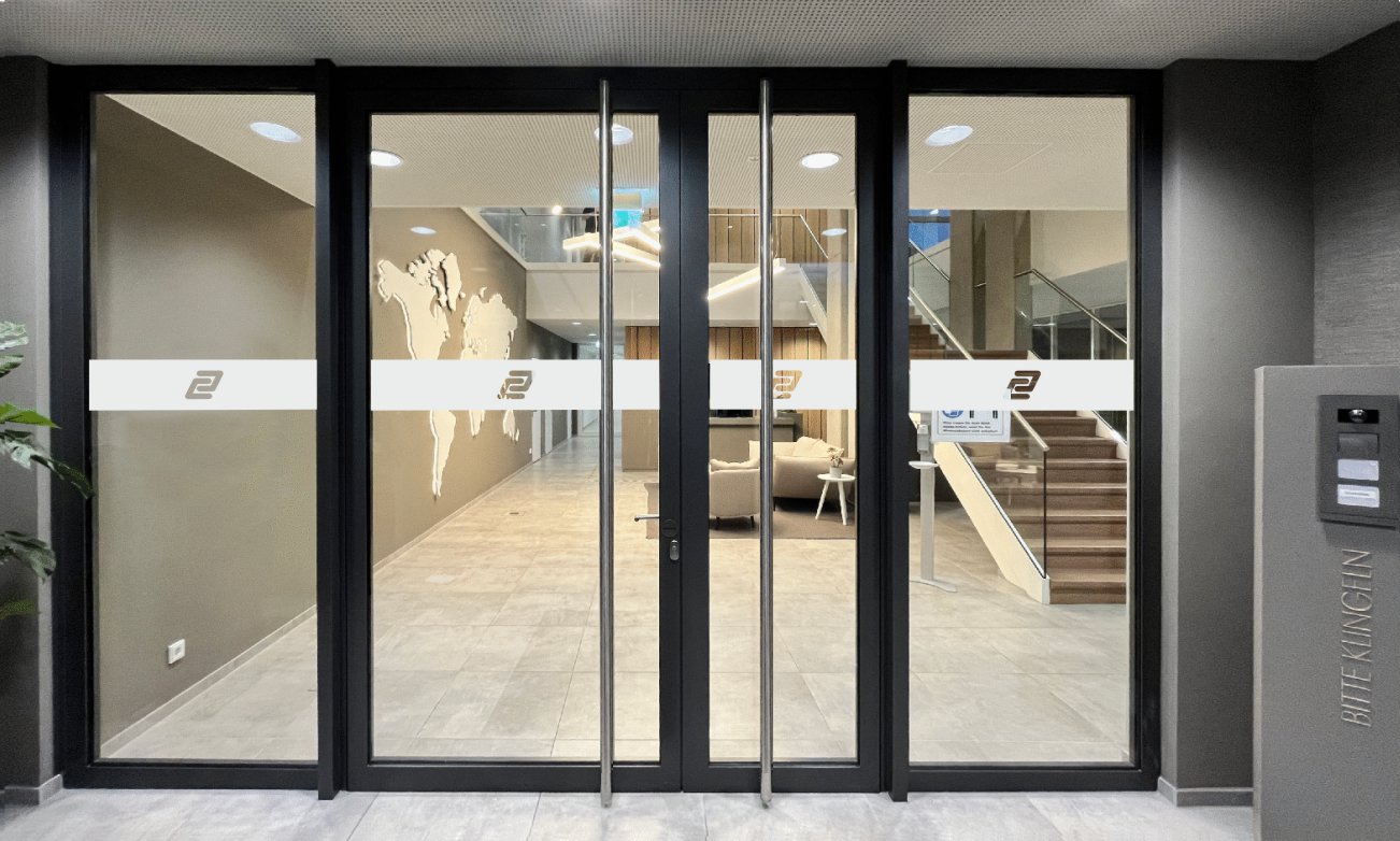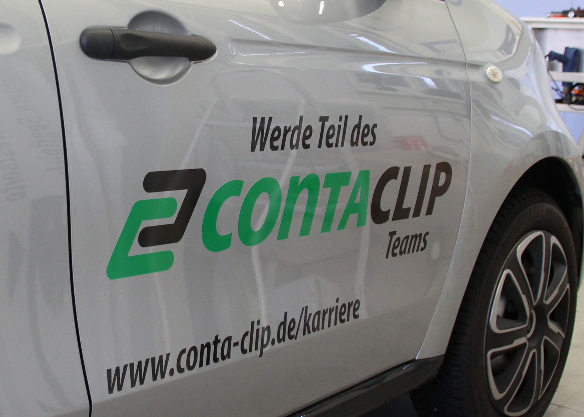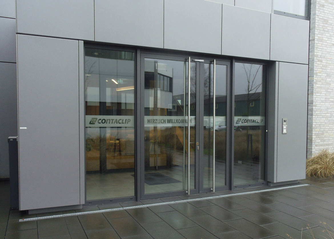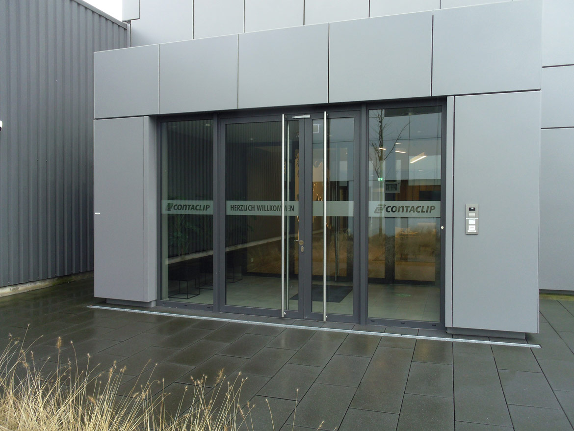 Die Eingangstüren wurden mit dem CONTA-CLIP Logo aus Glasdekorfolie beschriftet.