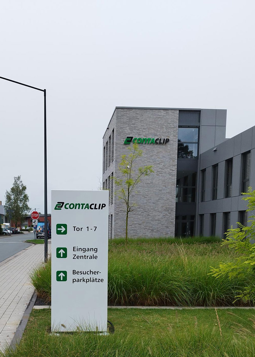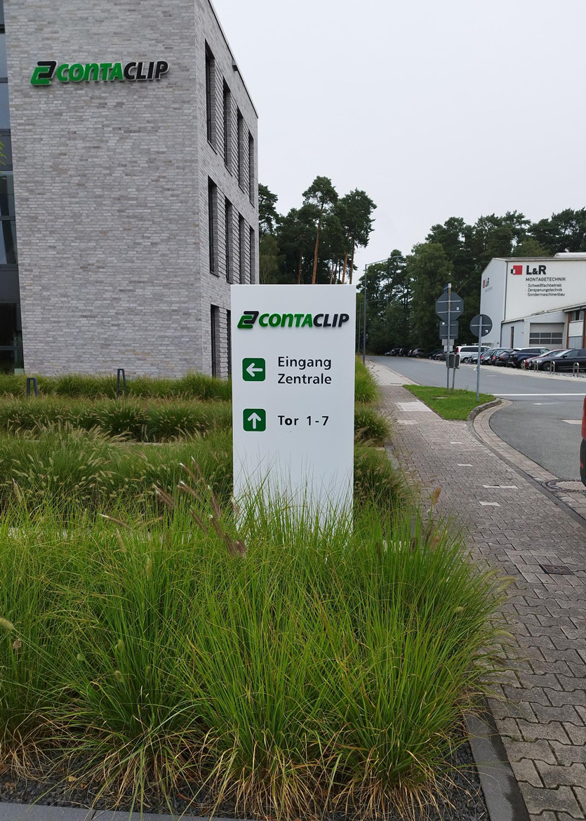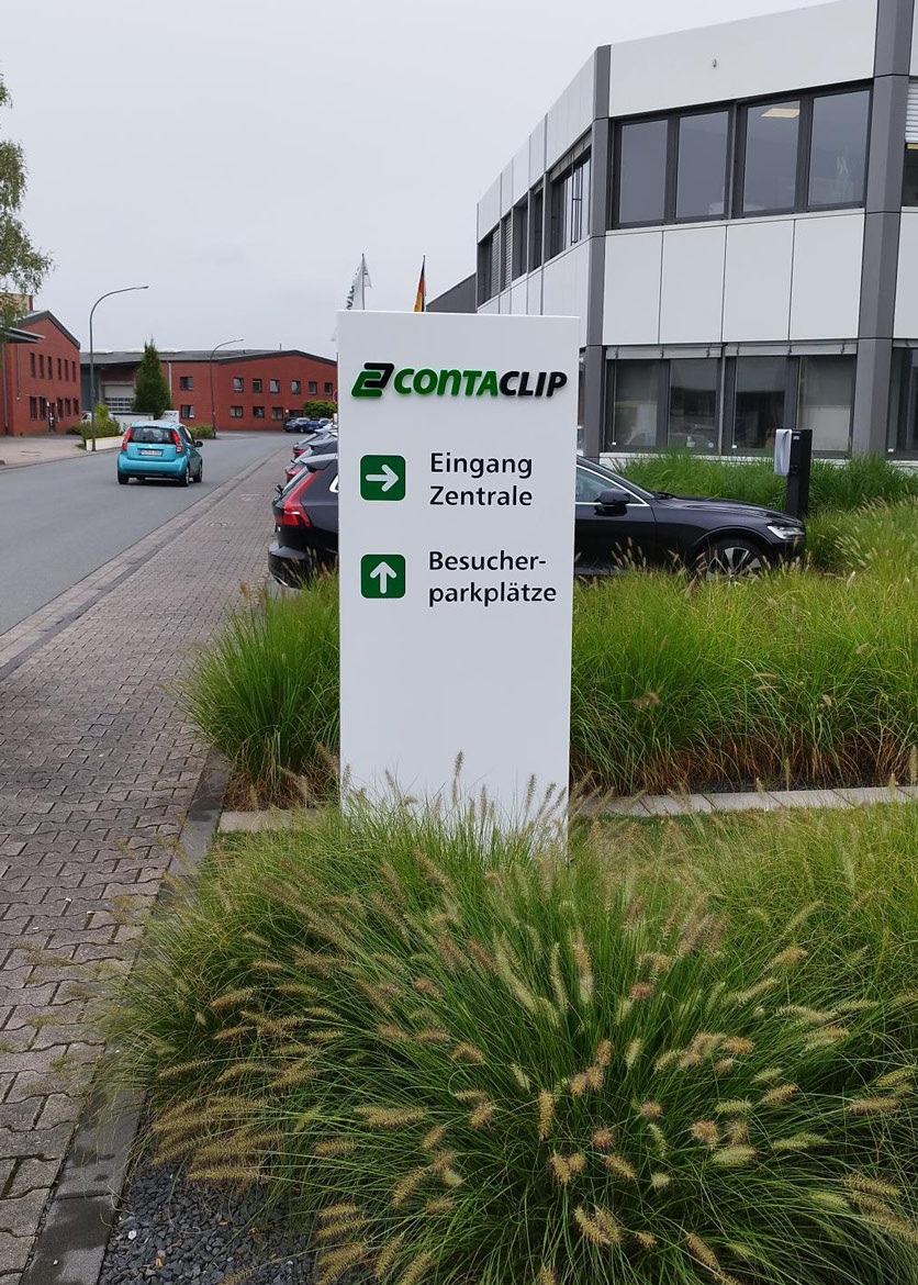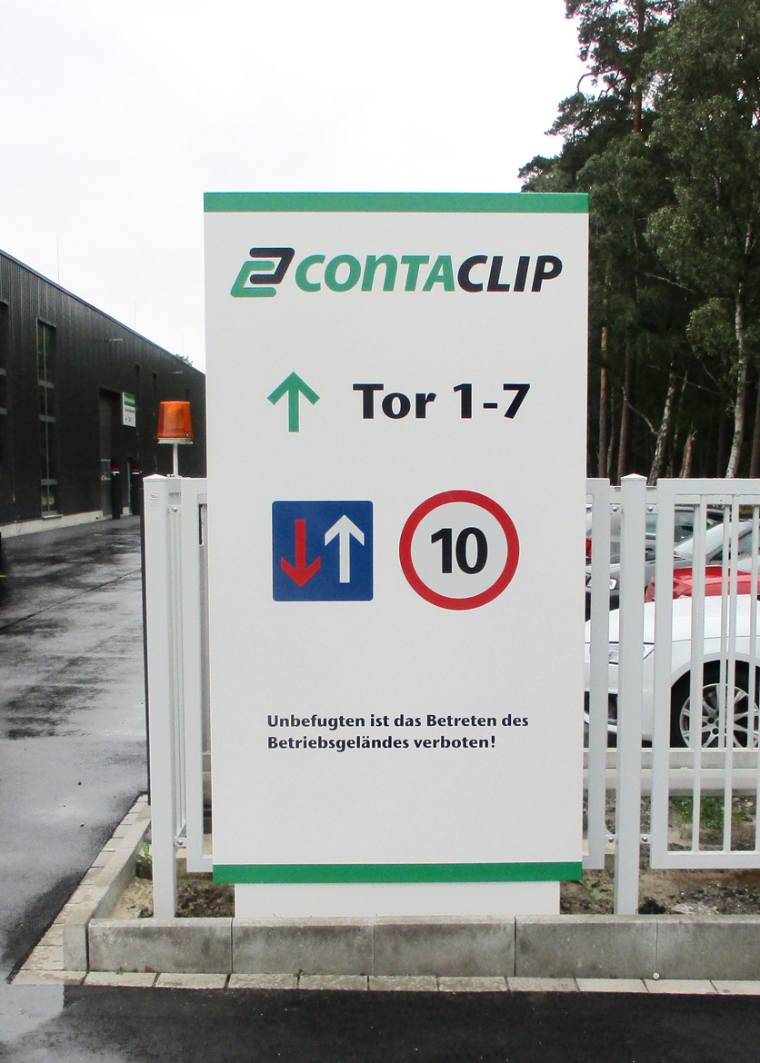 Wir haben unseren Full-Service für CONTA-CLIP aus Hövelhof wieder praktiziert. Wir freuen uns auf die Zusammenarbeit mit unserem langjährigen Kunden. Der Leuchtpylon in Form eines Wegweisers dient als Orientierungshilfe für die Besucher und Lieferanten, ist zugleich eine schicke Werbeanlage für das Unternehmen. Die Pylone wurden von uns komplett gefertigt und standfest nach Statik montiert.