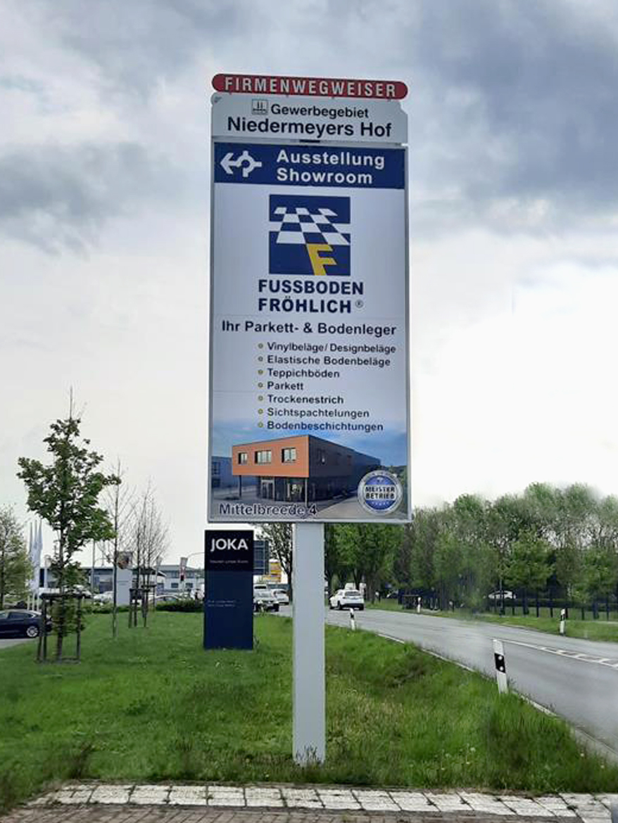 Unsere Hinweisschilder sorgen für Bekanntheit und spontane Blickkontakte. Die Firmenwegweiser werden in unserer hauseigenen Schlosserei nach unserem bewährten Baukastensystem für feste Schildergrößen gebaut. Die Systeme werden aus langlebigen Materialien wie Aluminium oder feuerverzinktem Stahl hergestellt. Wenn gewünscht, ist dies auch in speziellen Farbtönen möglich, angepasst an die vorhandene Stadtmöblierung. Auch das Rahmendesign kann individuell gestaltet werden.