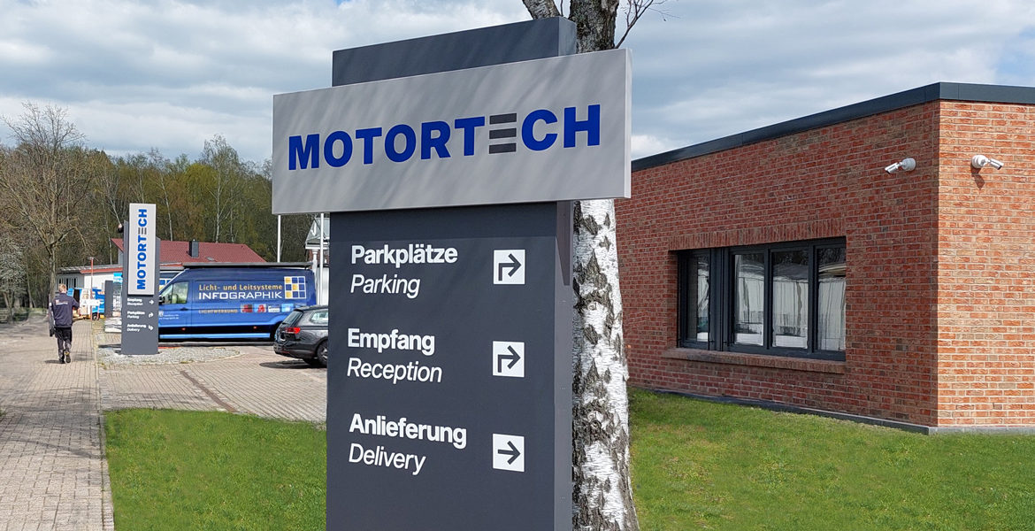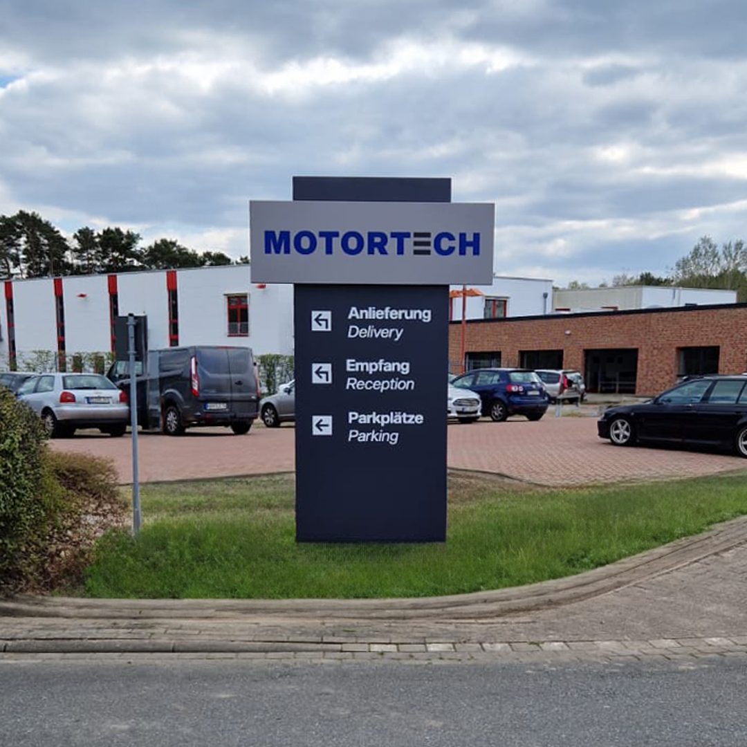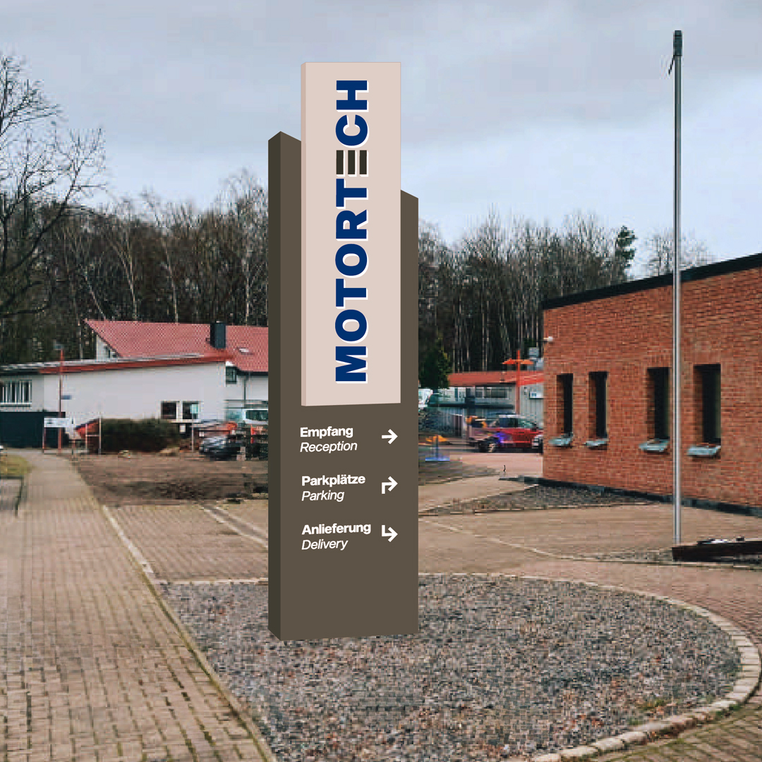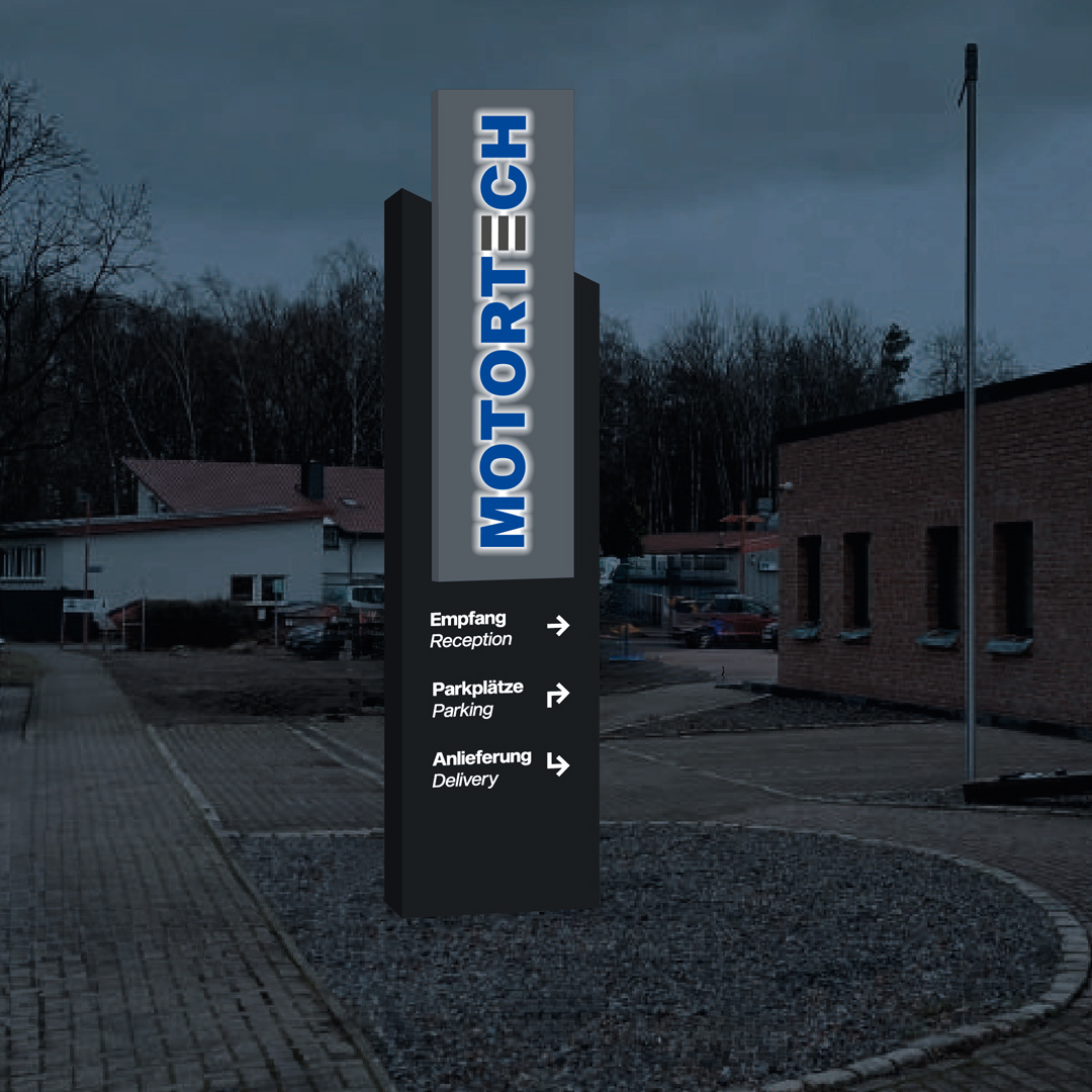 Der Leuchtpylon in Form eines Wegweisers bietet Besuchern und Lieferanten eine Orientierungshilfe und fungiert gleichzeitig als schicke Werbeanlage für das Unternehmen.