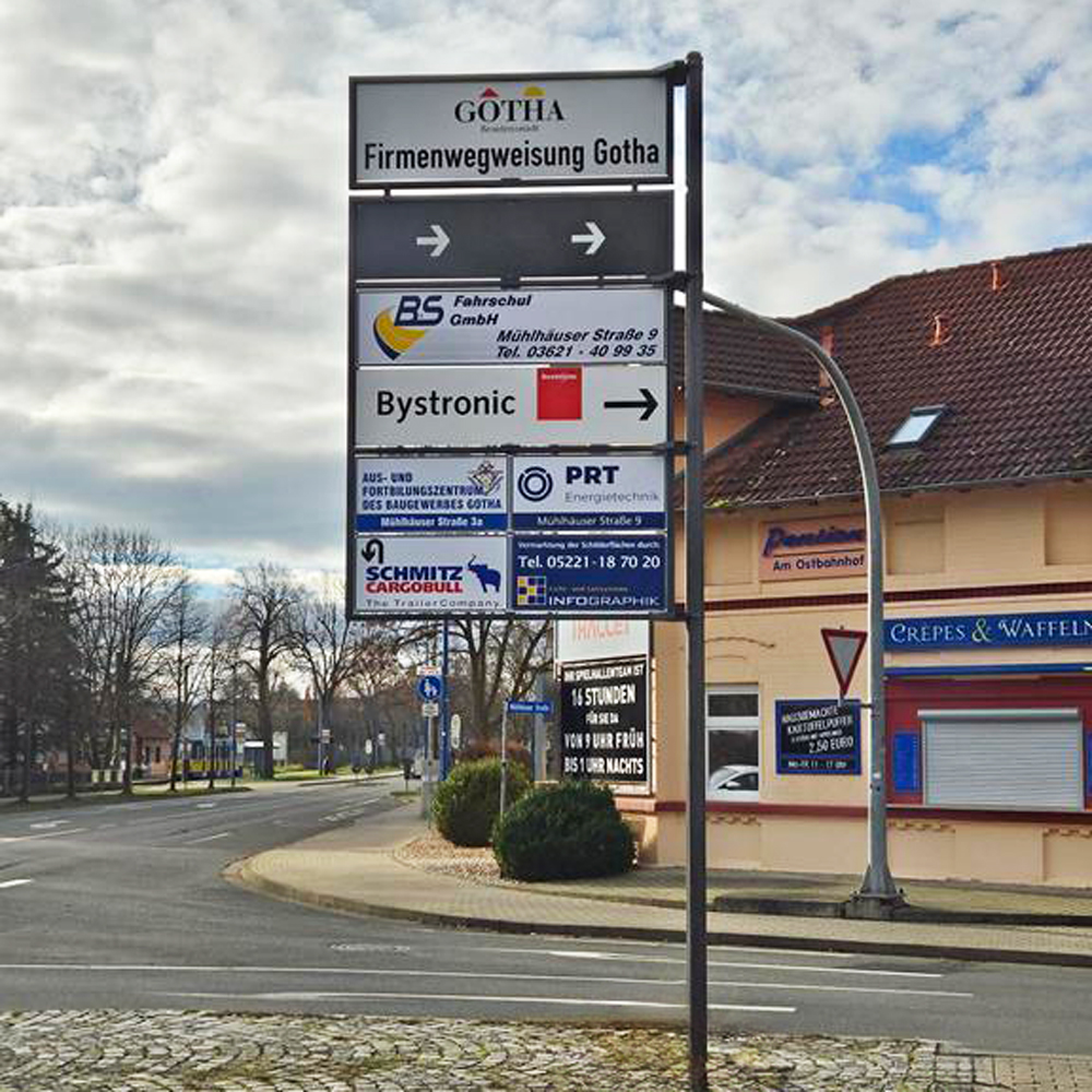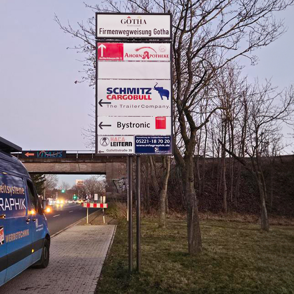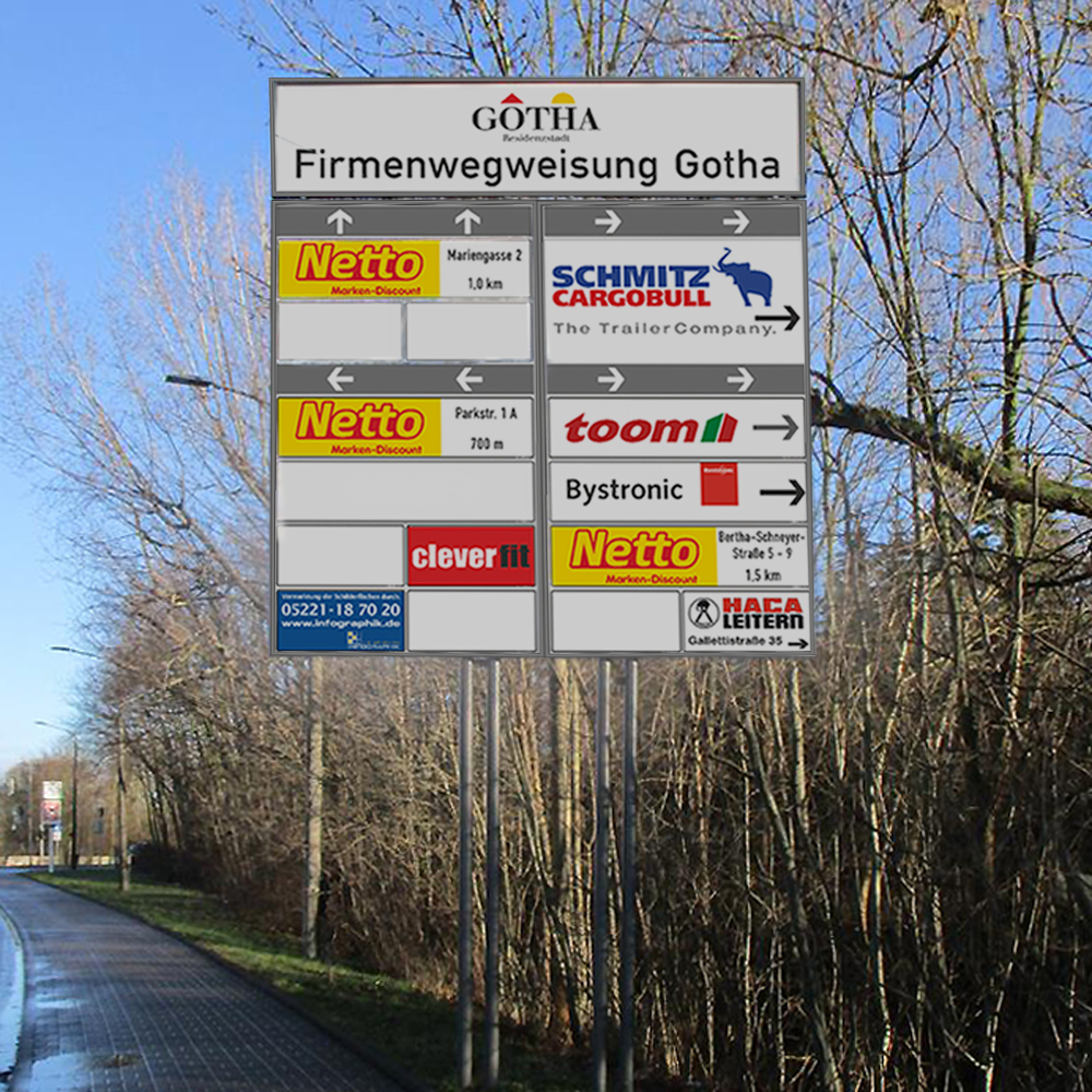 Für die Titel- und Zwischenschilder setzen wir auf einen hochwertigen Digitaldruck auf weiß reflektierendem Material. Dadurch wird gewährleistet, dass sie auch bei schlechten Lichtverhältnissen gut erkennbar sind – eine wichtige Eigenschaft für eine effektive Wegweisung. Insgesamt entsteht hier also ein Produkt, das nicht nur funktional ist, sondern auch ästhetischen Ansprüchen gerecht wird. Unsere Fachkräfte arbeiten mit großer Hingabe und Expertise daran, dass die Firmenwegweisung in Gotha zu einem echten Blickfang wird.