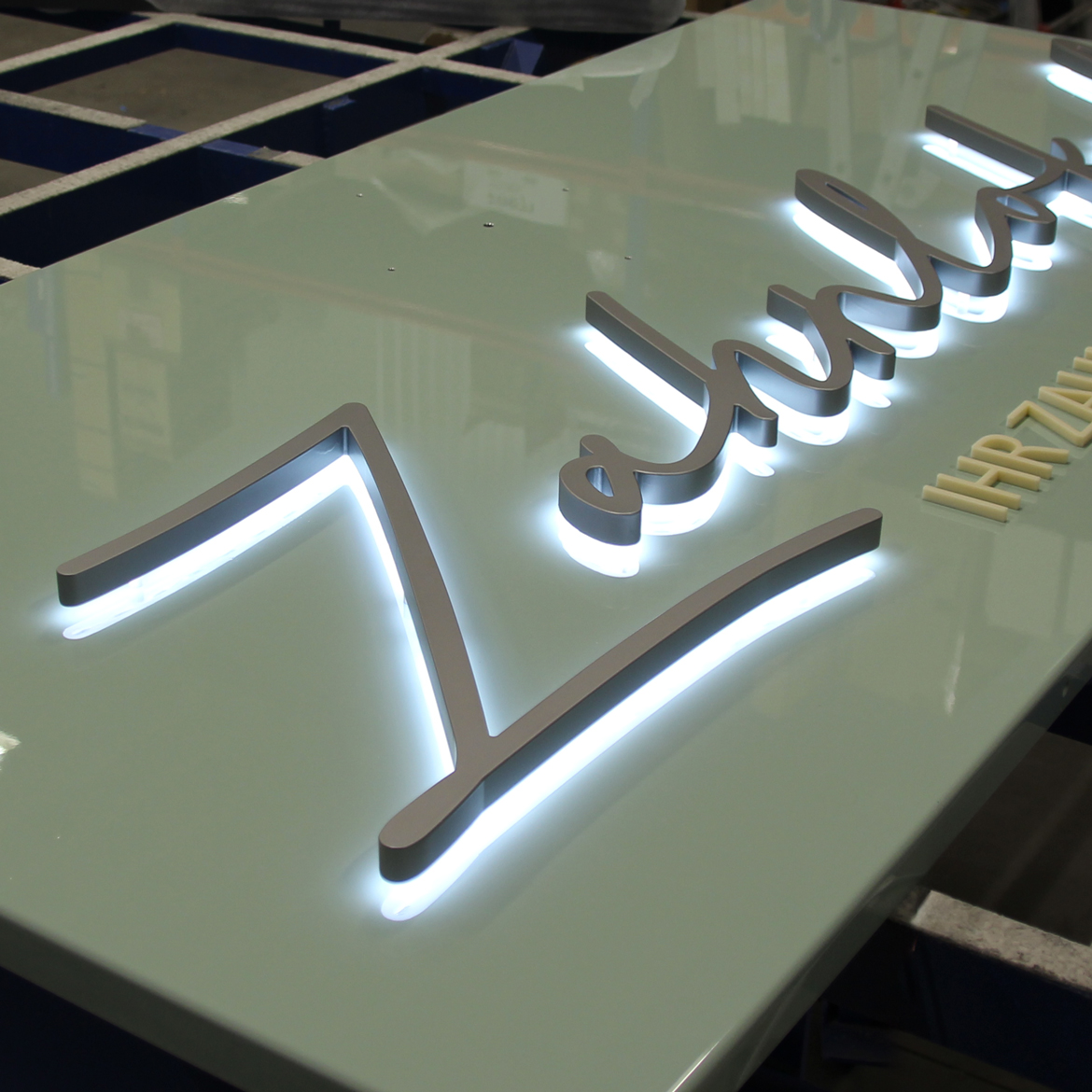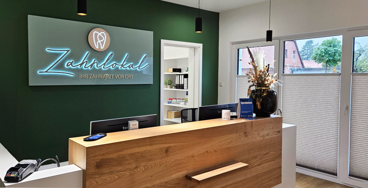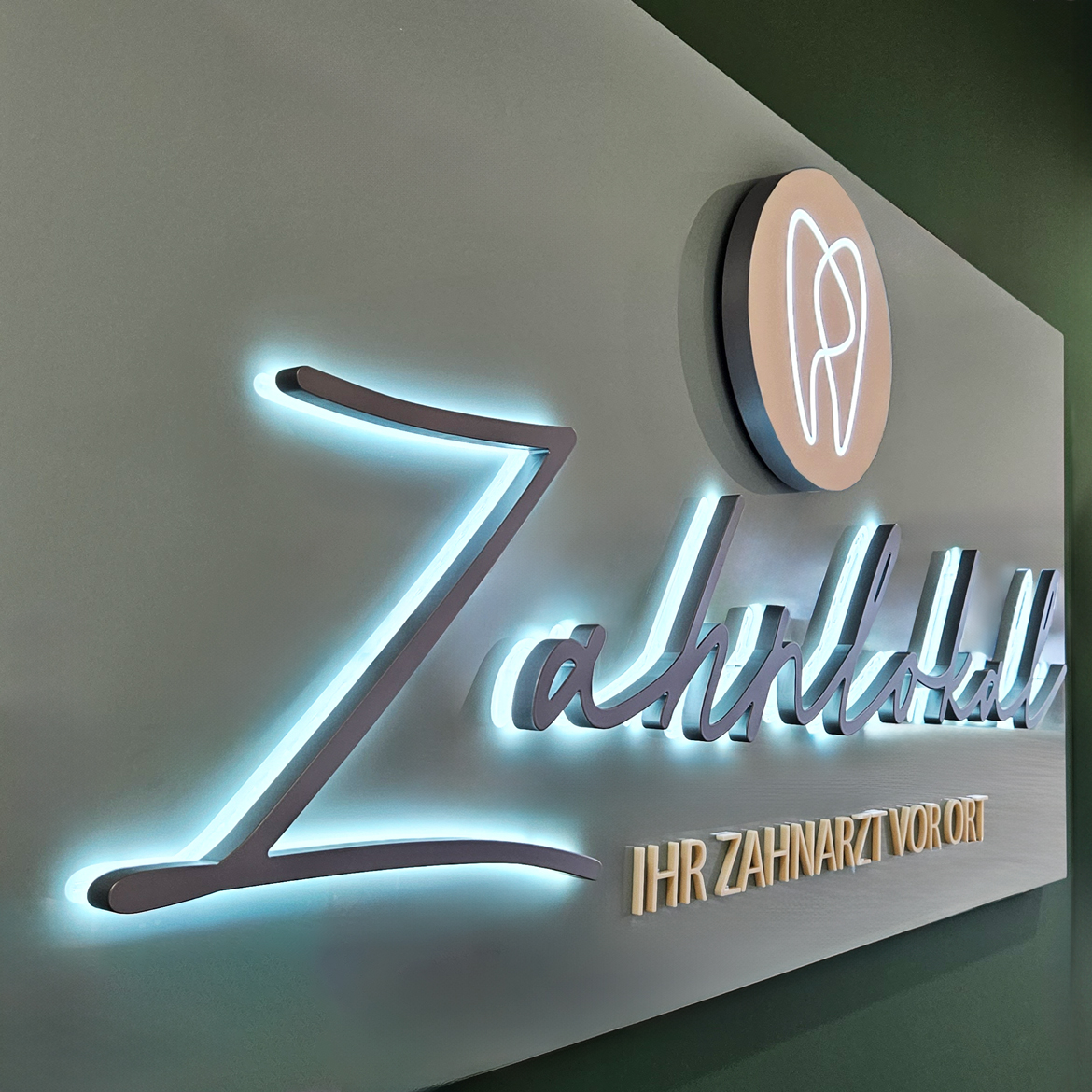 Wir, Fa. Infographik, haben den Empfangsbereich des Zahnlokals mit einem Wandtransparent ausgestattet, das innovative LED-Technik mit hochwertigem Vollacrylglas kombiniert. Durch die ausgefeilte LED-Technik lassen sich selbst schmale Buchstabenstege problemlos ausleuchten. Der leuchtende Schriftzug „Zahnlokal“ besteht aus Vollacrylglas und erzeugt einen Schatten-Effekt durch die Rückleuchtung. Ein weiteres Highlight ist das beleuchtete Emblem in Form eines Zahns. Mit einem Durchmesser von 32 cm dient es als Frontleuchter. Die Seite und Rückseite des Emblems sind jedoch lichtdicht, so dass der Fokus ganz auf dem leuchtenden Zahn liegt. Das Wandtransparent wird durch einen Claim ohne Beleuchtung abgerundet: „IHR ZAHNARZT VOR ORT“. Einfach schön und elegant!