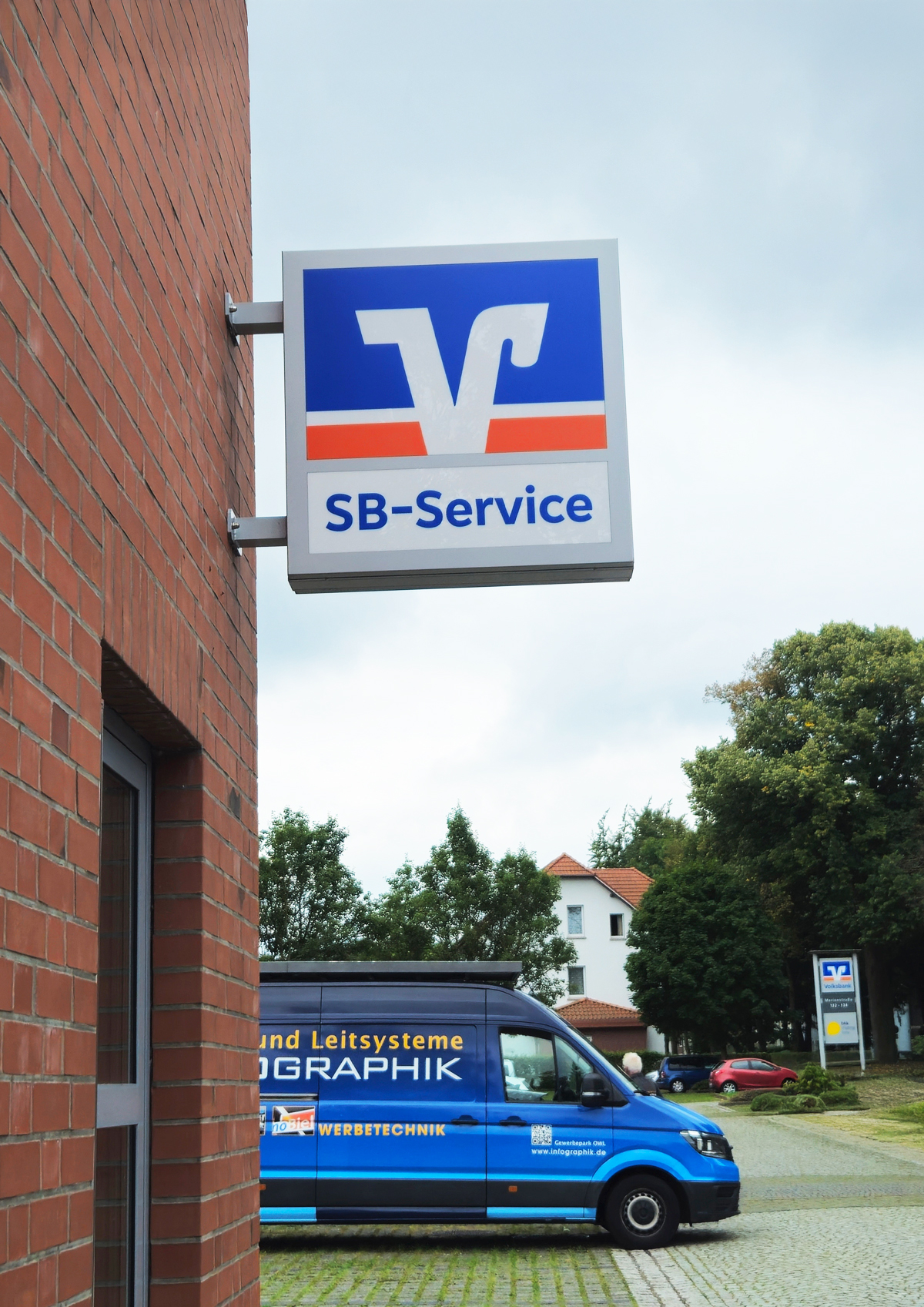 In der Filiale Minden wurde ein 3D-Schriftzug als Frontleuchter für die Fassade produziert. Zudem erhielt der Ausstecker eine neue Verglasung, und die Beschriftung wurde als Folienplot im Corporate Design umgesetzt.