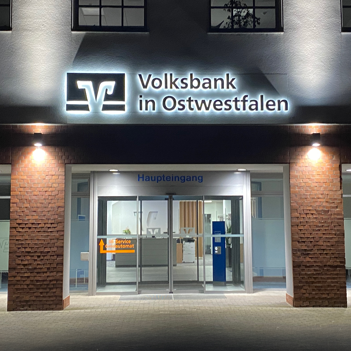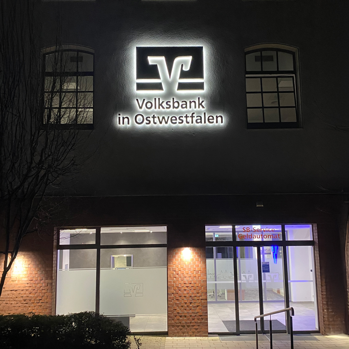 Für die Filialen in Herford haben wir drei hochwertige 3D-Leuchtschriftzüge gestaltet und gefertigt – stilvolle Rückleuchter mit dem „Logo“ sowie der Schrift „Volksbank in Ostwestfalen“.