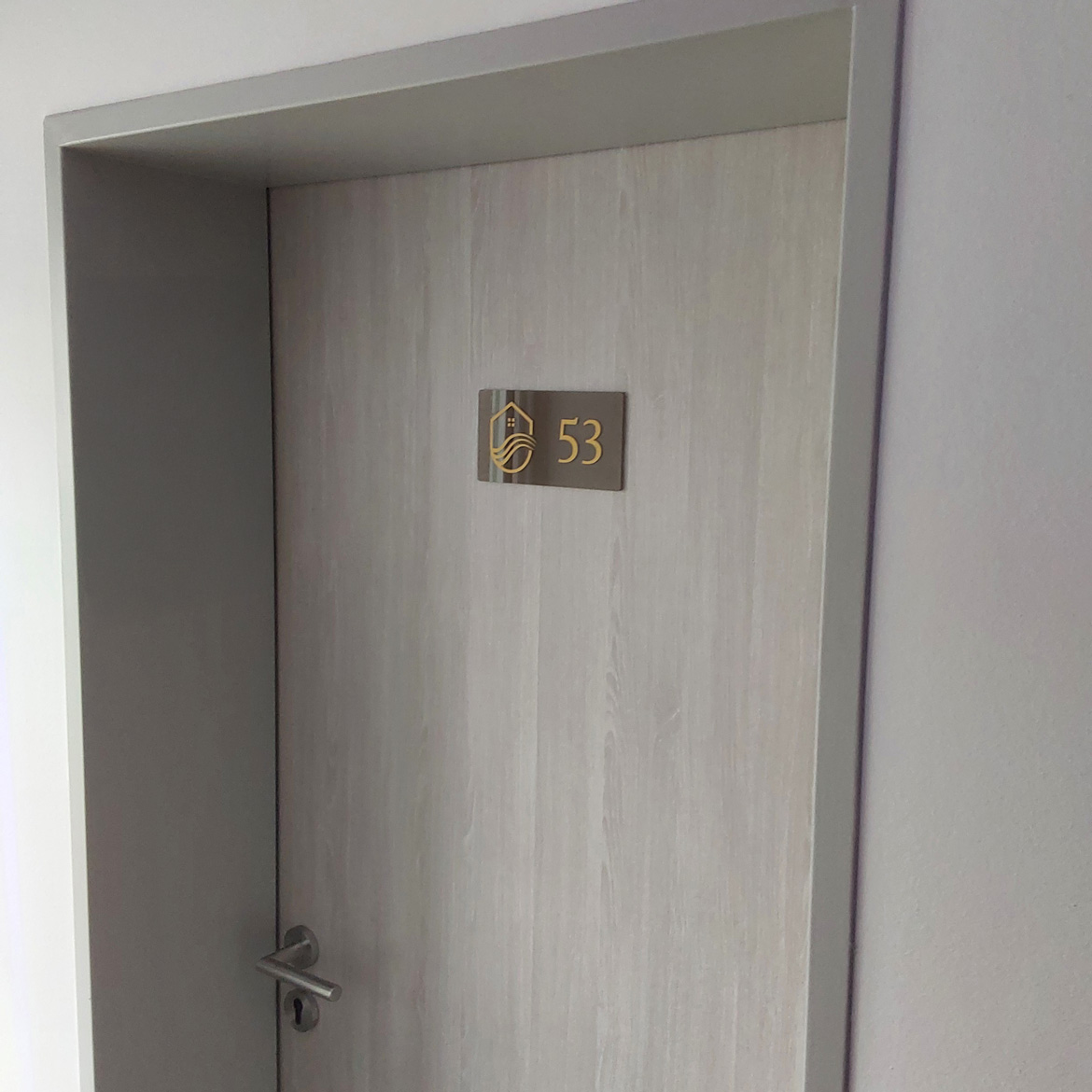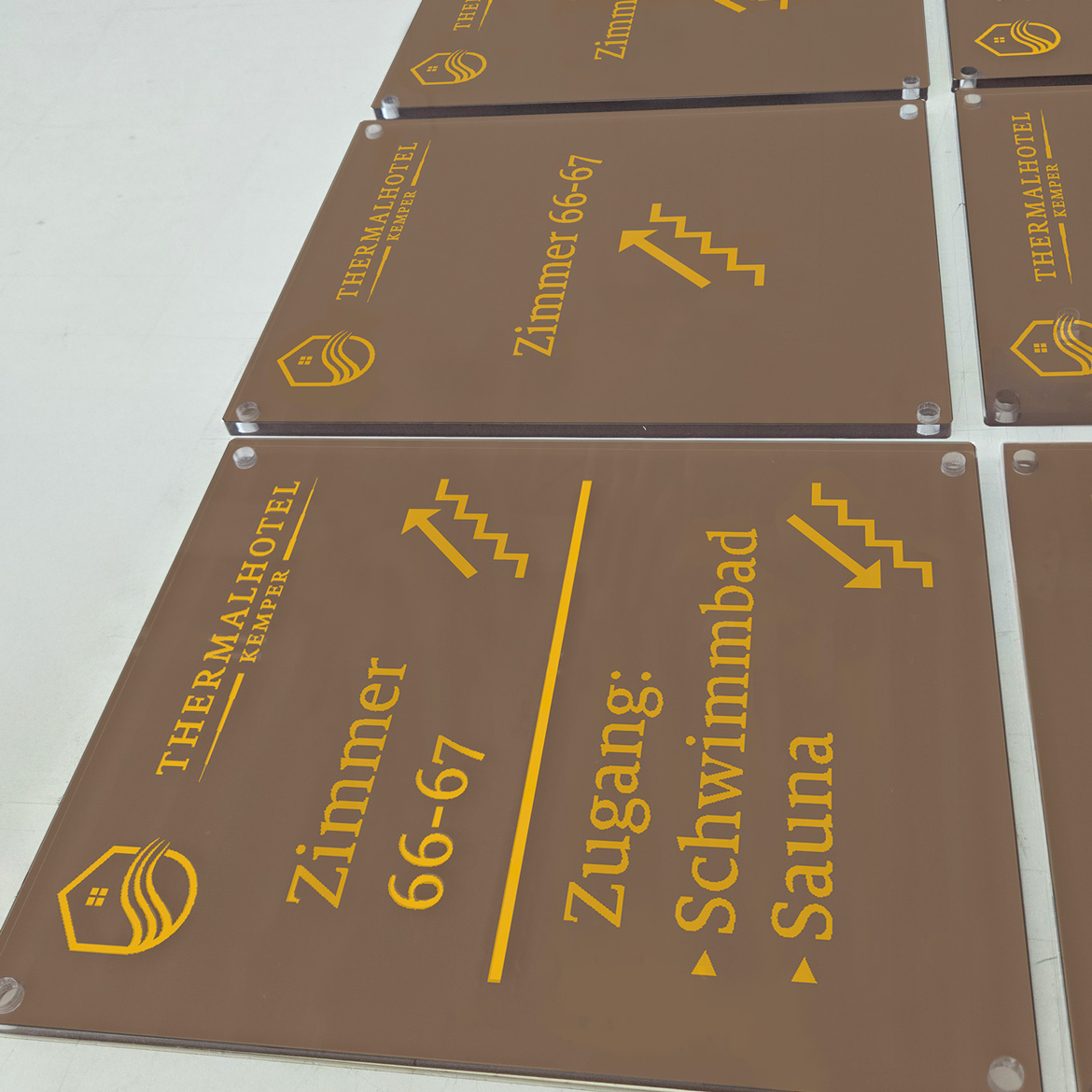 Auch im Innenbereich des Hotels realisierten wir eine klare und elegante Beschilderung. Mit stilvollen Türschildern, Etagenschildern und einer dezenten Scheibenbeklebung wurde eine dezente und dennoch wirkungsvolle Wegweisung geschaffen – abgestimmt auf das bestehende Gestaltungskonzept und in hochwertiger Ausführung gefertigt und montiert – für eine klare, unkomplizierte Orientierung im gesamten Innenbereich.