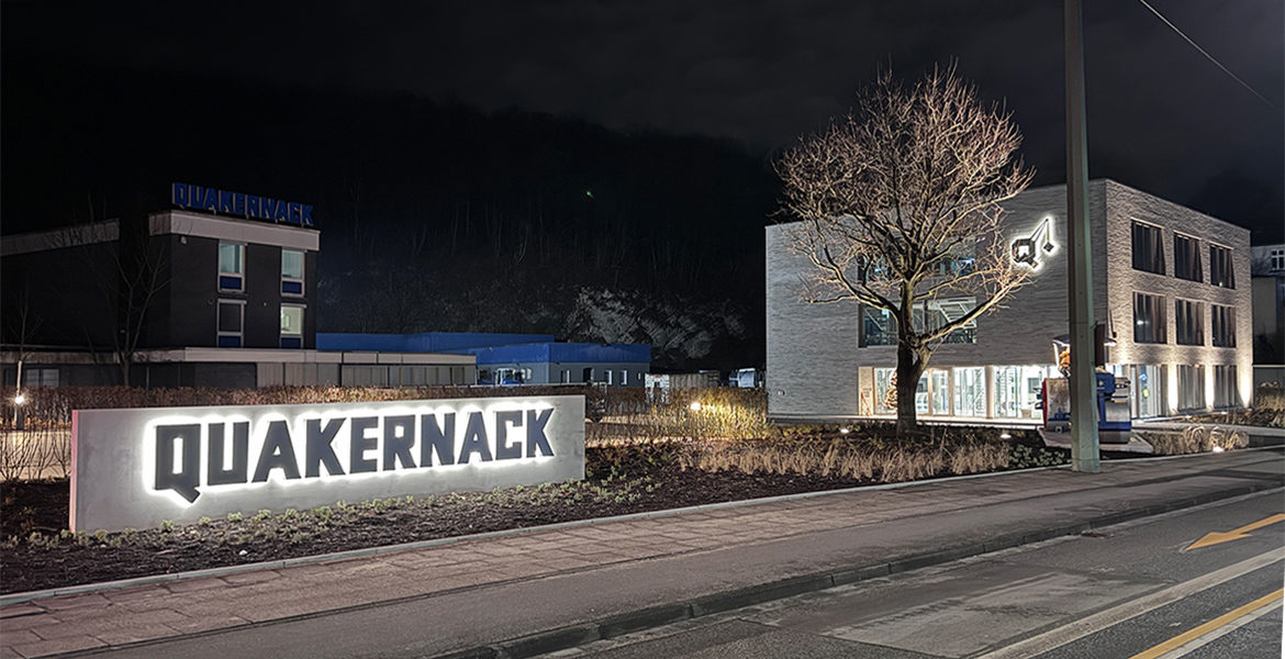 Für die Ludwig Möllmann GmbH & Co. KG realisierten wir zwei auffällige Rückleuchter-Projekte: den 3D-Leuchtschriftzug „QUAKERNACK“ mit Maßen 6.333 × 934/800 mm auf der Mauer und den Rückleuchter LOGO „Q“ mit einem Durchmesser von ca. 2 m an der Fassade.