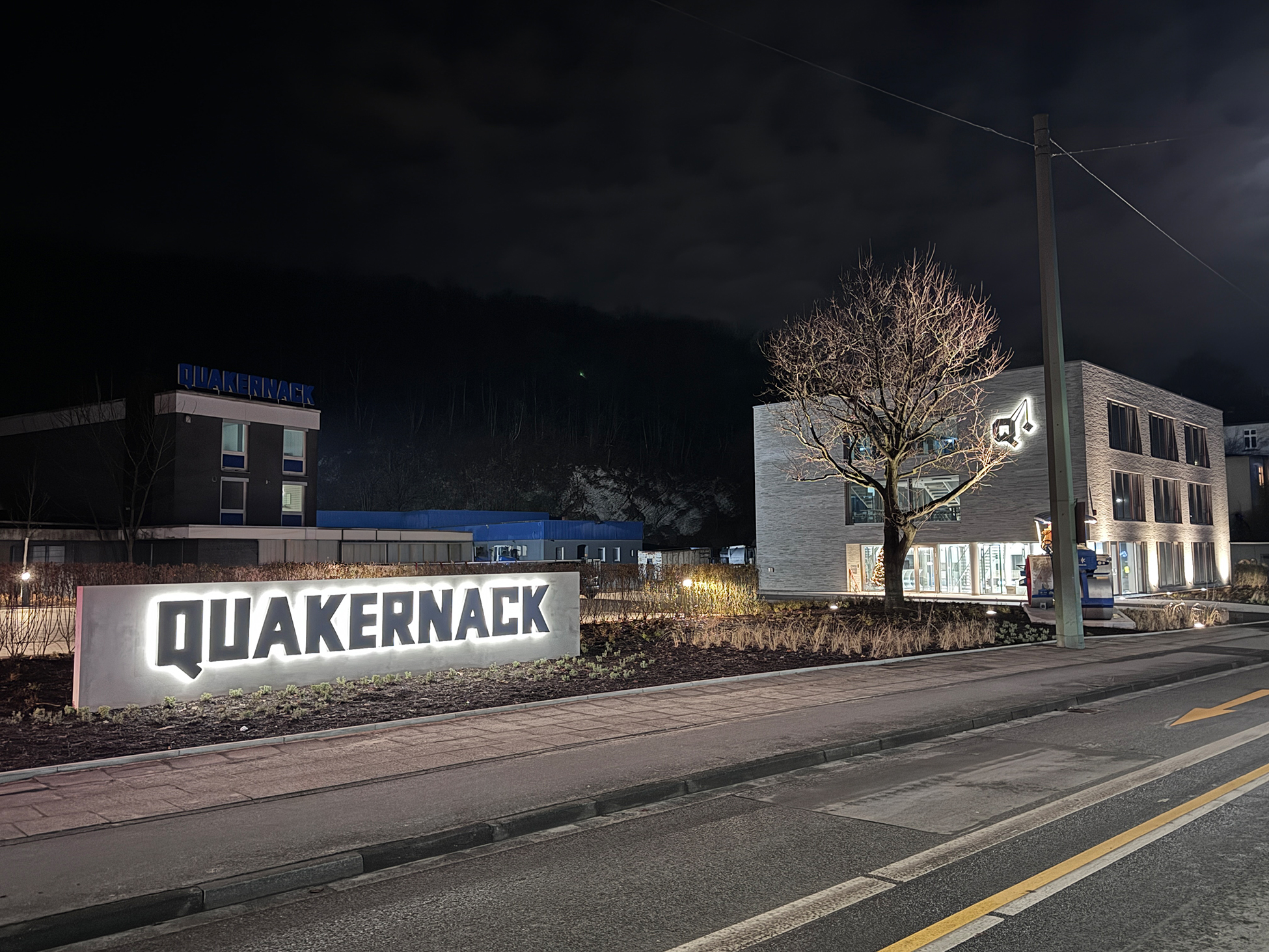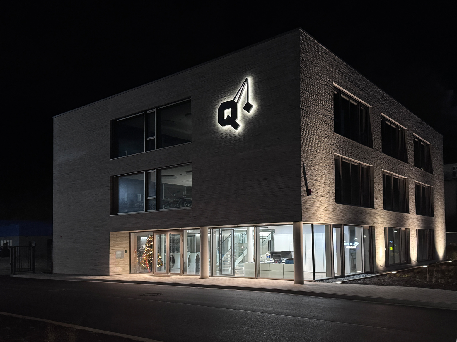 Für die Ludwig Möllmann GmbH & Co. KG realisierten wir zwei auffällige Rückleuchter-Projekte: den 3D-Leuchtschriftzug „QUAKERNACK“ mit Maßen 6.333 × 934/800 mm auf der Mauer und den Rückleuchter LOGO „Q“ mit einem Durchmesser von ca. 2 m an der Fassade.